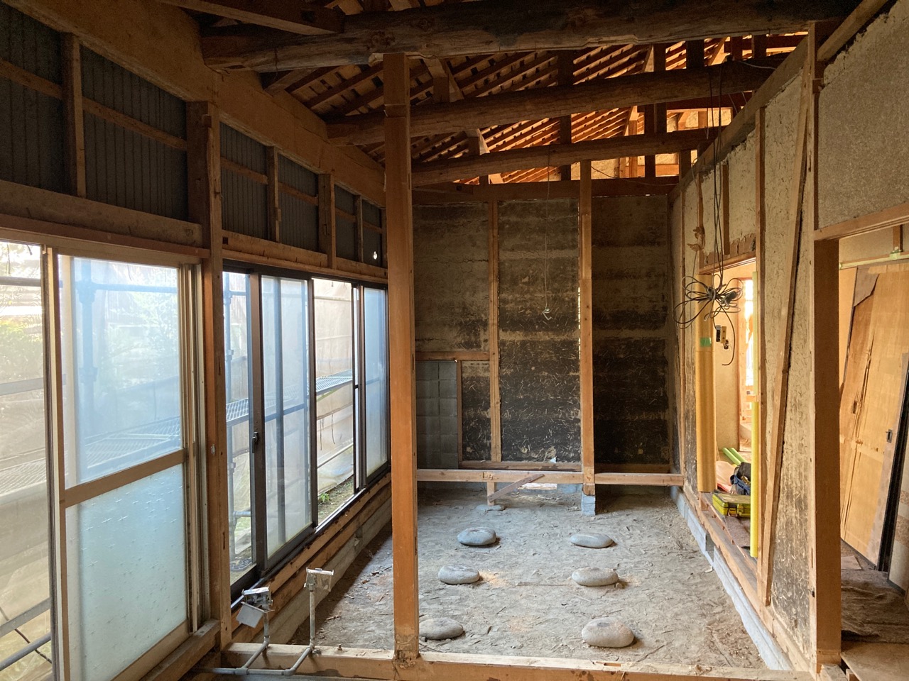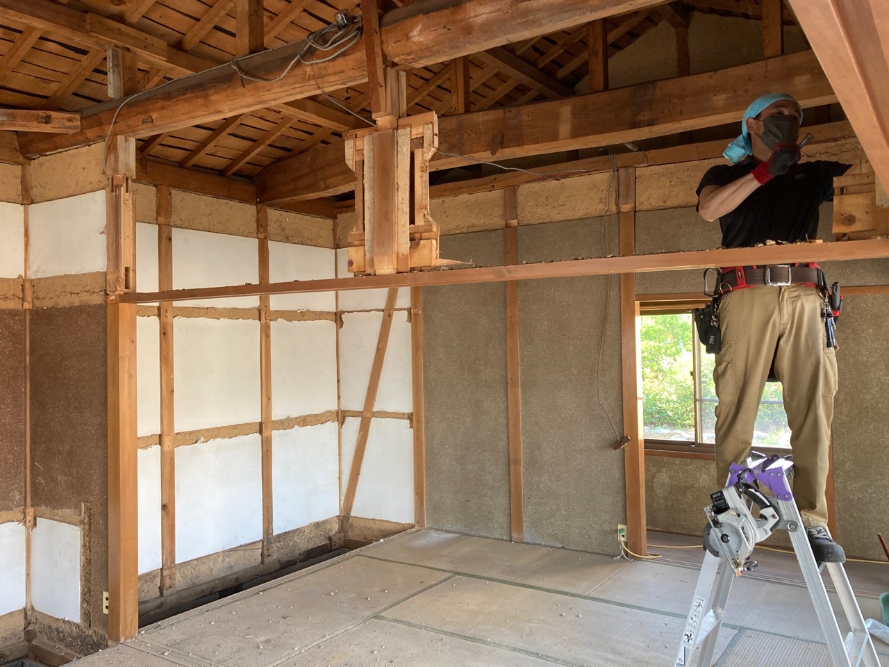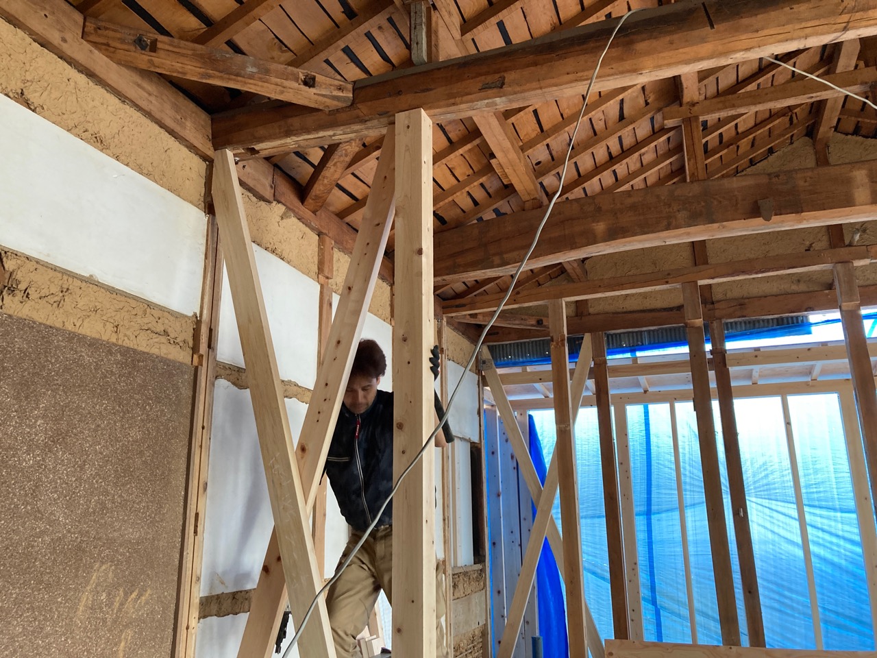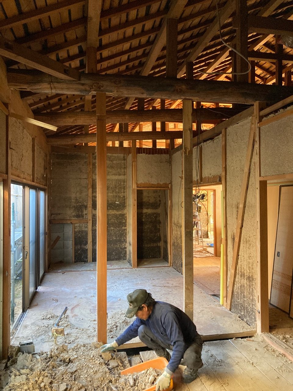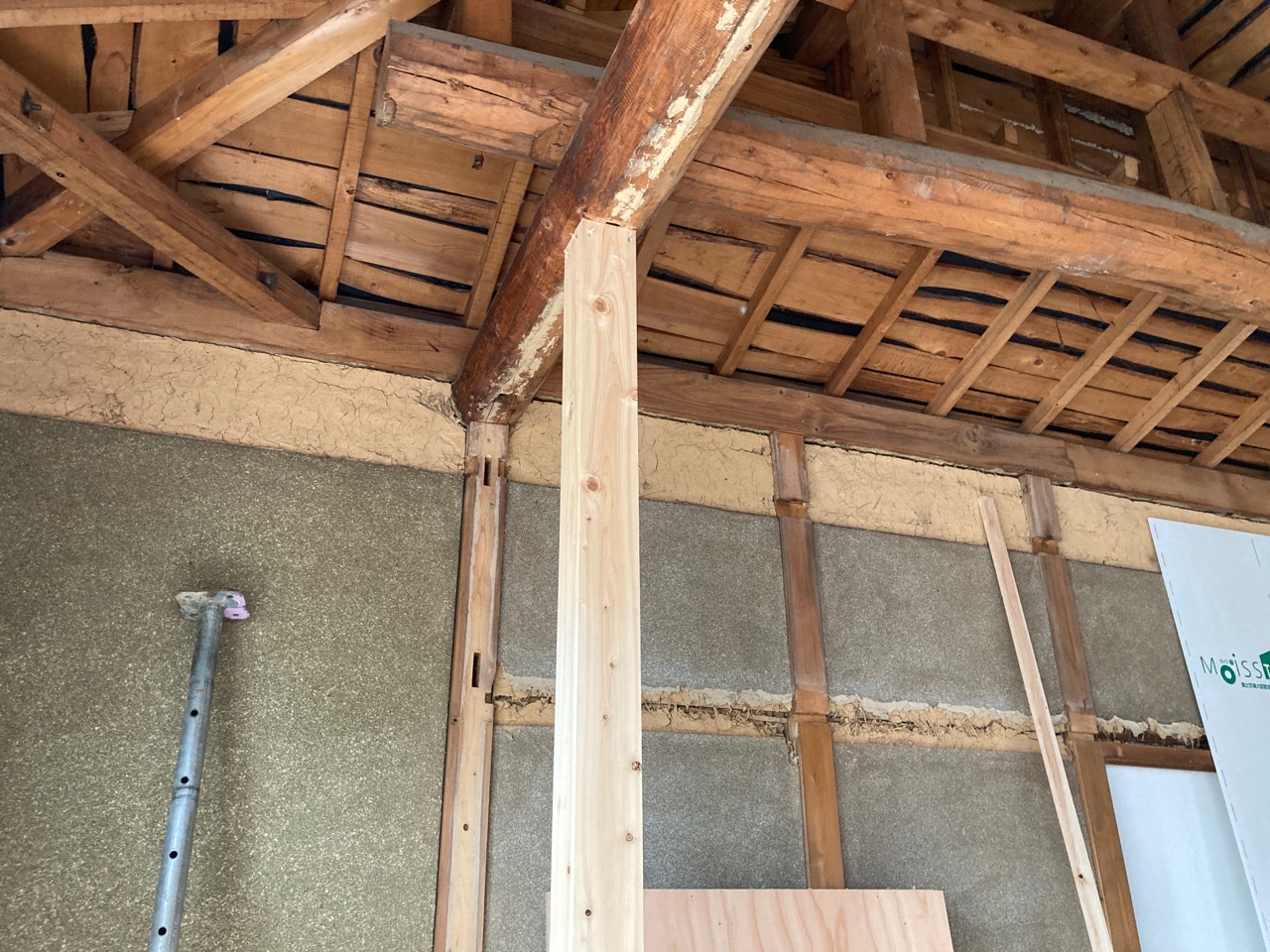 続々と解体工事が進んでいます。土壁は温熱環境上できるだけ残したいので、解体する部分は必要最小限としています。解体をした際に構造的、間取り的に変更したい柱や、傷んでいる柱などはこの際に取り替えていきます。