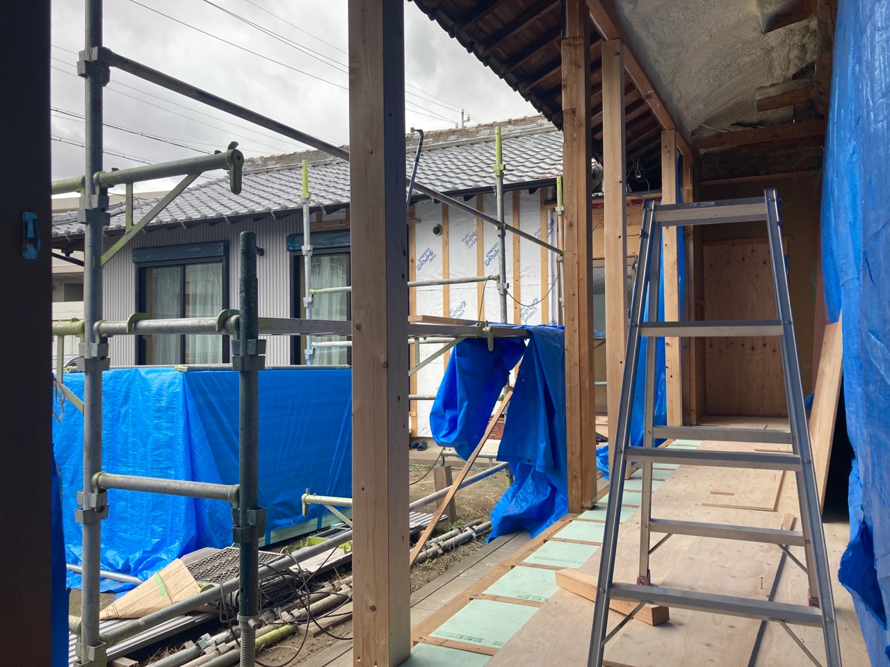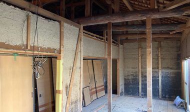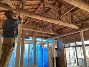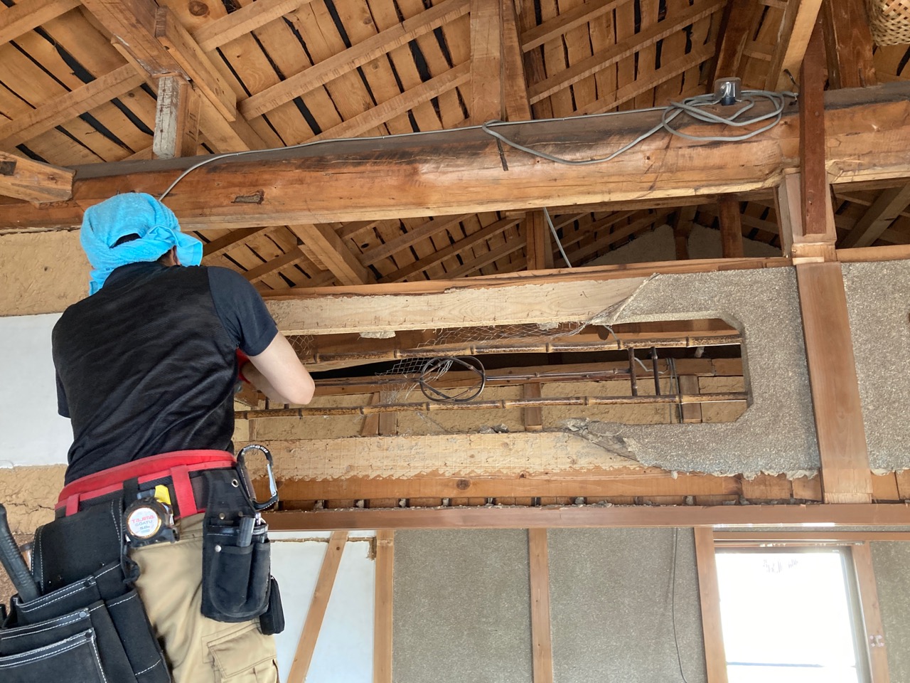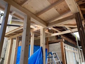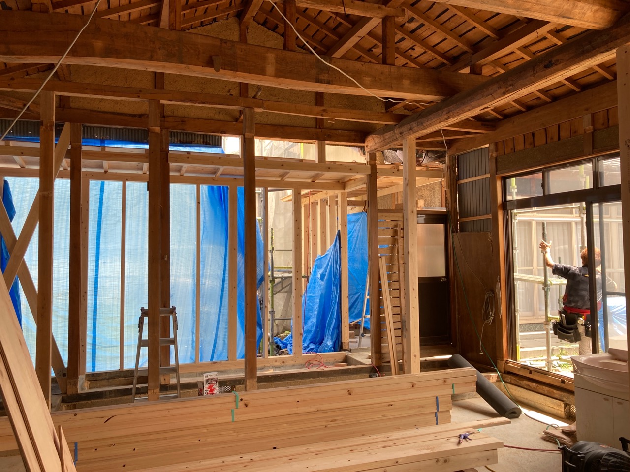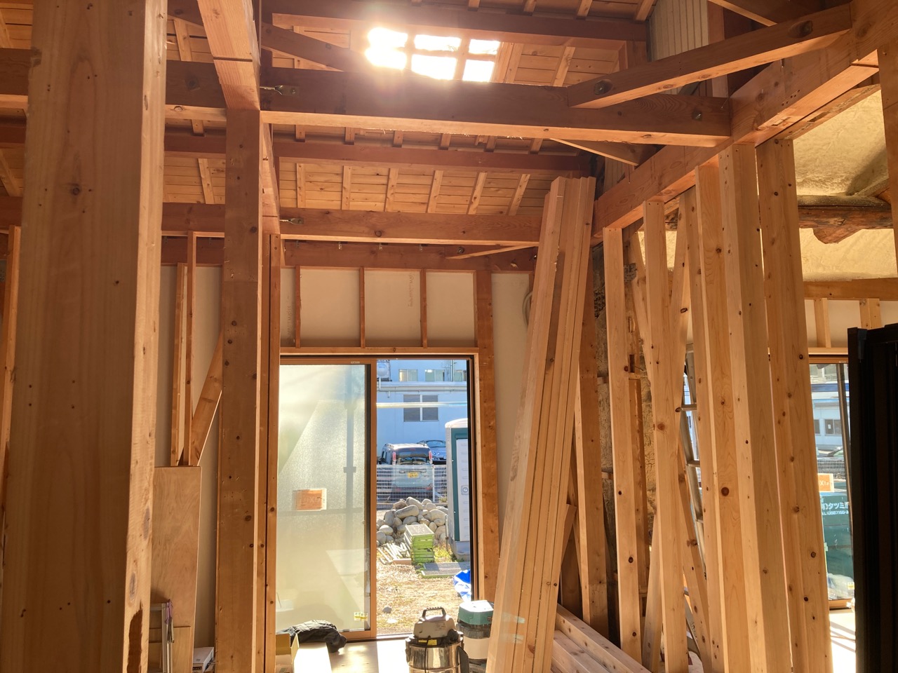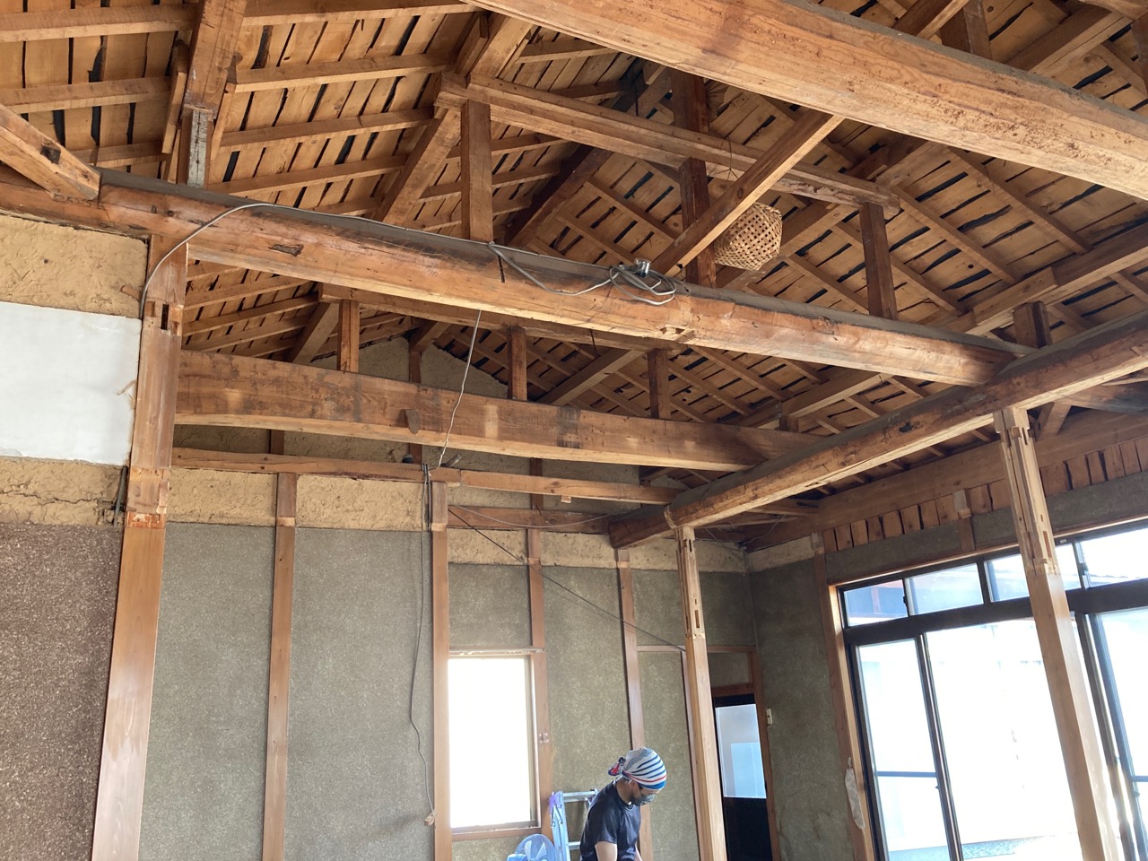 続々と解体工事が進んでいます。土壁は温熱環境上できるだけ残したいので、解体する部分は必要最小限としています。解体をした際に構造的、間取り的に変更したい柱や、傷んでいる柱などはこの際に取り替えていきます。