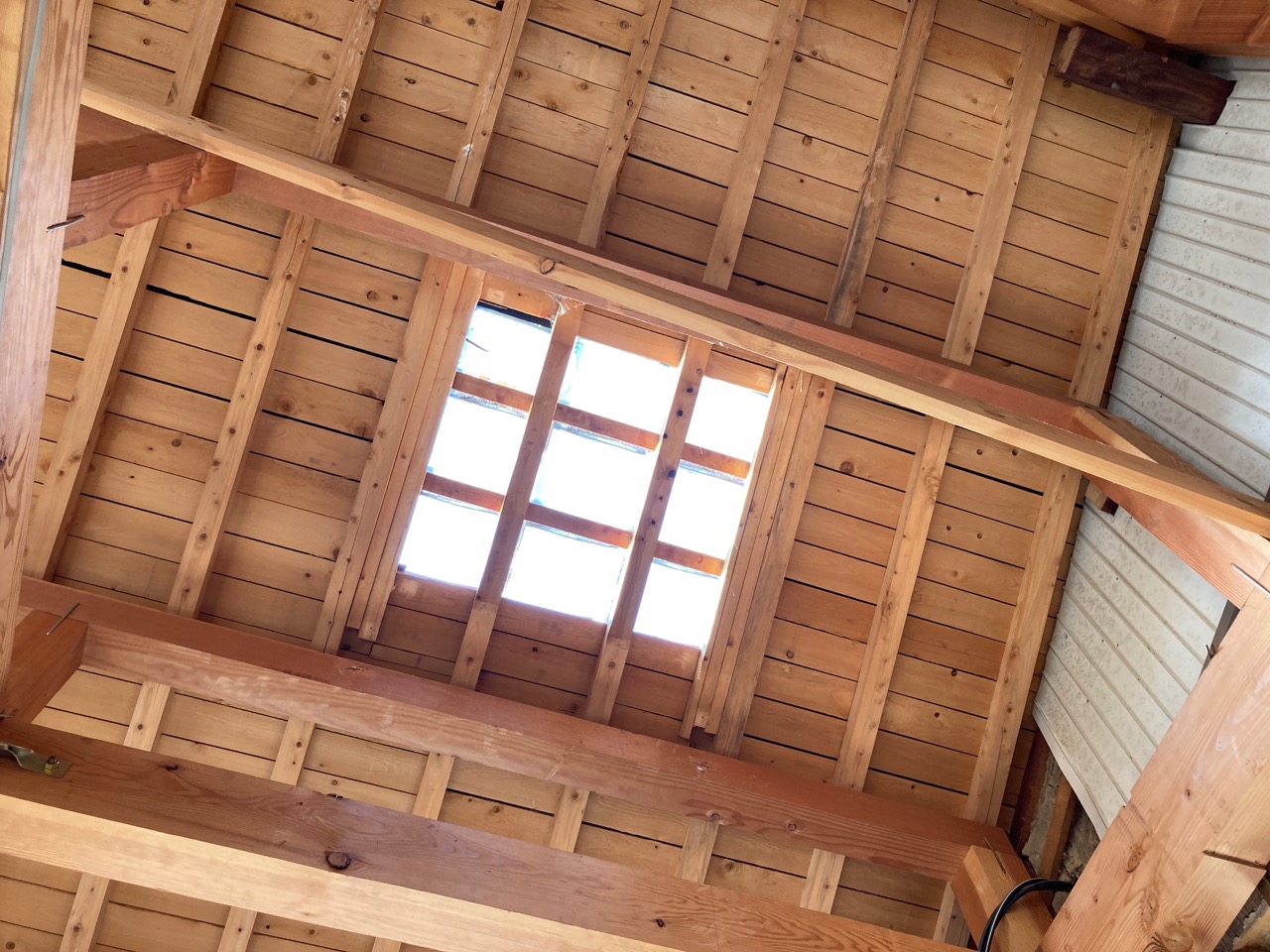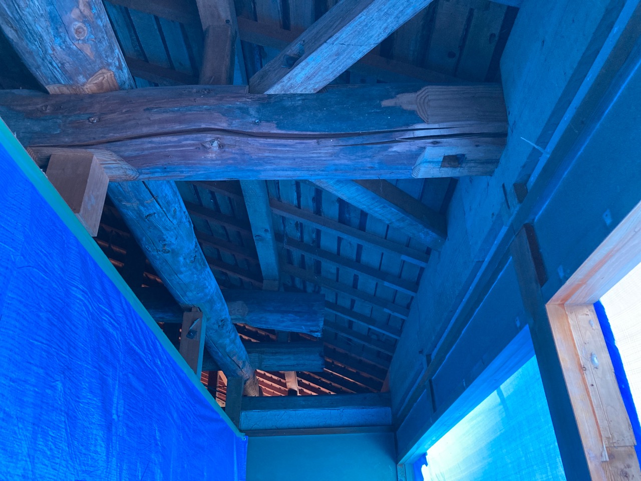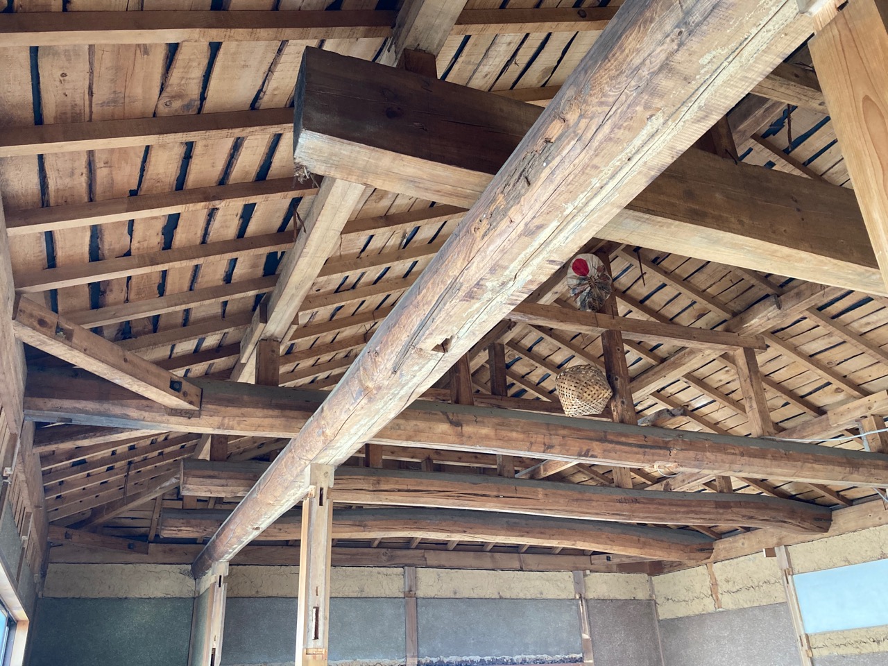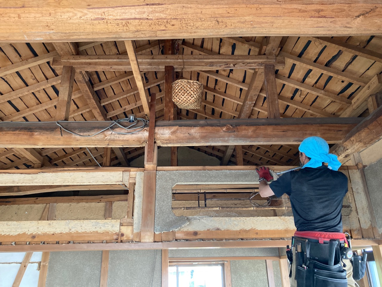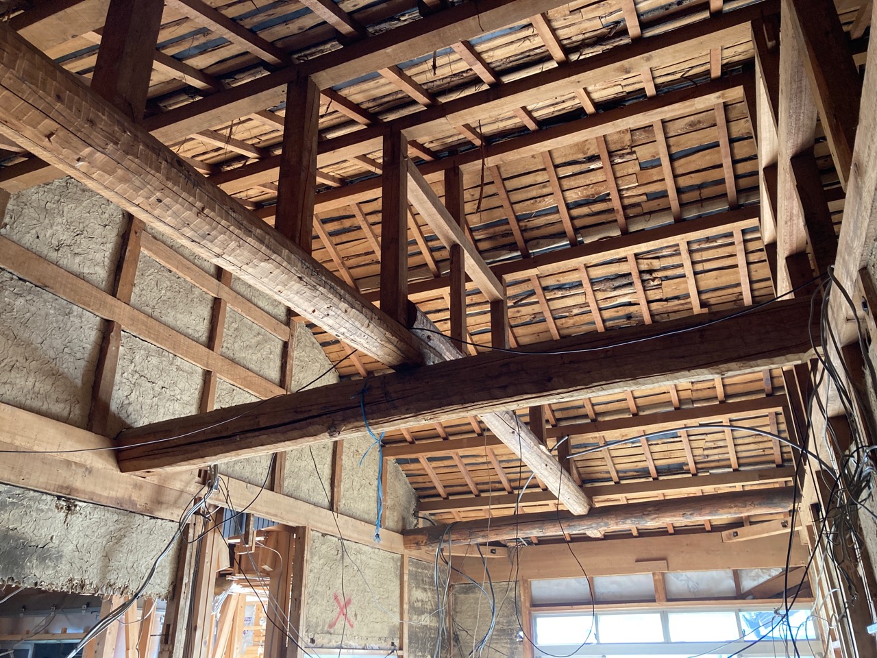 昨日残っていた天井もすべて解体され、小屋組みの全貌が見えてきました。旧い屋敷の軸組は耐力壁となる筋違いがほとんどいませんが、これだけ頑丈な丸太で小屋を組み、外壁に土壁の下地となる小舞を設置するため、ある程度の強度は感覚的にですが保持していたのではないかと思います。 それでも新基準には満たないため、今回のリフォームでは入れられるだけ耐力壁を入れていく計画をしています。