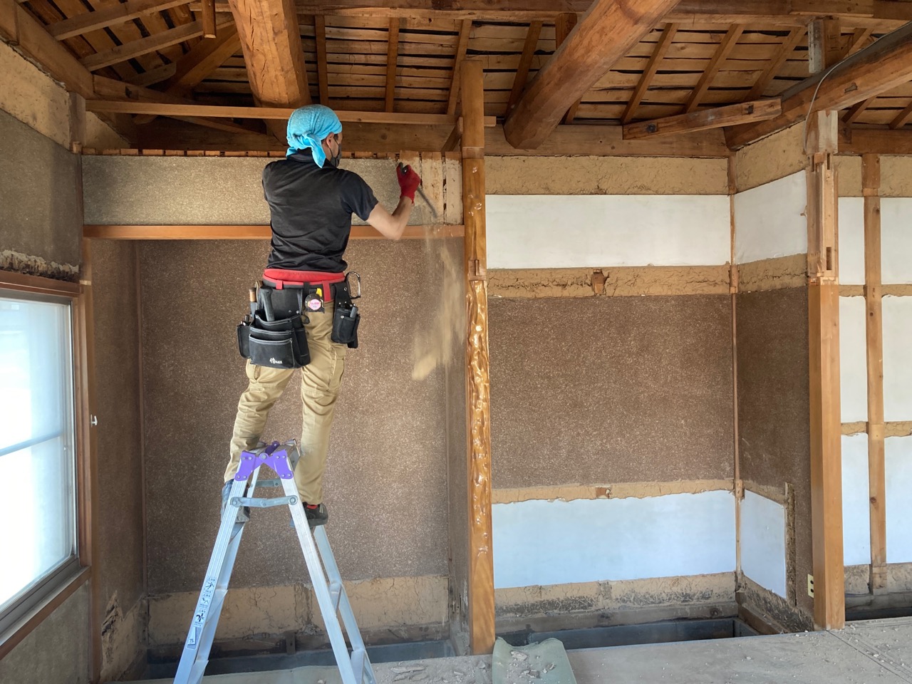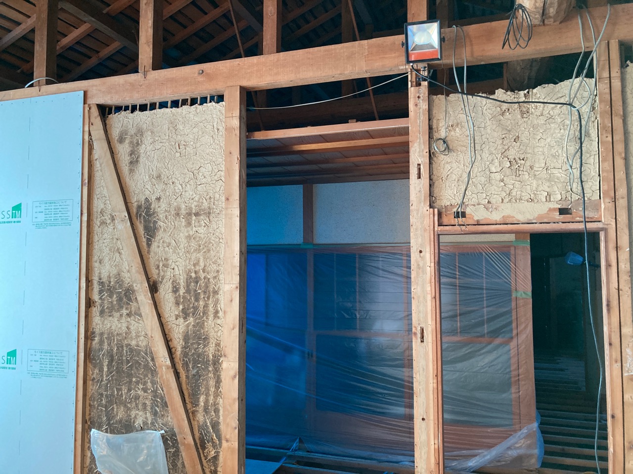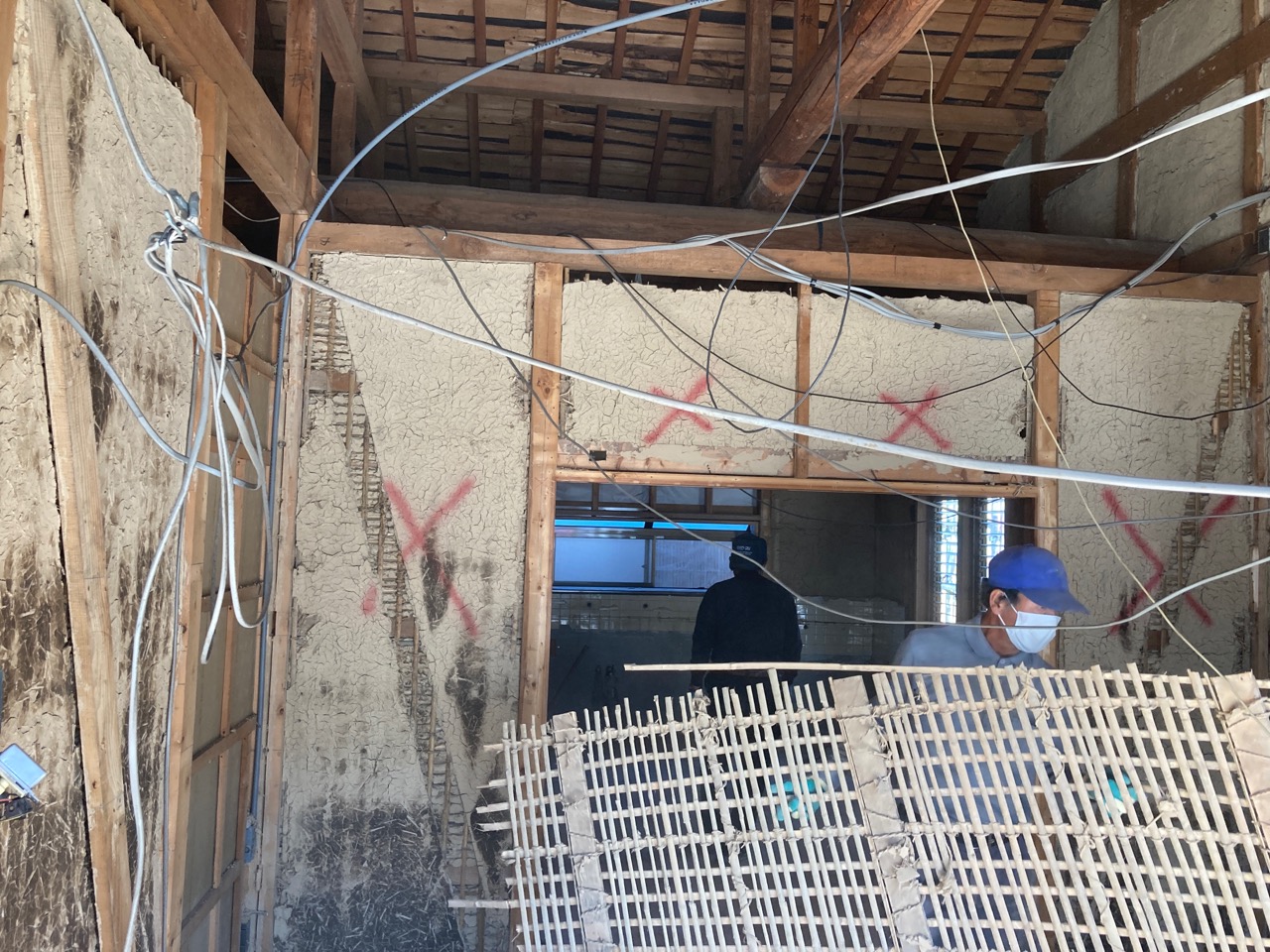 土壁とメタルラスをキレイに落とし、鴨居と下地材を切り落としました。今ではあまり使われる事の無くなった藁すさ入りの壁土。よく目にするのはこれらを保管しておいて再度練り、別の壁に塗り付ける、という光景です。