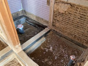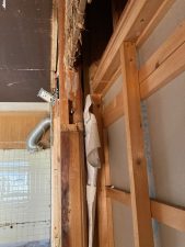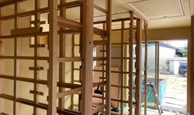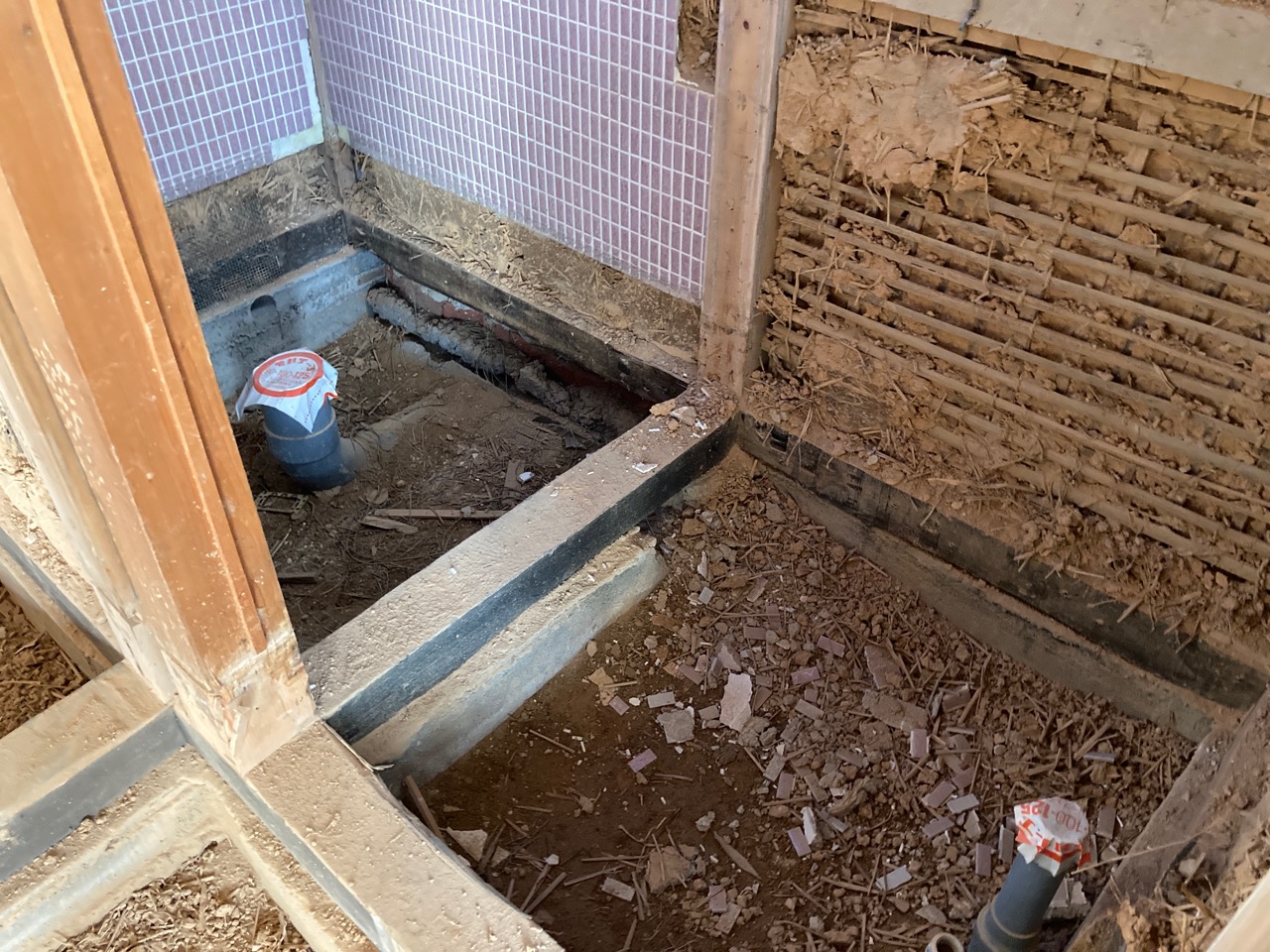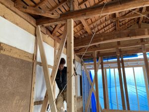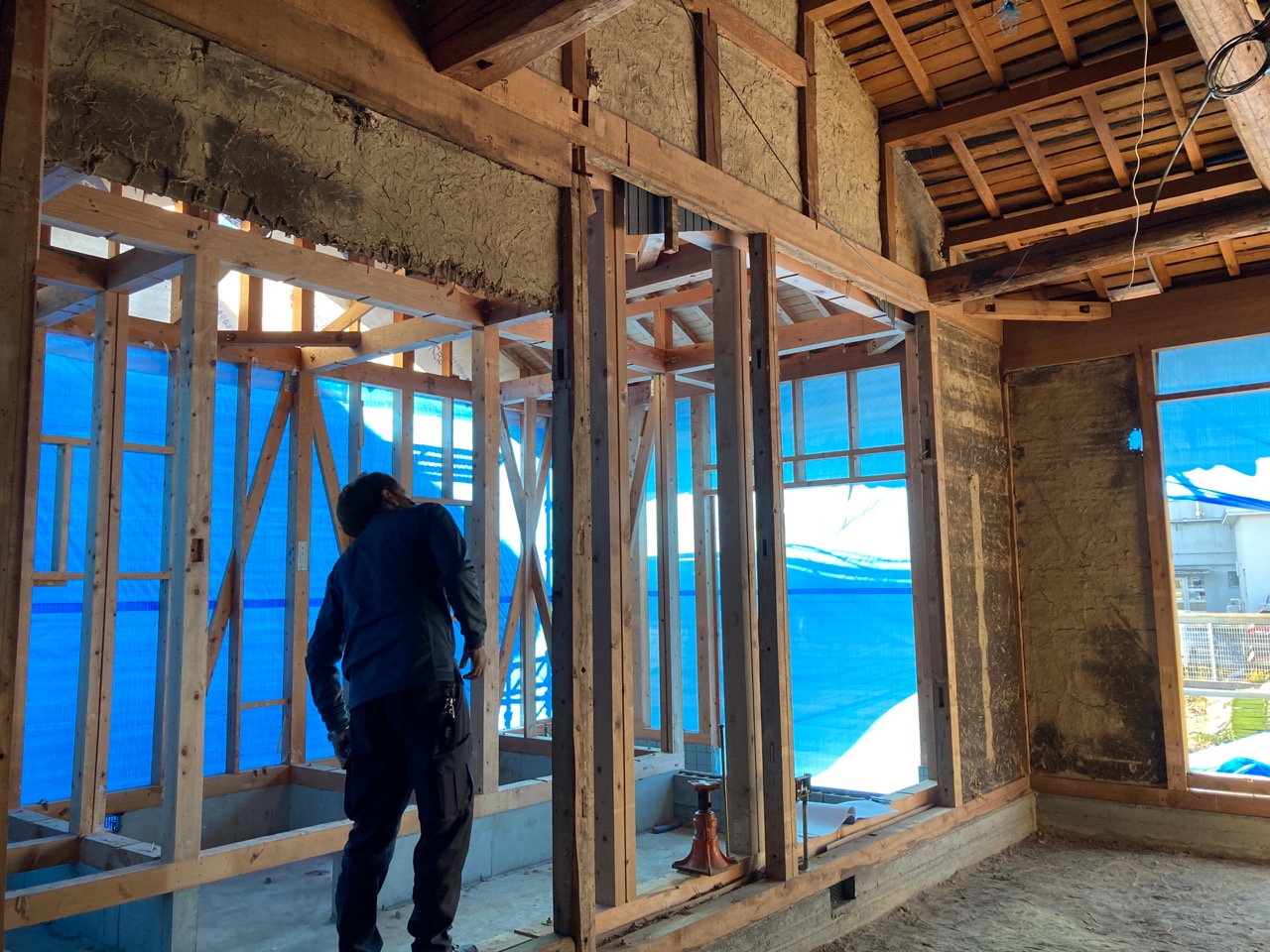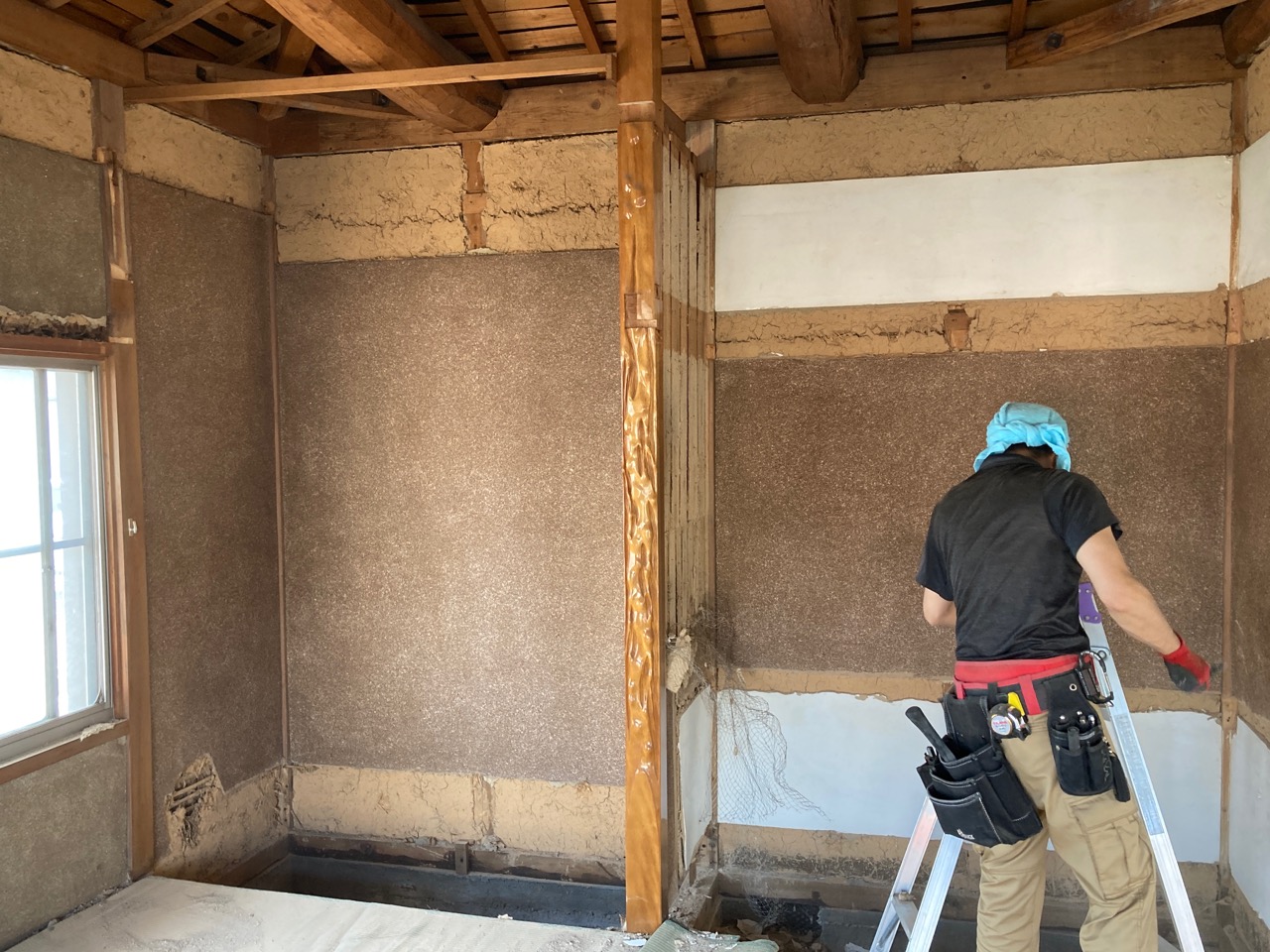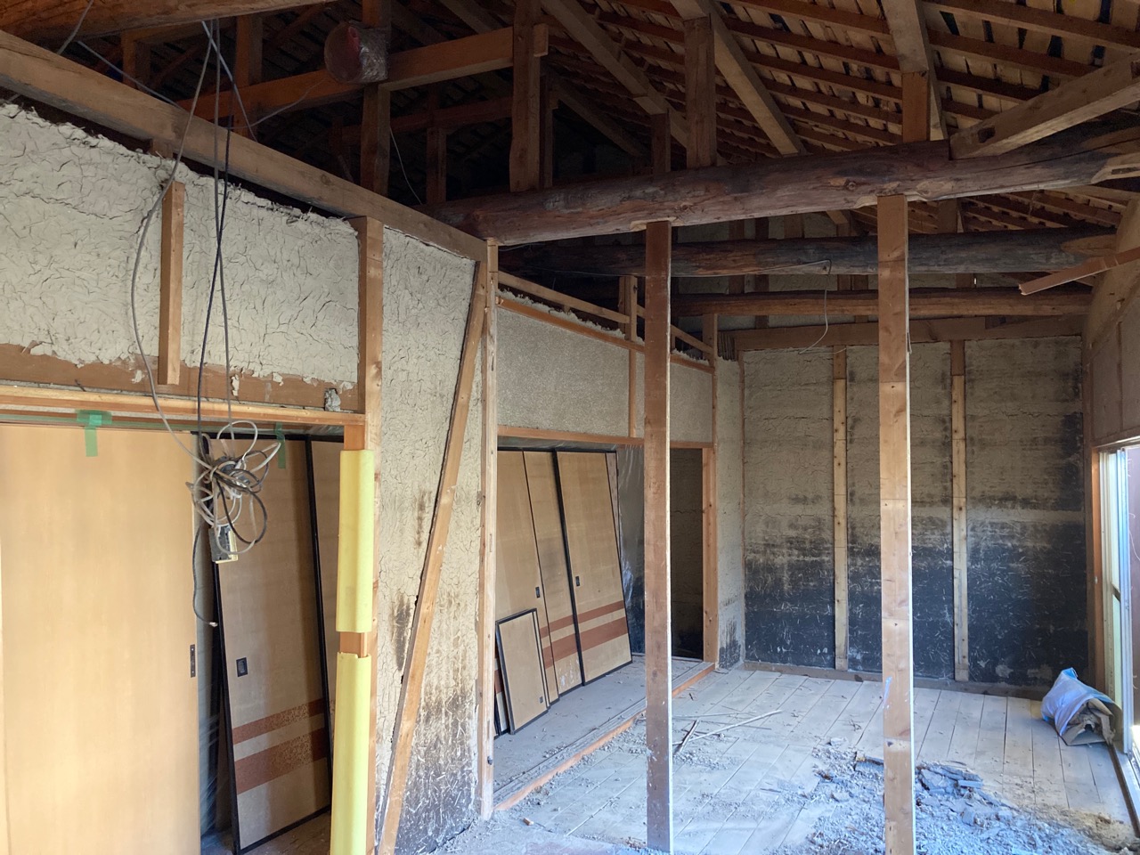 構造のみならず、仕上を解体しても断熱材のだの字も入っていませんでした。冬にはほとんど外にいるのと変わらないくらいの寒さであった事が予想されます。しいて言えば壁に土壁が塗られていることくらい。ミノワでは高気密高断熱住宅を建築していますが、さらに蓄熱効果を考慮して土壁工法を採る事が稀にあります。土壁の文化が廃れつつあるのに伴い、左官工事が高額化してくるためなかなか採用できないのですが、このようなリフォーム工事で土壁が残っているのはそういった意味では大変ありがたい事です。この土壁の外壁側に断熱材を施工し、断熱、蓄熱両方の効果が得られると新築以上の価値があるのではないでしょうか。