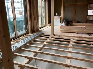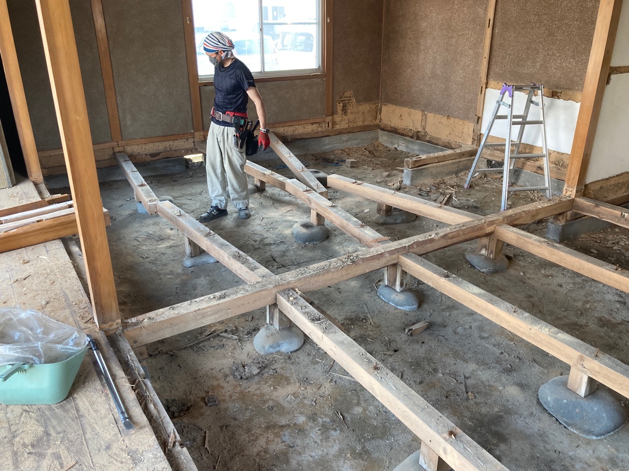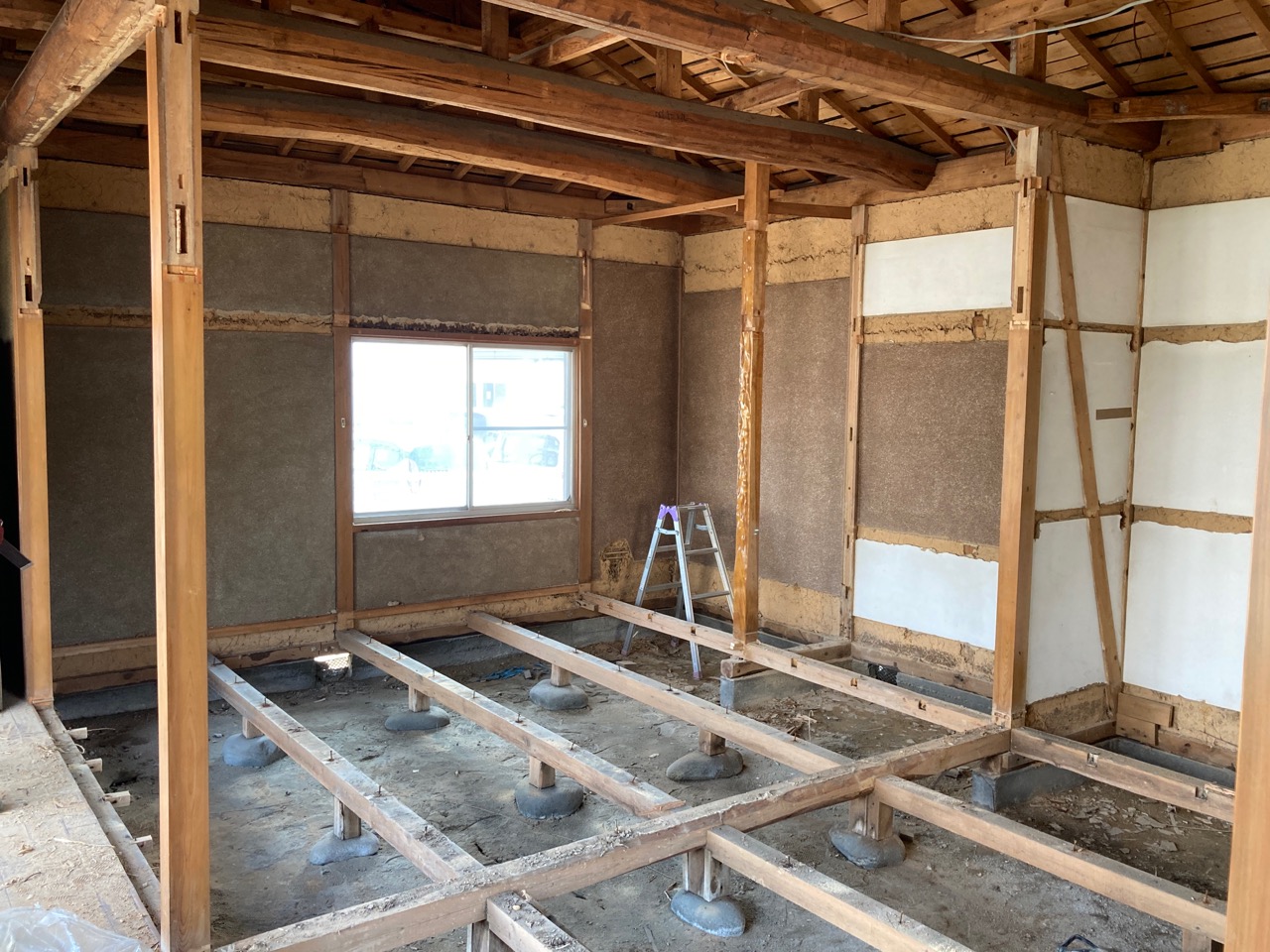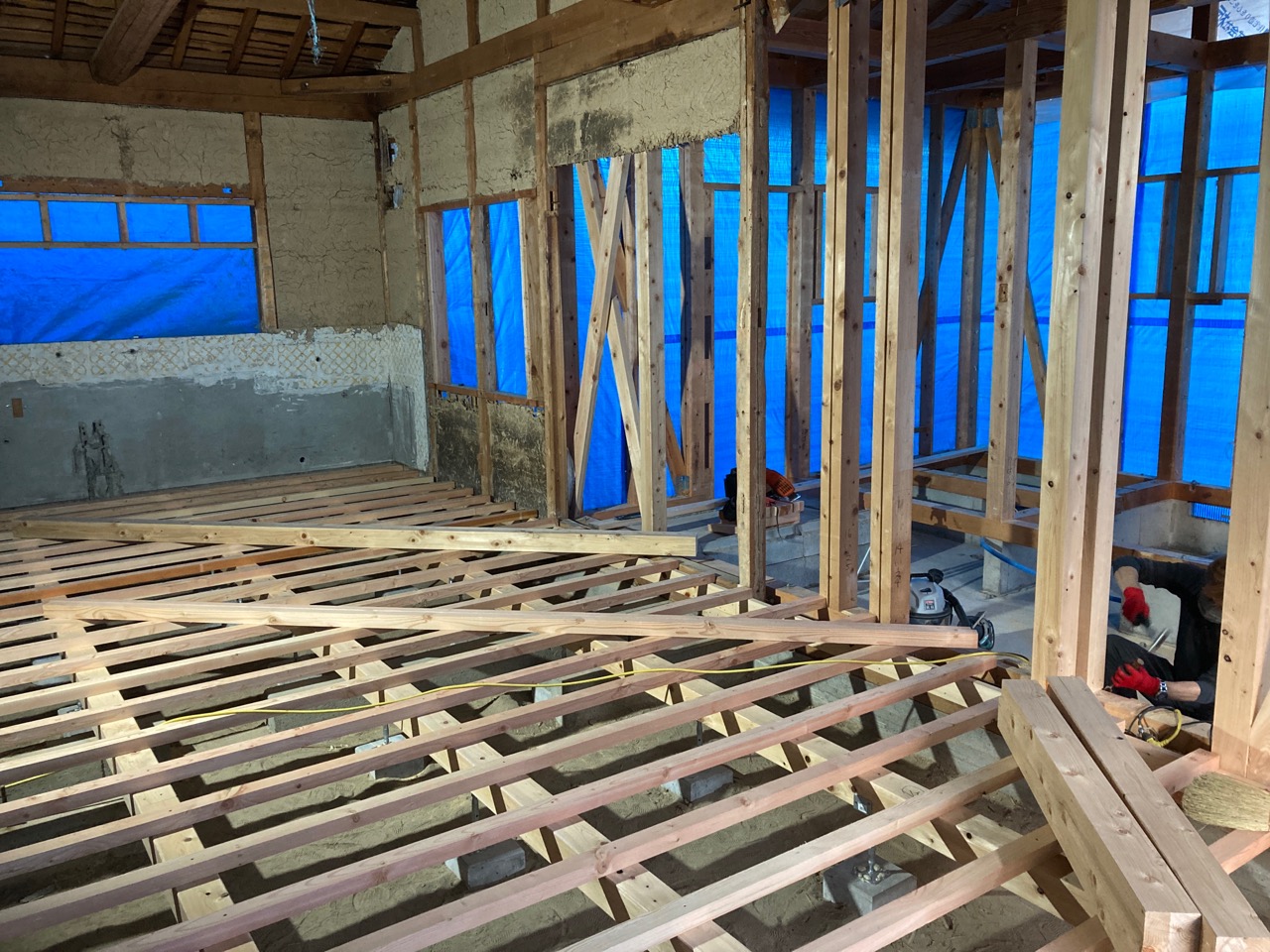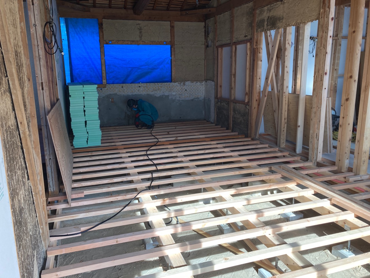 床下地ができあがってきました。元々の床レベルは主屋の床より20㎝低かったのですが、このリフォームを機に主屋と高さを合わせるバリアフリー計画としました。今まで見ていたよりも丸太の梁が随分近く感じるようになりました。床下地は根太工法として、根太間断熱を施します。