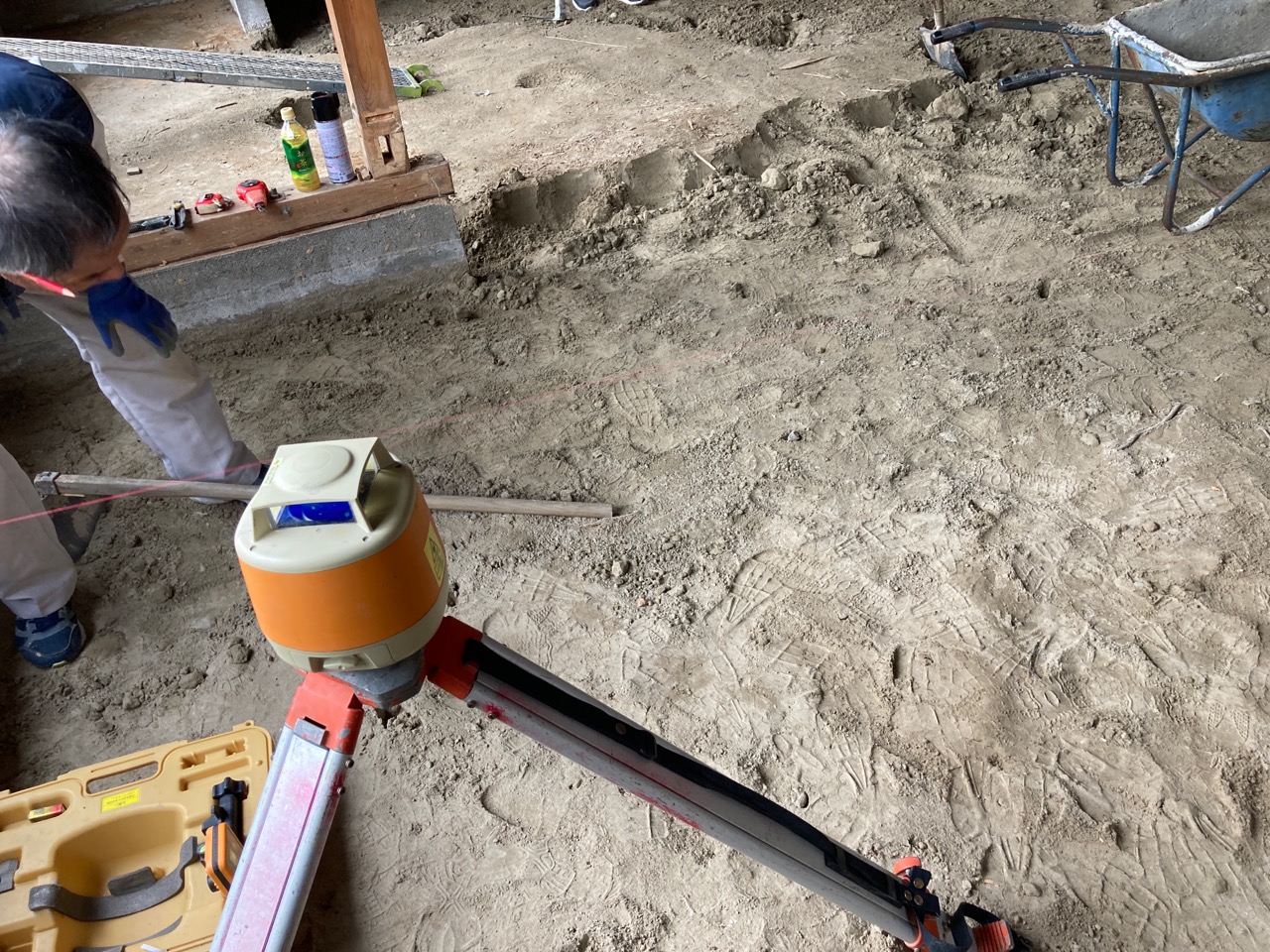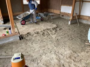 古い床組みを取り払い、石場建ての束石を取り去り、土を掘っていきます。土からの湿気が上がり、床組みに影響を与えないように防湿コンクリートを一面に敷設する計画です。特に離れの方は主屋より床レベルが下がっているので、コンクリートの厚みを確保するために土を掘っていくのです。