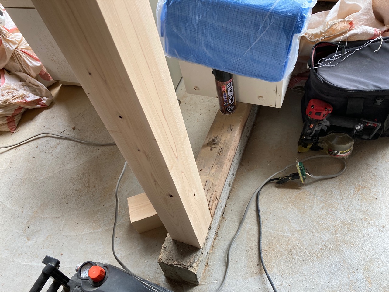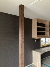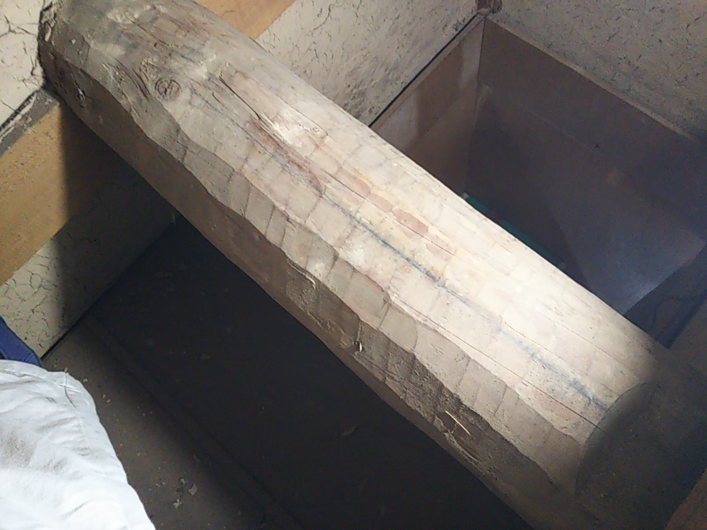 作業室の一角に構造上丸太の梁を支えるための柱を建てました。屋根の加工の都合、部屋の端から1mほど離れた場所に建っているので、何に使えるところでもない場所です。ここに無為に建ててクロスで囲った柱が1本あっても味気ないので化粧柱に改良してみる事にしました。