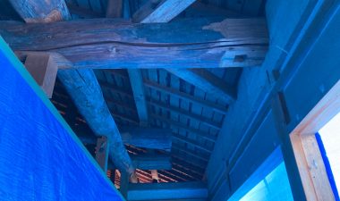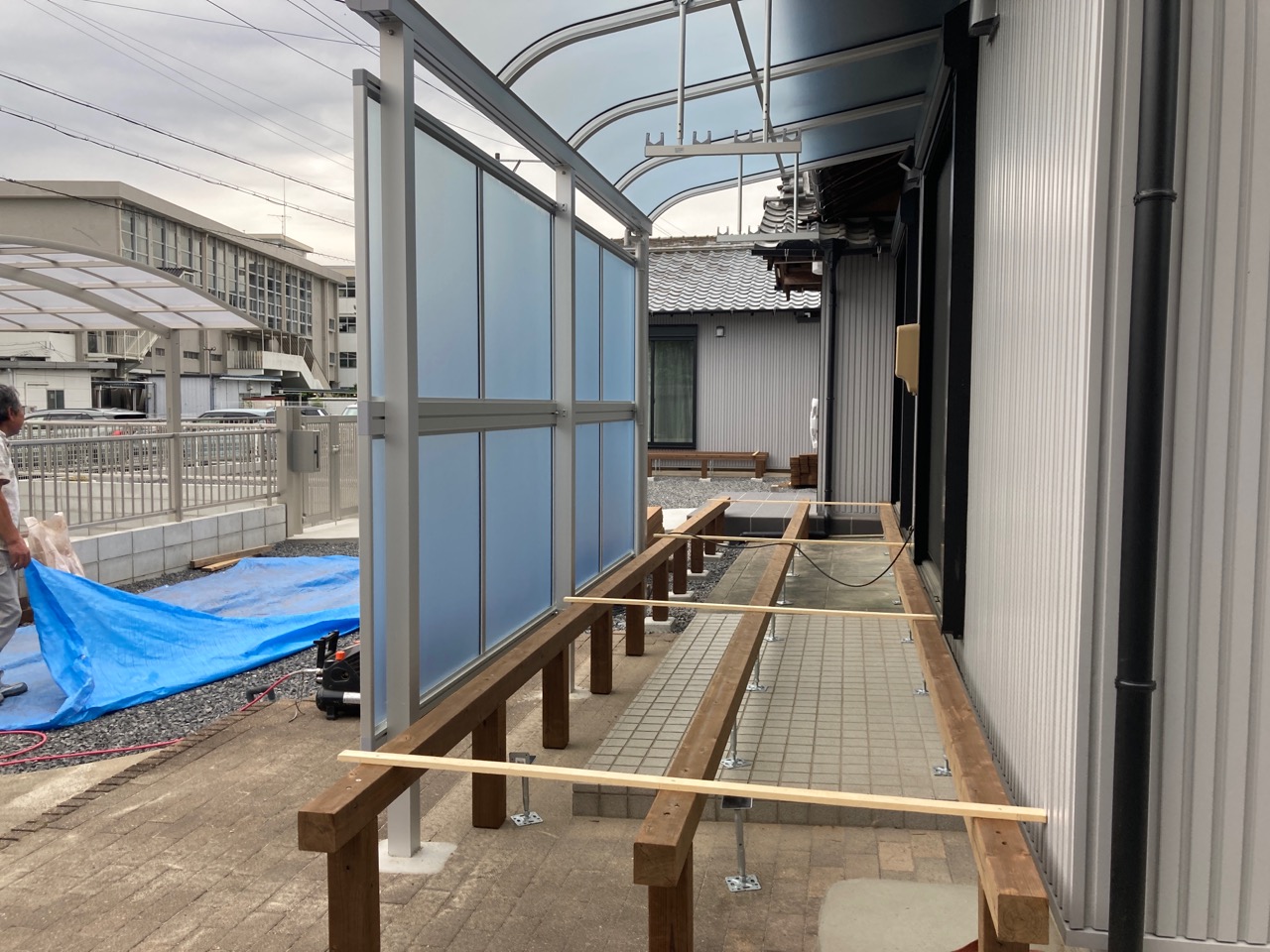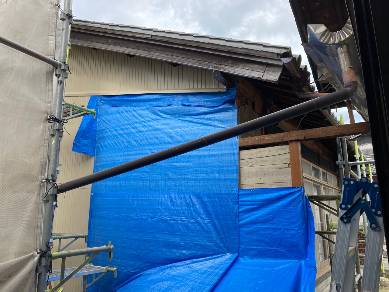 渡り廊下部分の新たな骨組みが組まれ始めました。予報では午後から雨天の様子。空模様とにらめっこしながら雨養生をして工事を進めていきます。