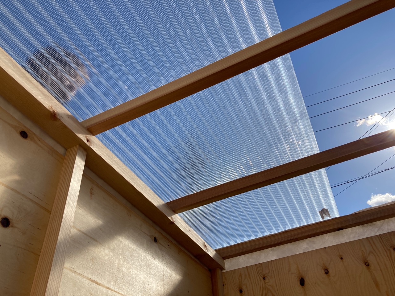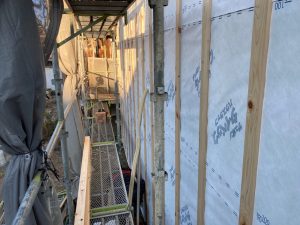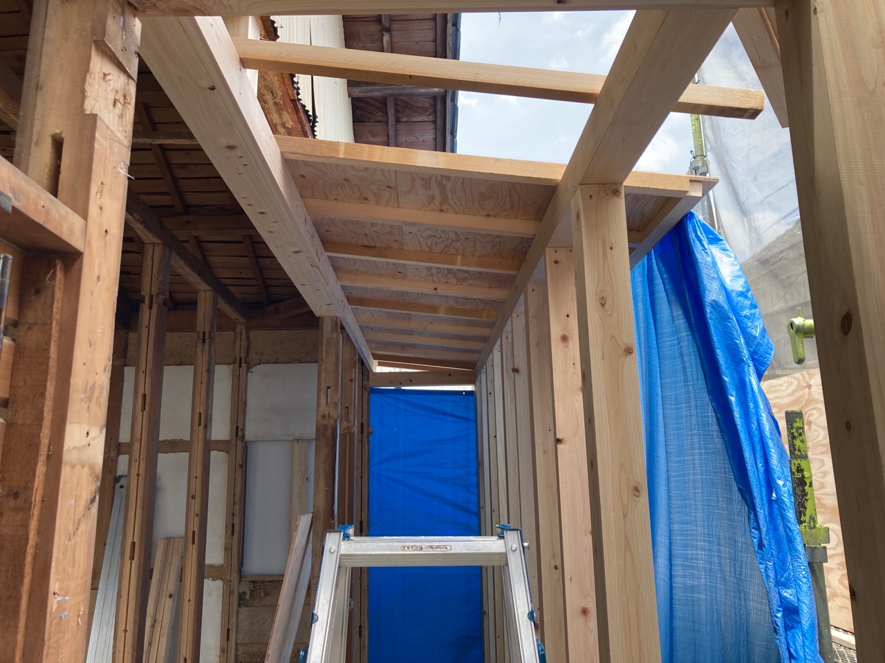 渡り廊下部分の新たな屋根、外壁の下地が完成。主屋と離れの軒の高さの都合上、新しい屋根はそれらをすくい込む高さに設定する必要があります、長じて室内の天井高に影響を与えますが、床高さから天井高さを想定してみたところ、何とか使用に耐える高さは確保できる模様。