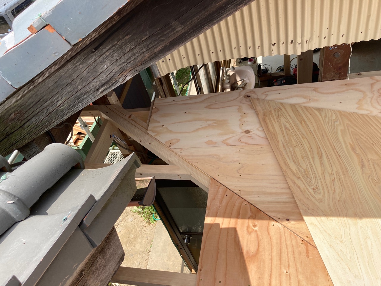 渡り廊下近辺の屋根下地を造作中。寸法は現状合せとなるため、齟齬が出る部分が多分にあります。仕上材の収まりを絡めどのように整合性を持たせるか、現場での試行錯誤が連続します。リフォーム工事の難点であり醍醐味でもあります。