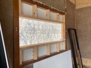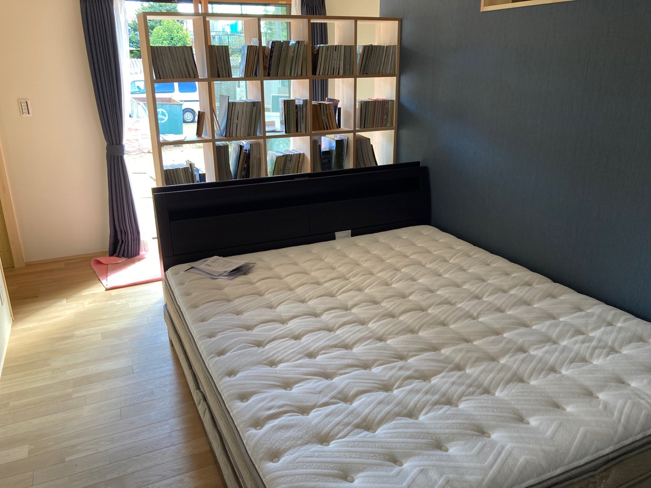 先日棟梁が造っていた棚が完成していました。寝室の枕元に置かれる棚ですが、書籍や小物で収納がいっぱいになれば向こう側の窓からの視線を隠すパーテーションの役割も果たします。