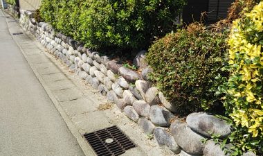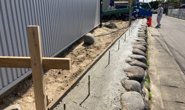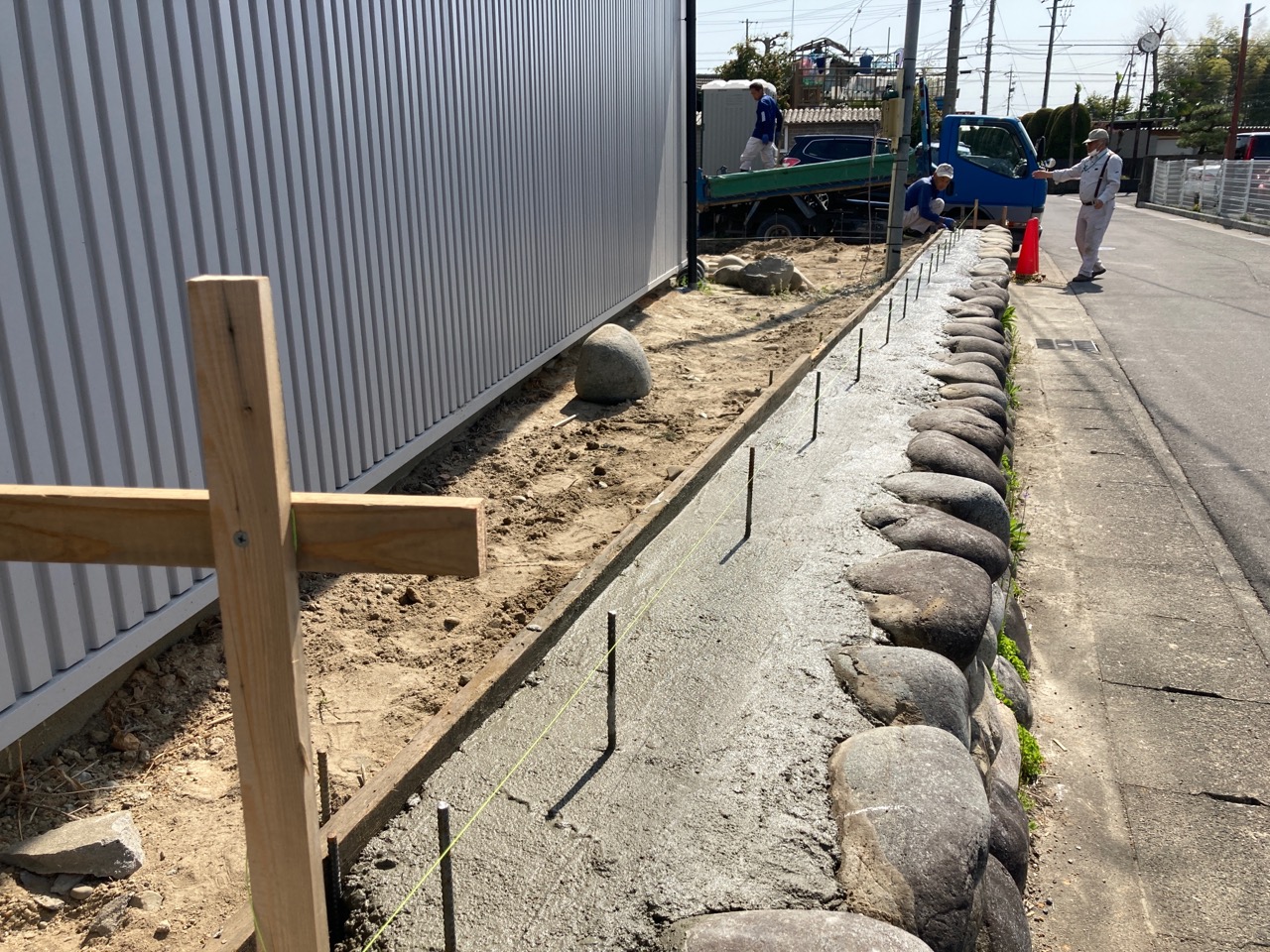 道路面の境界は玉石による石垣の上にブロックを積んでフェンスを施工する予定です。