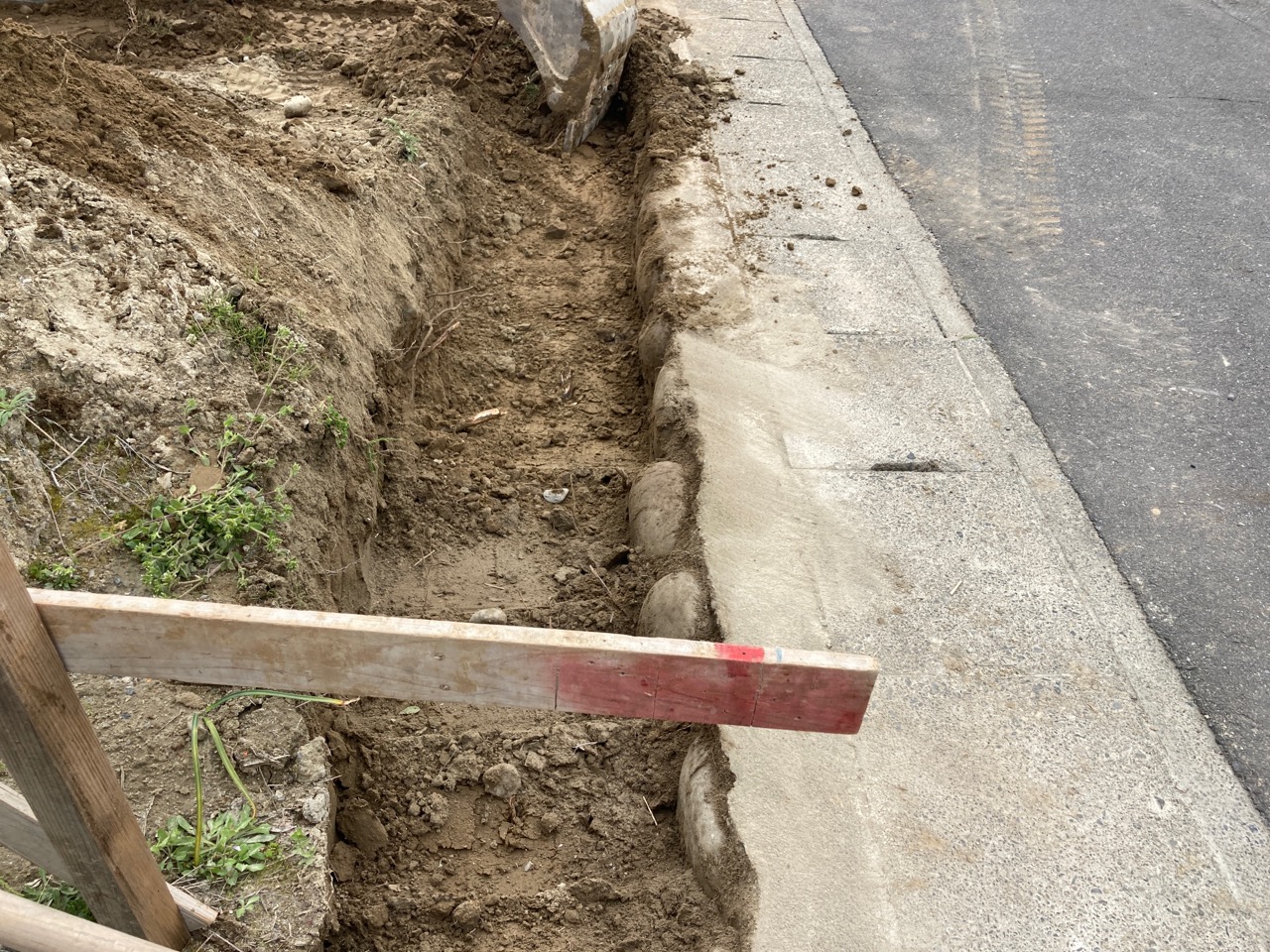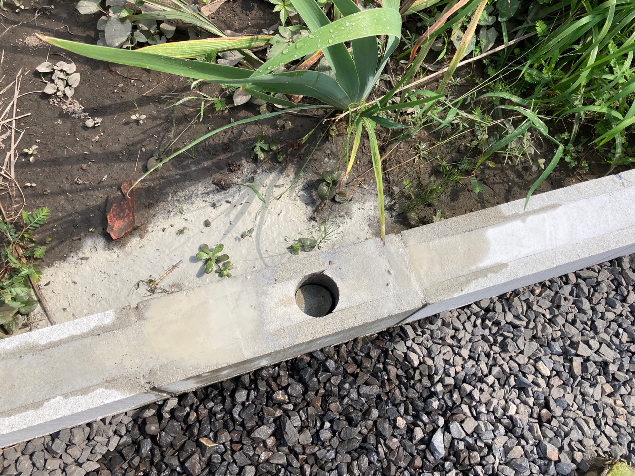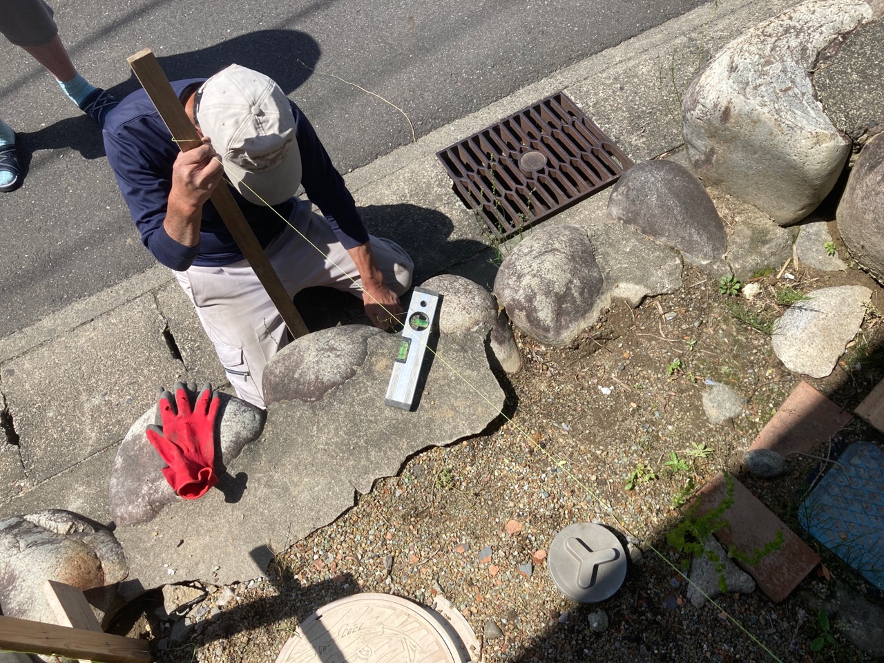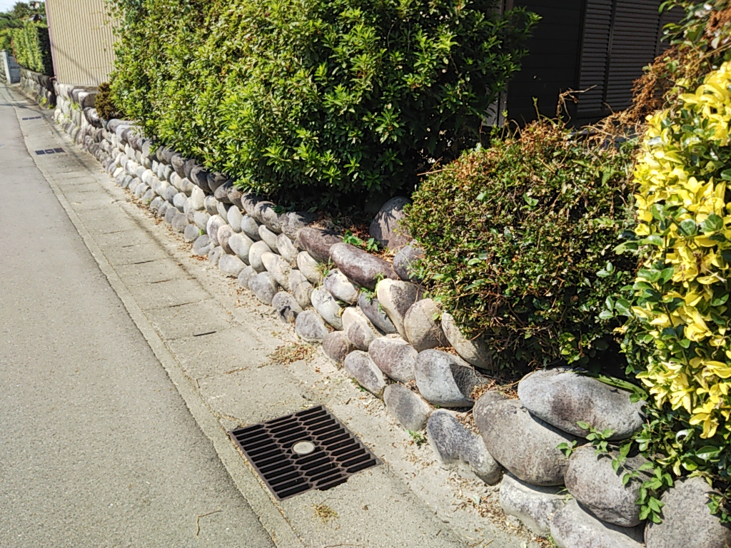 道路境界付近を掘ってみると、側溝の裏側に玉石が出てきました。遠い昔に道路前に用水があった名残ではないかと外構業者さんの推測です。