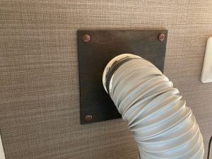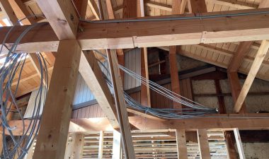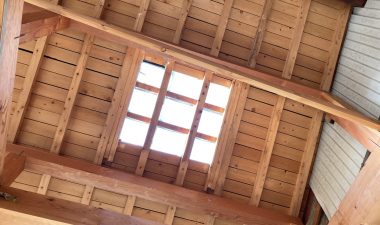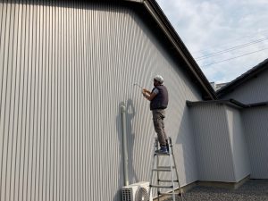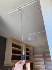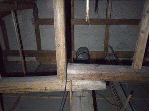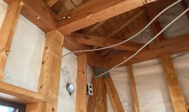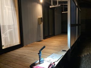 もう一つは外部にブラケットライトを取付ける作業です。今回は小屋裏に上がれるので小屋裏から電源を取り、外部に配線を出して結線します。寸法を測って外からドリルで穴を開けるものの、もう少しで室内の仕上げにあたりそうなギリギリのところにドリルの剣先が・・、少し肝を冷やした瞬間です。
