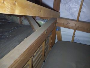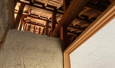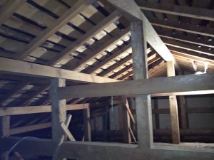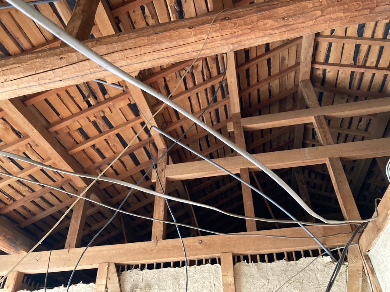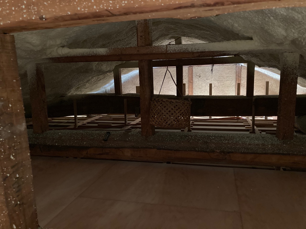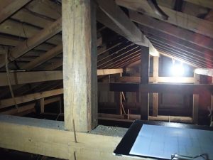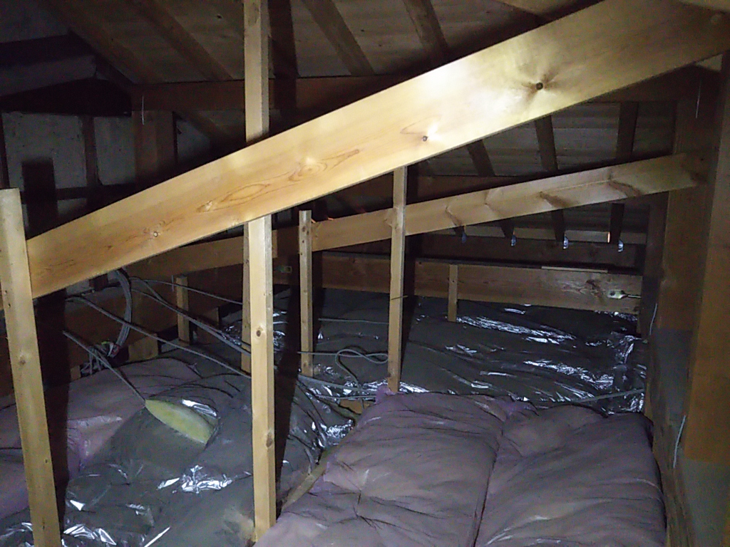 数十年前に増築された部分の小屋裏にも上ってみました。主屋よりは新しいので木材もまだまだ新品同様(?)ですが、断熱材の入れ方がやっぱりなあ・・と感じる施工状況です。