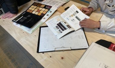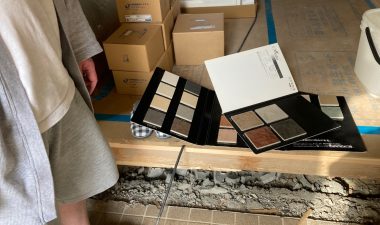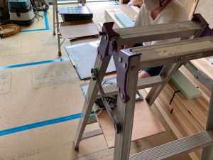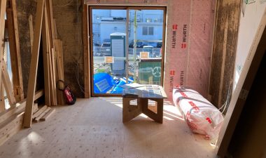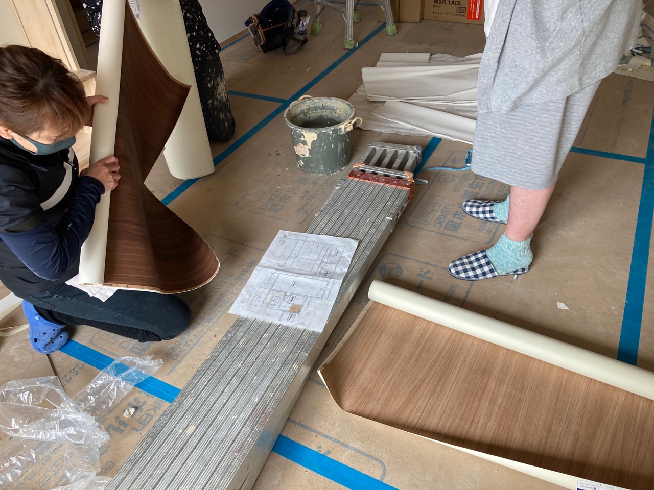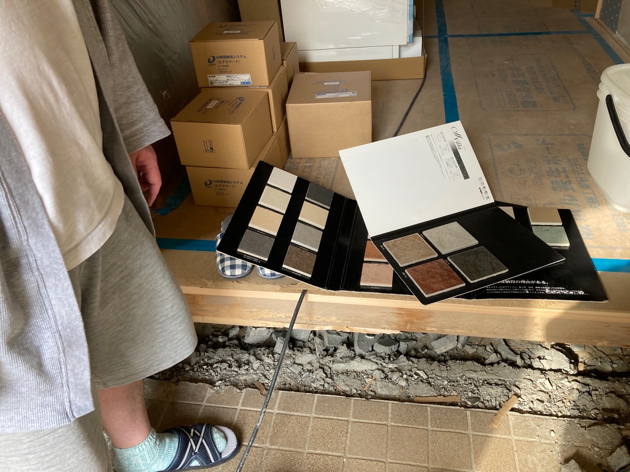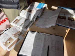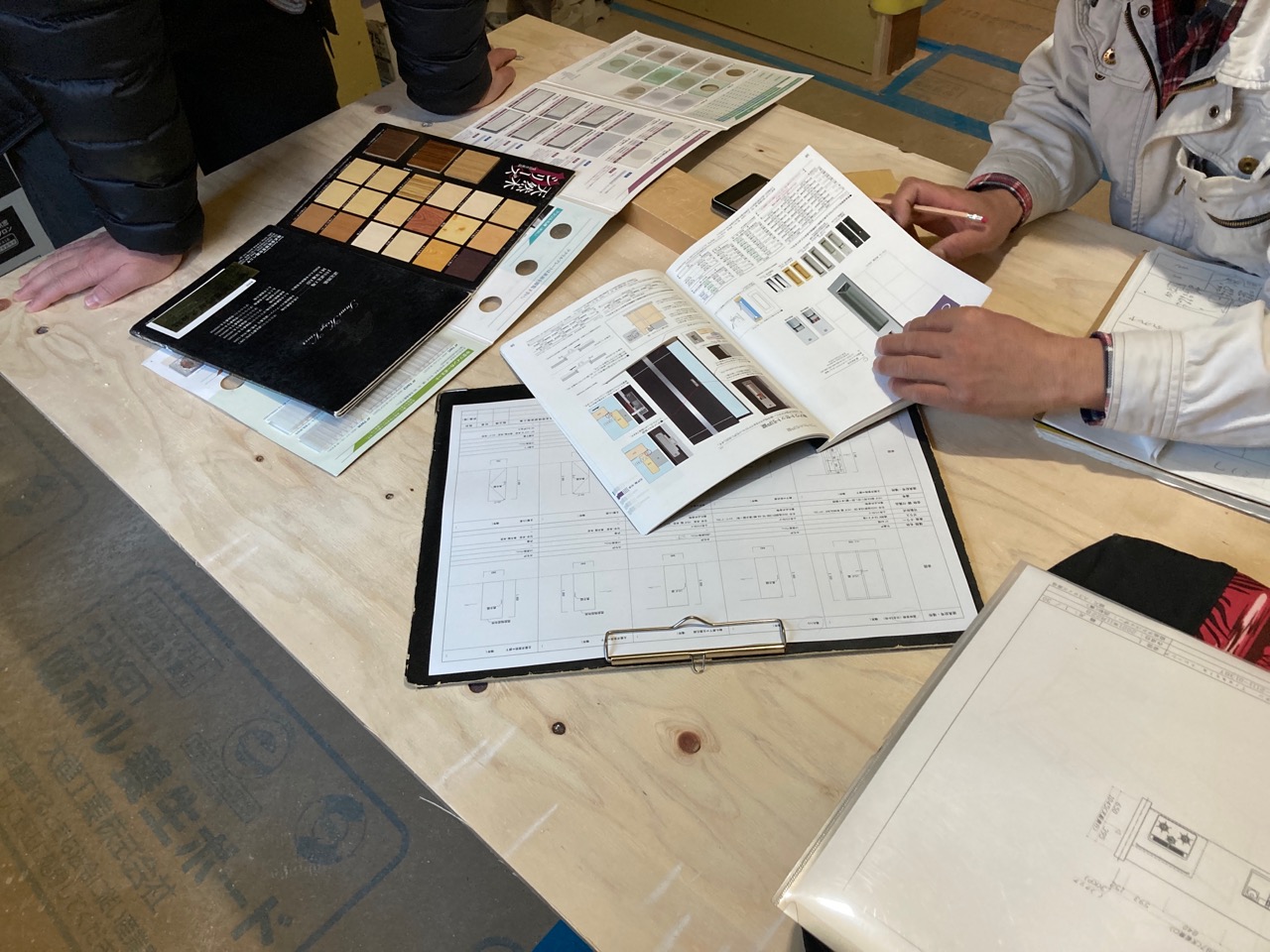 内装のお打ち合わせにやってきました。とりあえず現場にあるもので即席のテーブルと椅子をつくりいざお打合せ開始です。本日は建具とクロスについて取り急ぎ資料を展開し、i様に説明。サンプルなどをお渡ししてしばらく迷ってもらう事にしました。