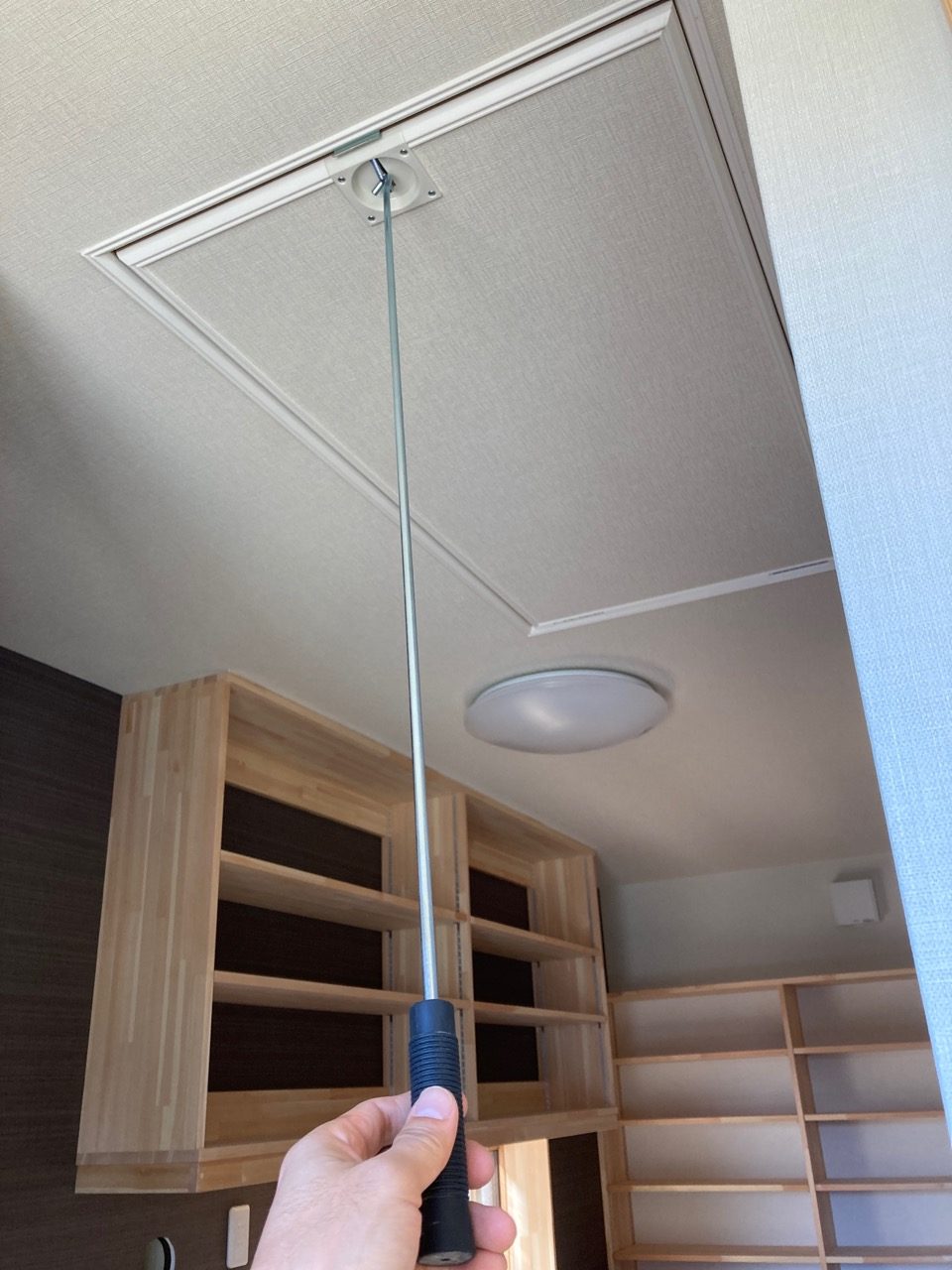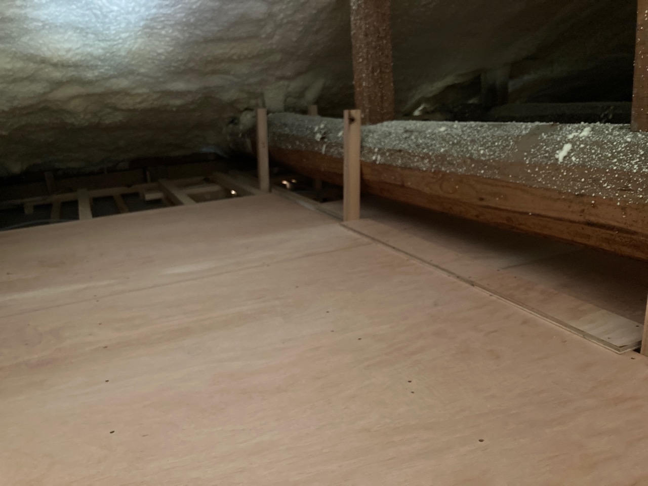 小屋裏の収納の様子。小屋梁が丸太のため、梁上に水平の床をとる事はできませんが、梁下に水平下地を通し合板を敷く事で小屋の収納を確保しました。向こう側へ荷物を置く際は丸太を少し跨いでもらう事になります。
