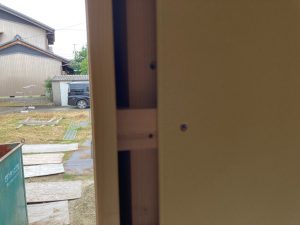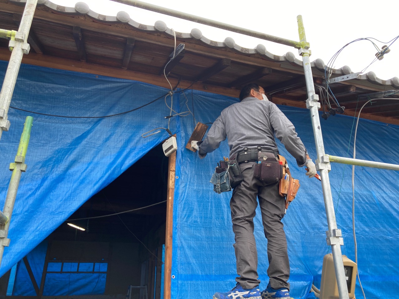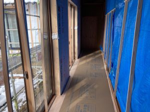 これまでのリフォーム工事は先に離れの中の工事を行い、続いて主屋の中の工事を行いました。i様が生活をしながらの工事でしたので、行き来できないように渡り廊下部分で『開かずの扉』を取付けて封印して工区を分けていました。その間渡り廊下に取付けた仮の扉で施錠。内部の工事がすべて終了しましたので、開かずの扉と仮の扉はお役御免となり、その部分の外装工事にかかります。