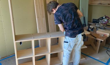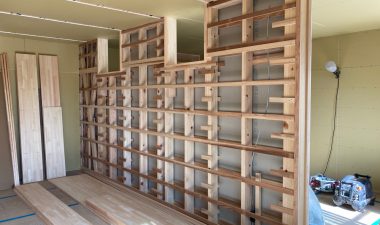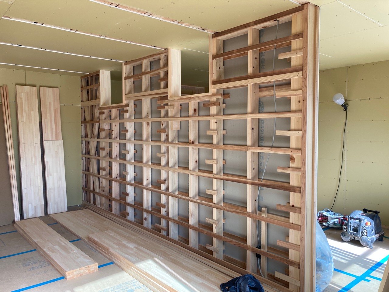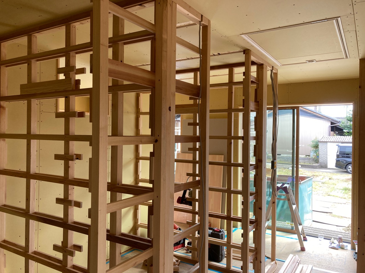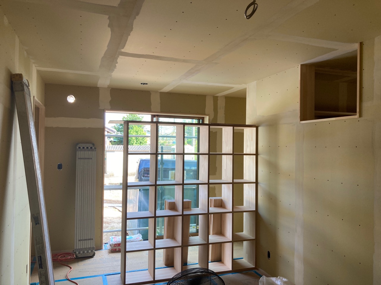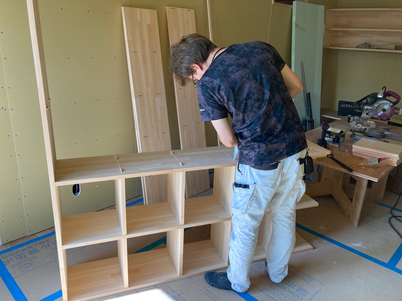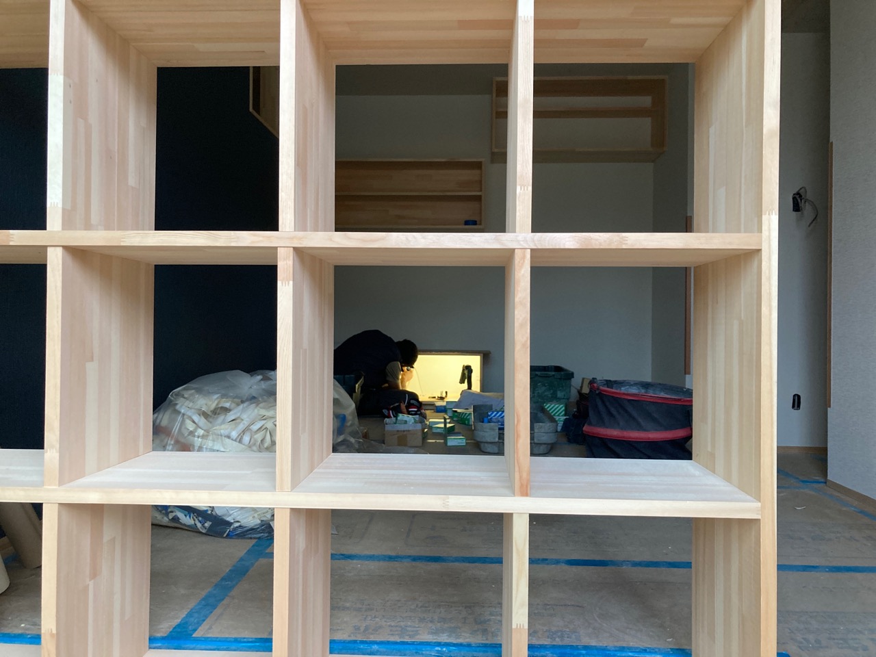 y井棟梁は造作の仕上げとして井桁状に組まれた棚の制作中。パーテーション兼本棚として設置される予定です。