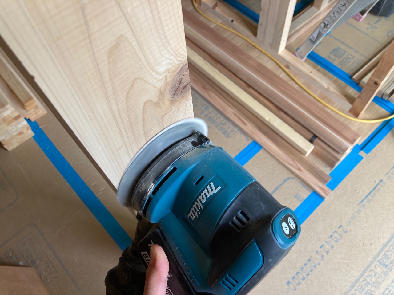 まずは棟梁に借りたサンドペーパーで表面を磨き上げていきます。元は化粧柱にするつもりはなかったので大壁用の特一等の柱のため製造先の印字が刻印されています。ペーパーでばりばりと表面を磨き、印字ごと落していきます。