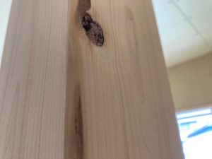 印字もキレイに落とし、角も面取りをしました。現場では『のた』と呼ぶ、丸太の表面にあたる部分も角に残っていたのでこちらもペーパーをあてて自然な角まわりとしました。意外とこの方が風情が出そうな感じがします。