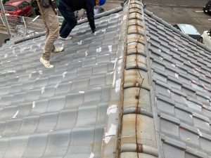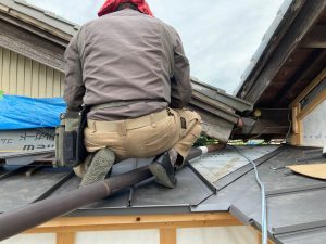 外部では一部増築した部分の屋根葺きに板金業者さんが上っています。主屋、離れの軒先が絡む部分の下をすくい込むように増築部の屋根を葺いてもらっています。この下は廊下ですので、居室ほどの高さは不要ですが、通行は無理なくできるように天井高は取れるだけいっぱいとっています。板金屋根だからなせる、この緩勾配の妙技。