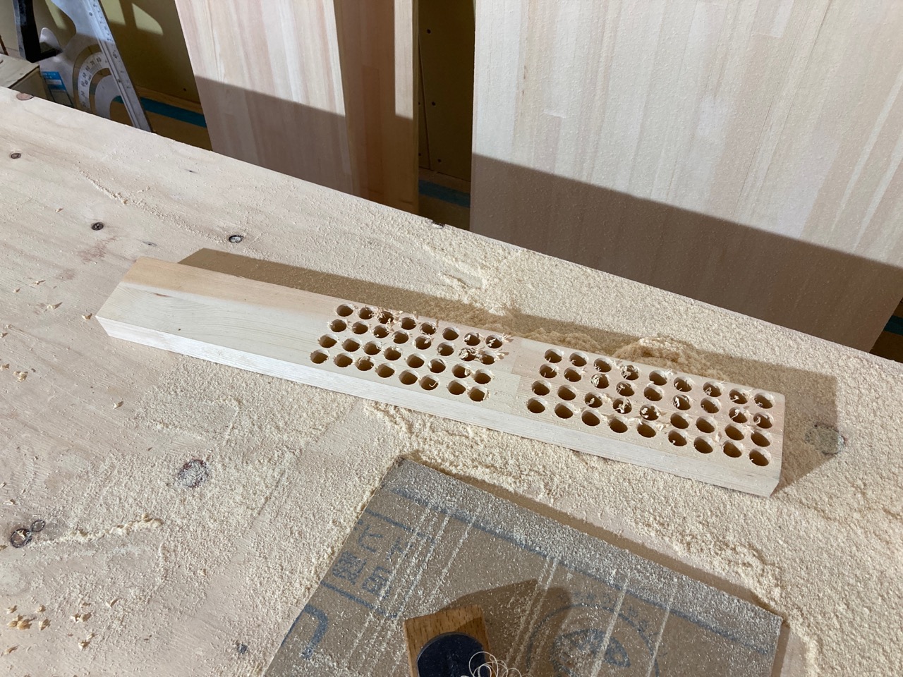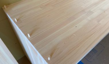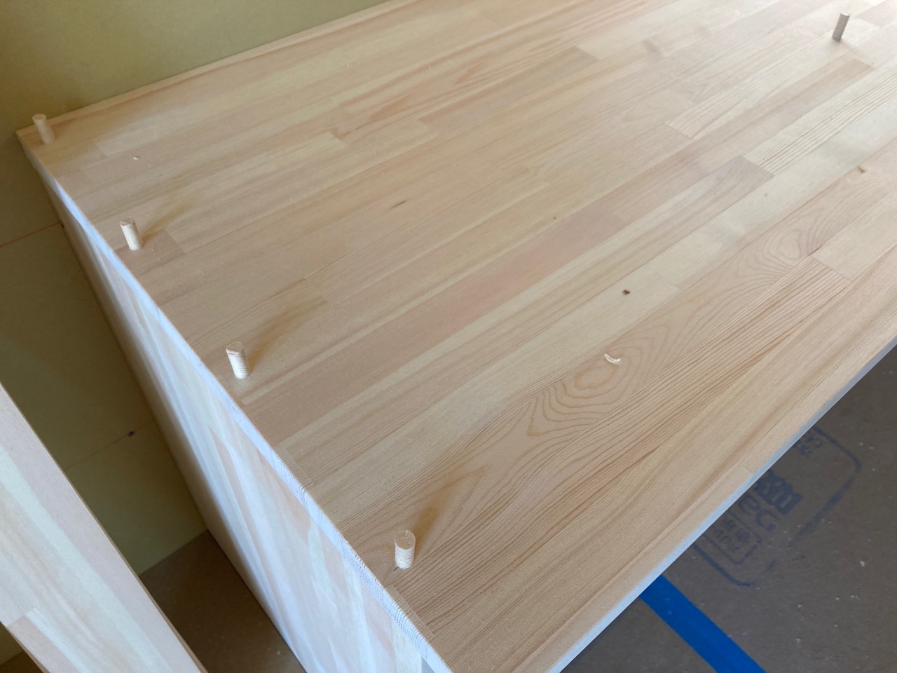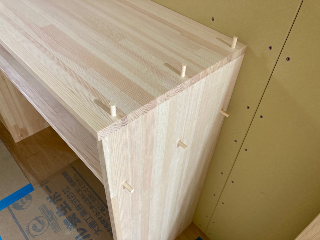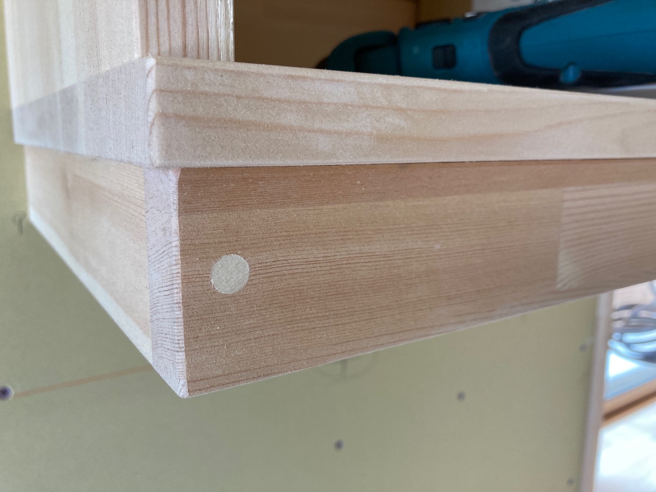 材料が直交する部分のビス留めは下穴を掘りビス留めの後、樽栓を埋め込みます。ビスの頭をキレイに隠す手法です。