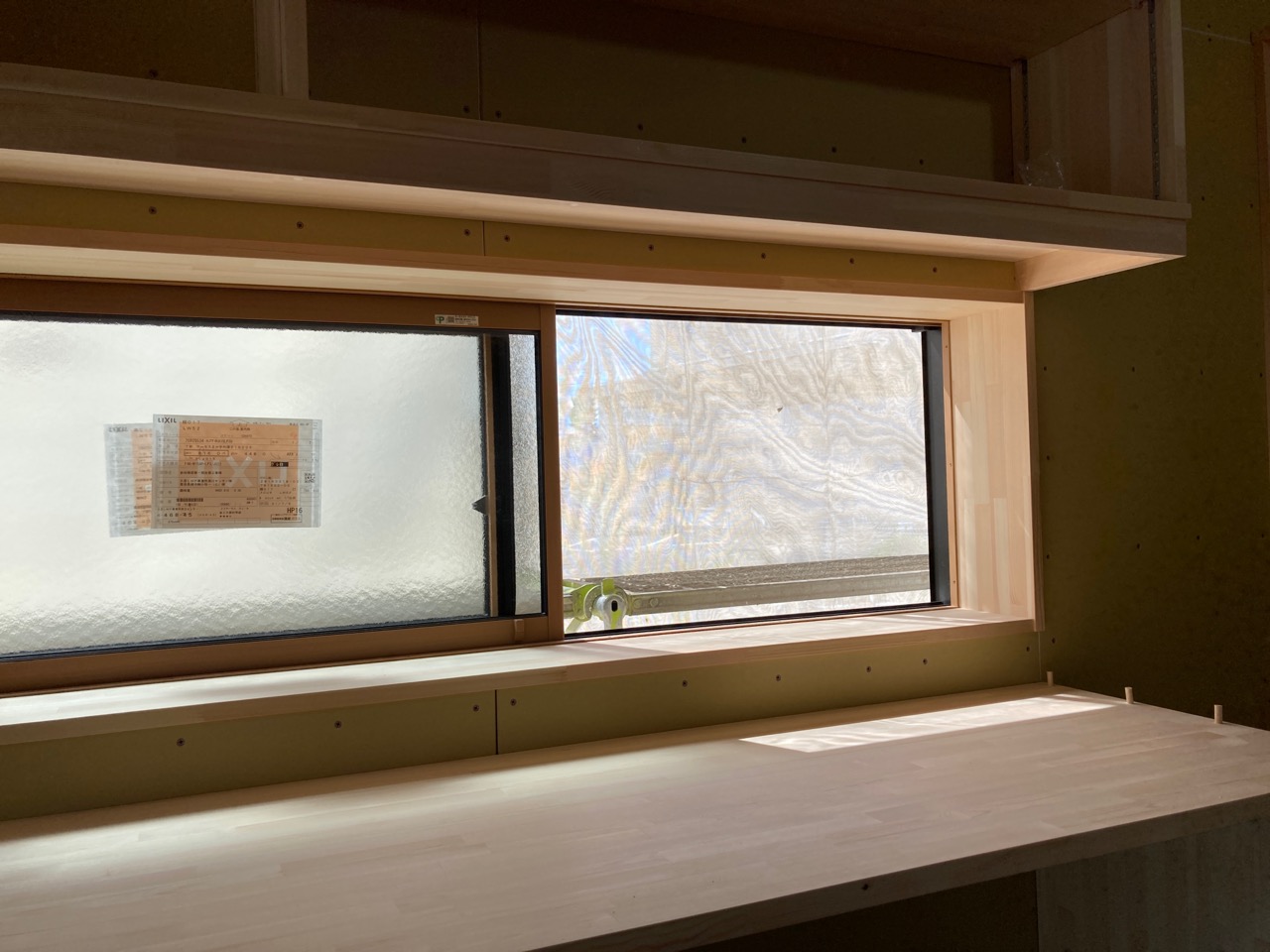 作業室の机と棚製作中。広々とした作業しやすい高さのデスクカウンターです。前の窓からは通りを見渡す事ができます。南面の窓ですが型板ガラスなので作業中もそれほど眩しくなく作業できる・・・?かもしれません。