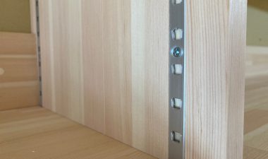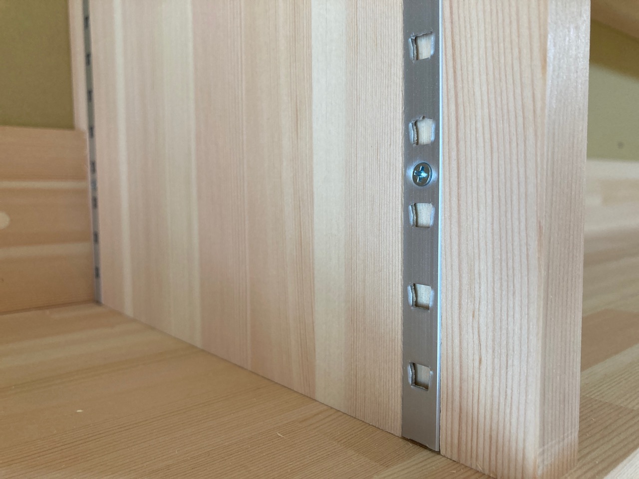 可動棚板に使用する棚柱金物はその厚みの分側板に溝掘りをしておき、その溝の中に留め付けます。表面が平滑になり収まりがキレイに見えるようなひと手間をかけています。