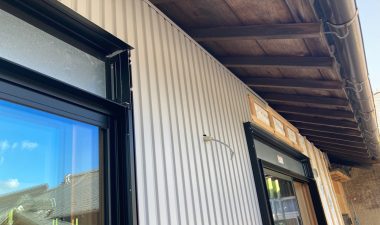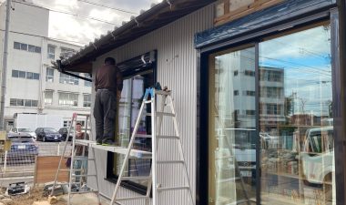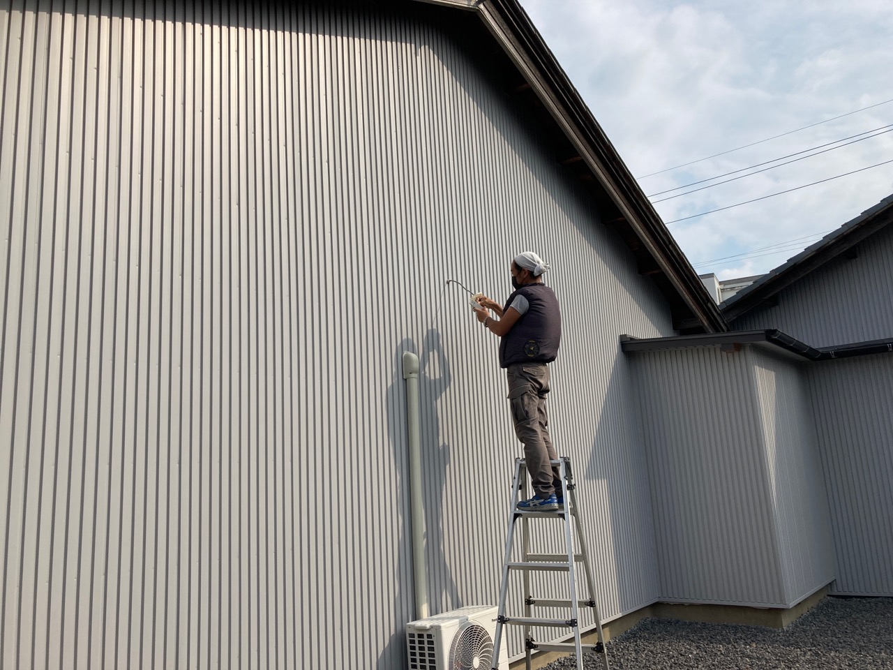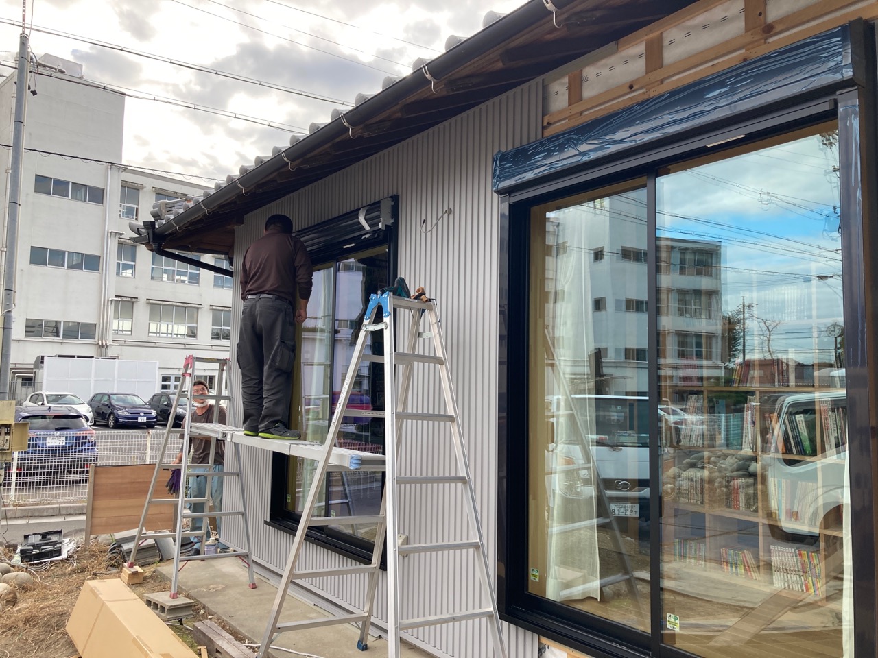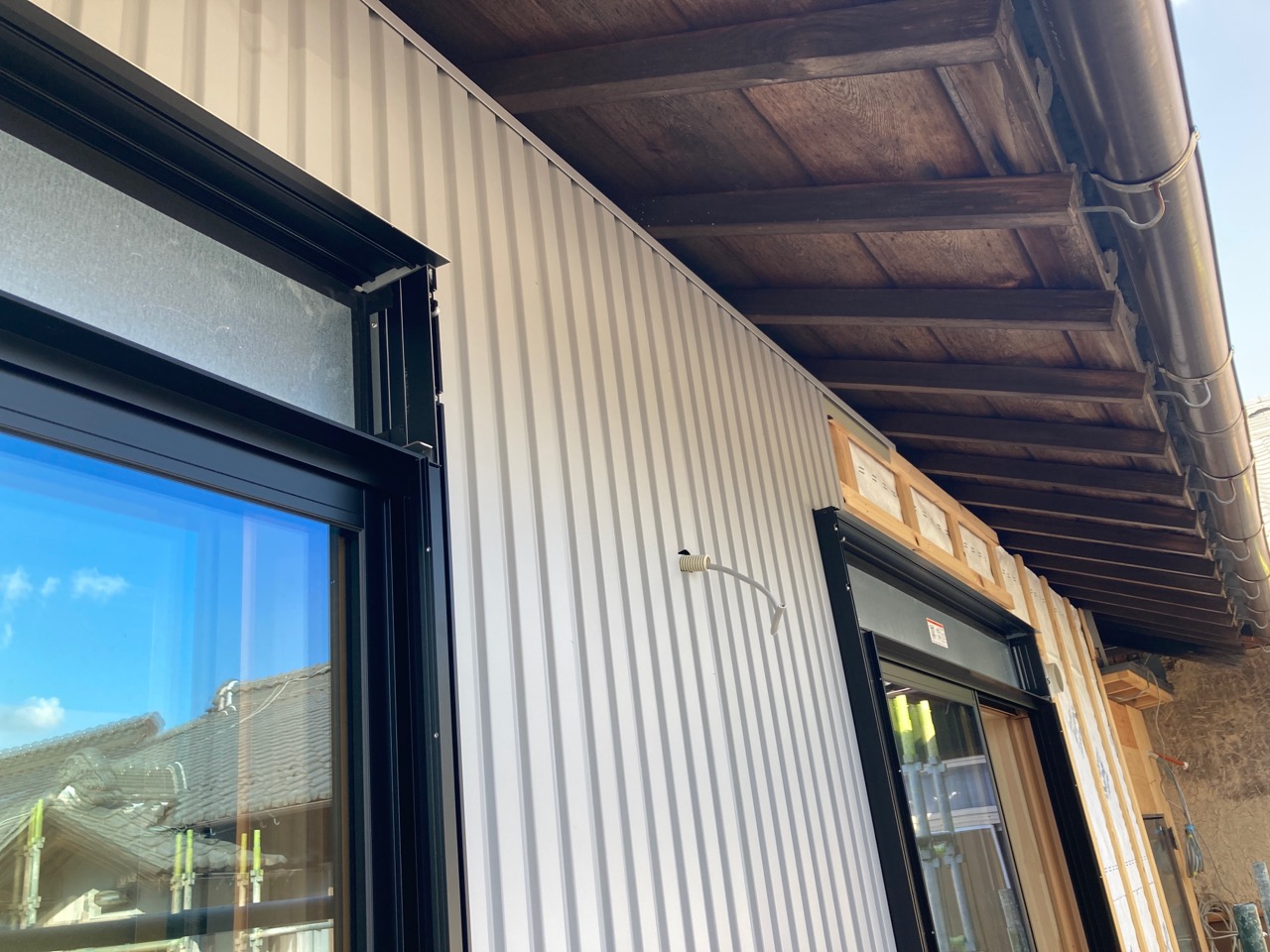 外壁のガルバリウム鋼板も施工が進んでいます。今までの明るいブラウンを基調とした色合いから打って変わってクールなライトグレー色です。