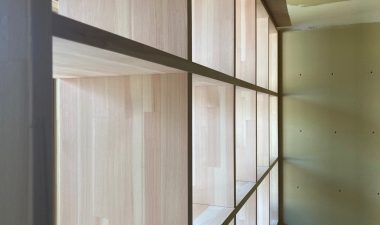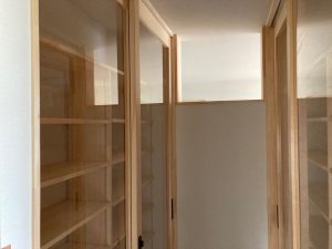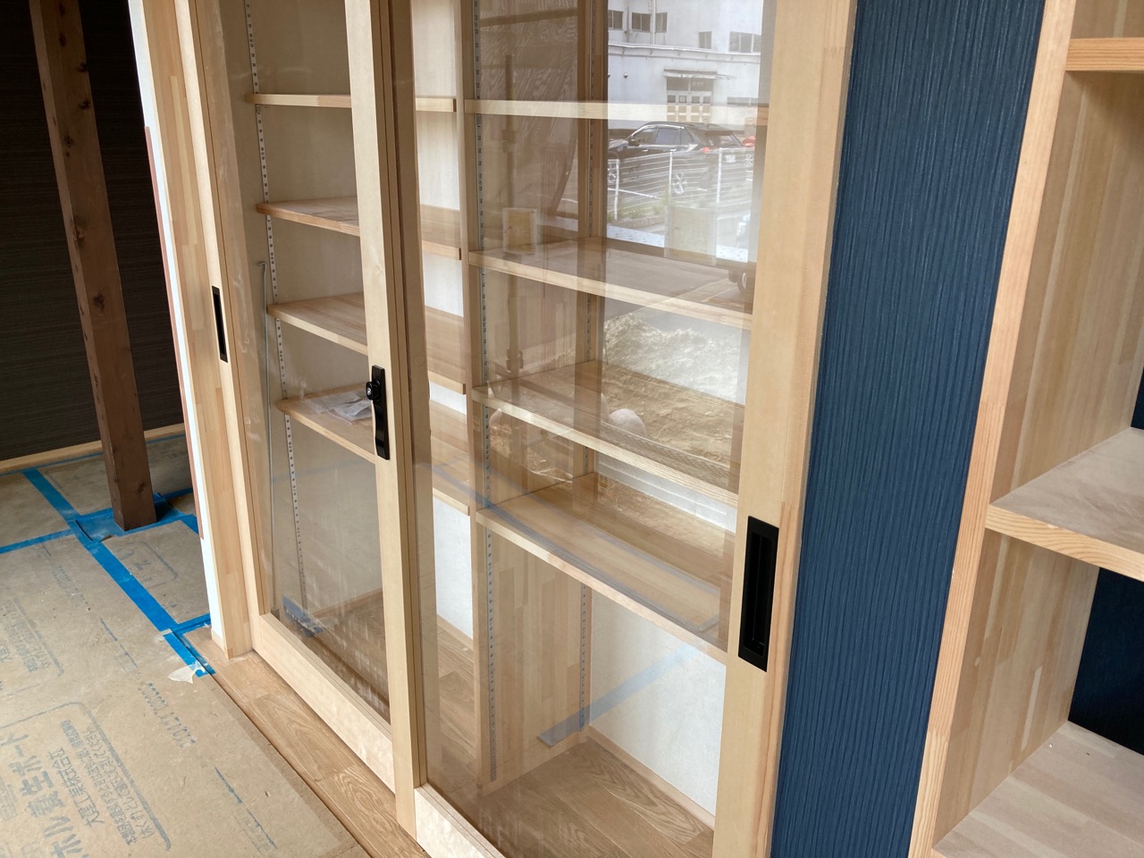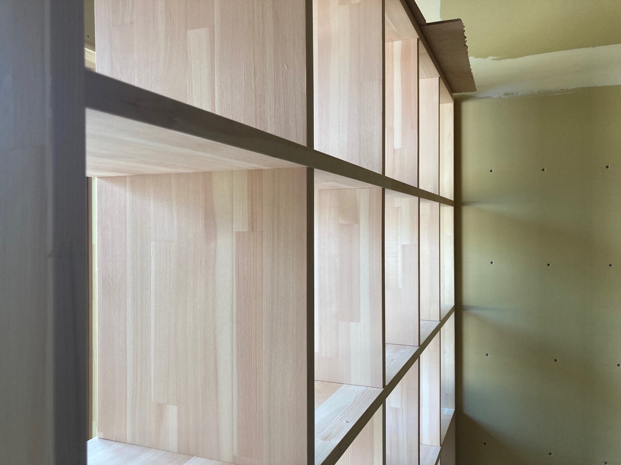 作業室の収納陳列棚ができあがってきました。間口1.8m×高さ2.35mの棚が全部で5列あります。これだけたくさん何を飾るのかはできてからのお楽しみです。