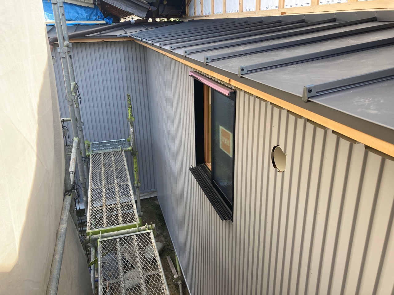 連休前に下地を施工した離れとの渡り廊下の外部のガルバリウム鋼板も張り終えています。これでやっと住宅本体の雨仕舞が終了しました。
