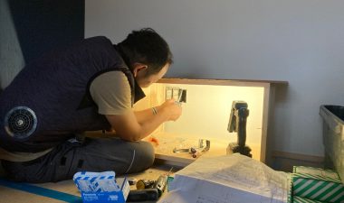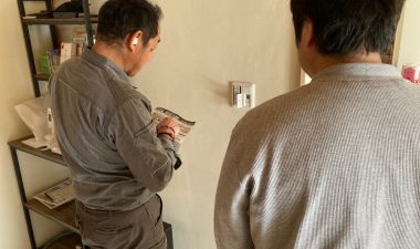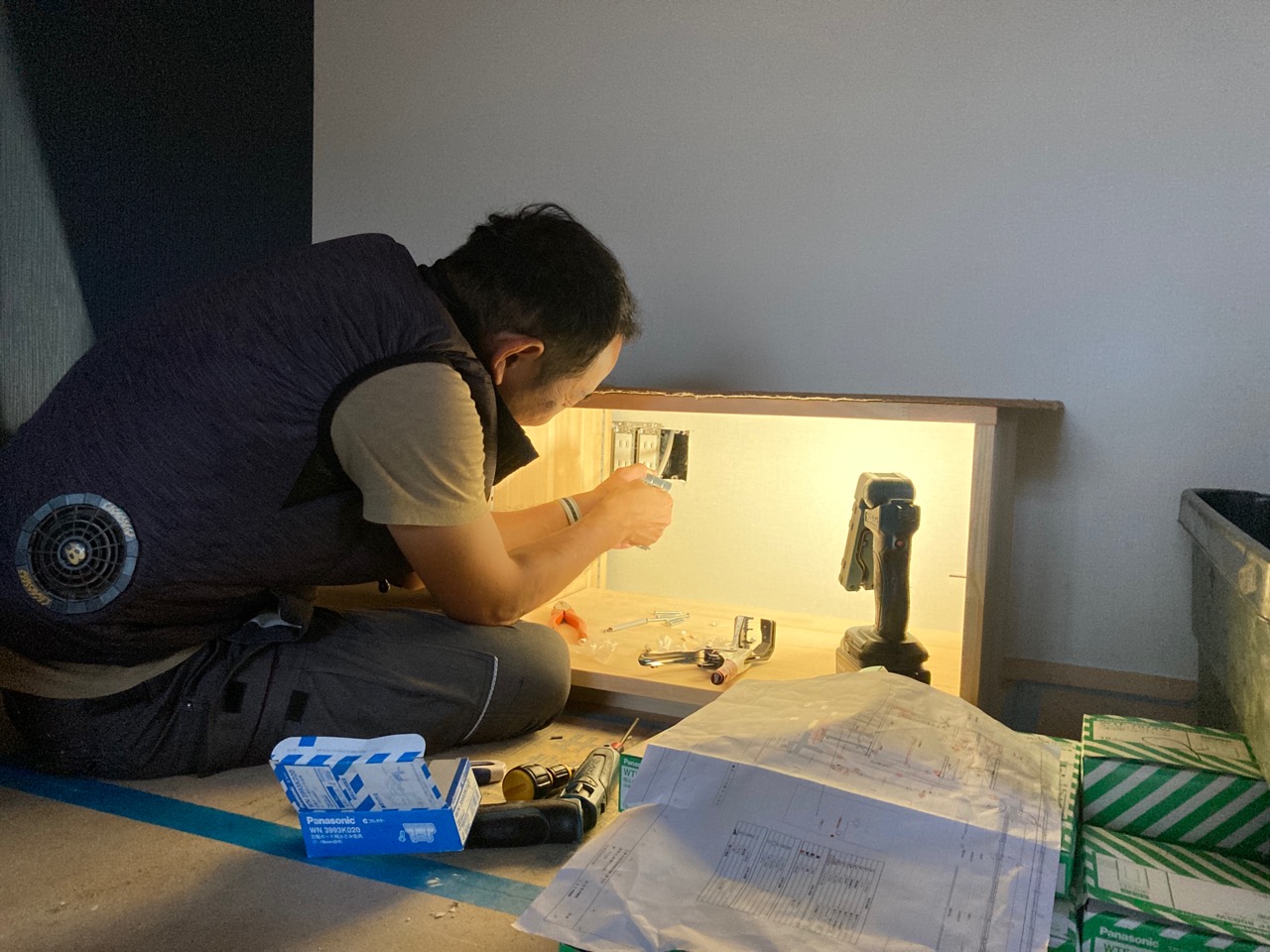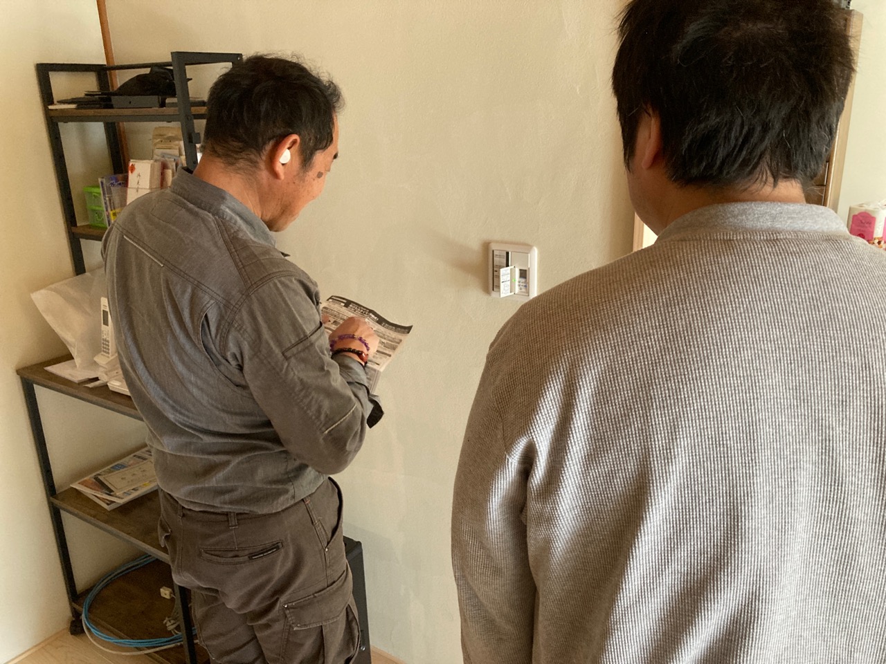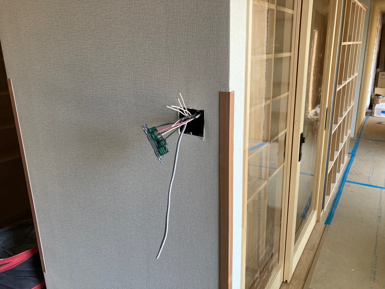 塗壁の都合上、取付けていなかったコンセントやスイッチプレートを取付けました。i様がお仕事で不在の時も夜遅く帰宅した際に点灯しているようにとタイマー付きのスイッチを取付けられました。設定方法も取説を見ながらでないとなかなか難しく、何とか設定する事ができました。