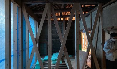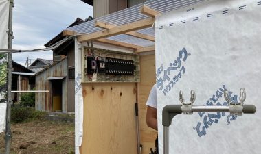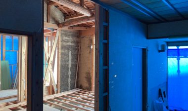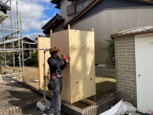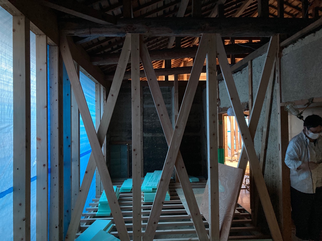水平垂直材及び斜材で構成される日本の旧い家屋はいわゆる『柔構造』です。地震や台風などの力を柔らかく逃がす、という造り方ですが、今回は新築工事でも使用される構造用耐力面材を外壁に貼り付けていき『剛構造』とします。これにより柔構造の時には無しえなかった『変形』に対応させていく計画です。地震などの横揺れの力を受けた時柔らかく力を逃すもののその後変形してしまったままでは次の横揺れに耐える事が困難です。剛構造の形をとり、それらの問題にも対処していきます。