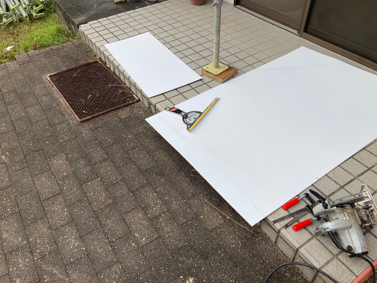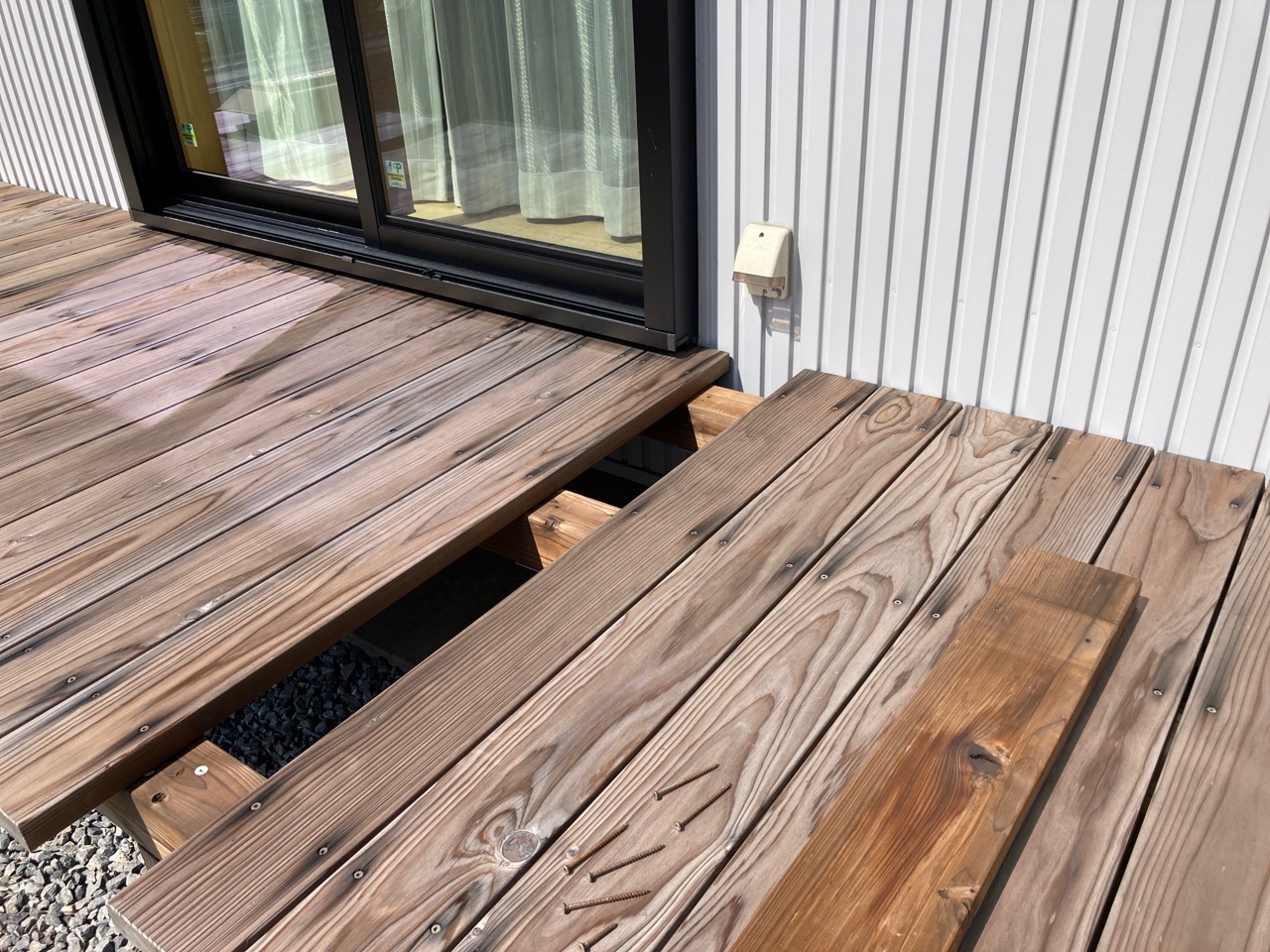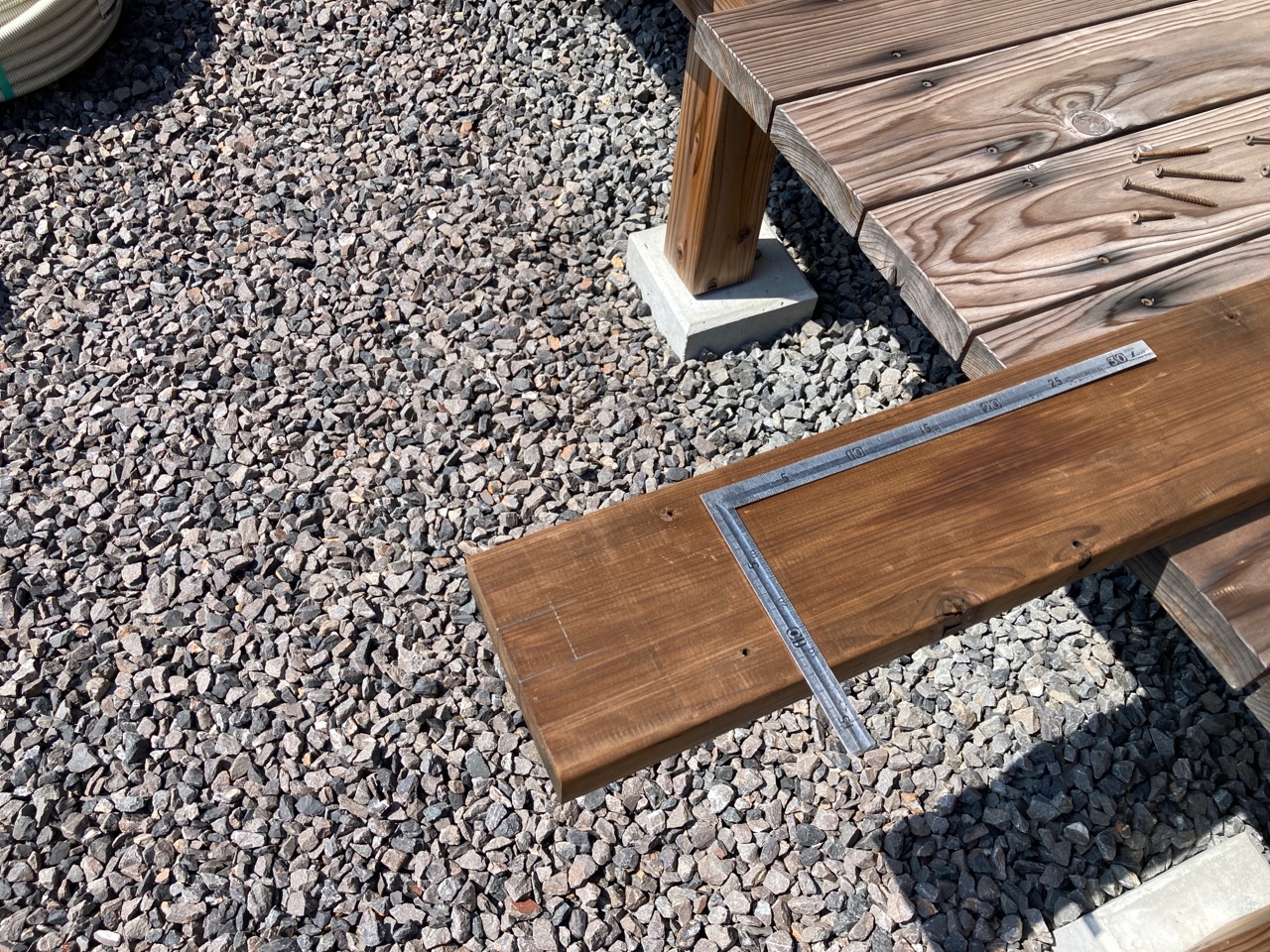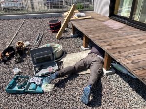 電源はウッドデッキの上にあり、配線は下を通したいのでデッキの一部を欠き取り加工します。こういう時に道具を持っていると非常に便利です。