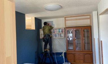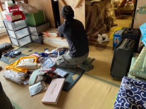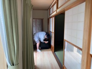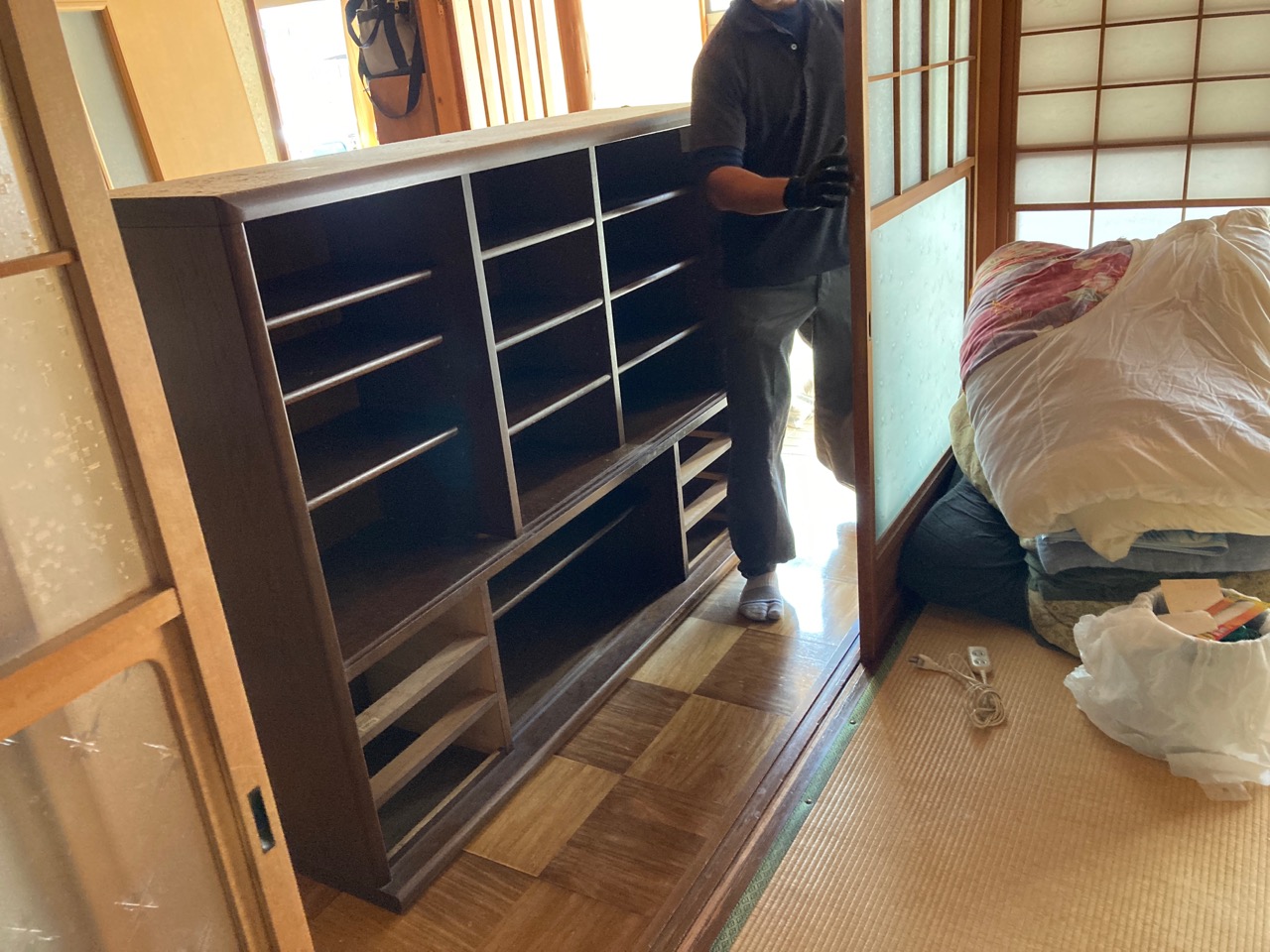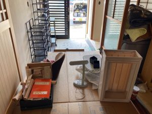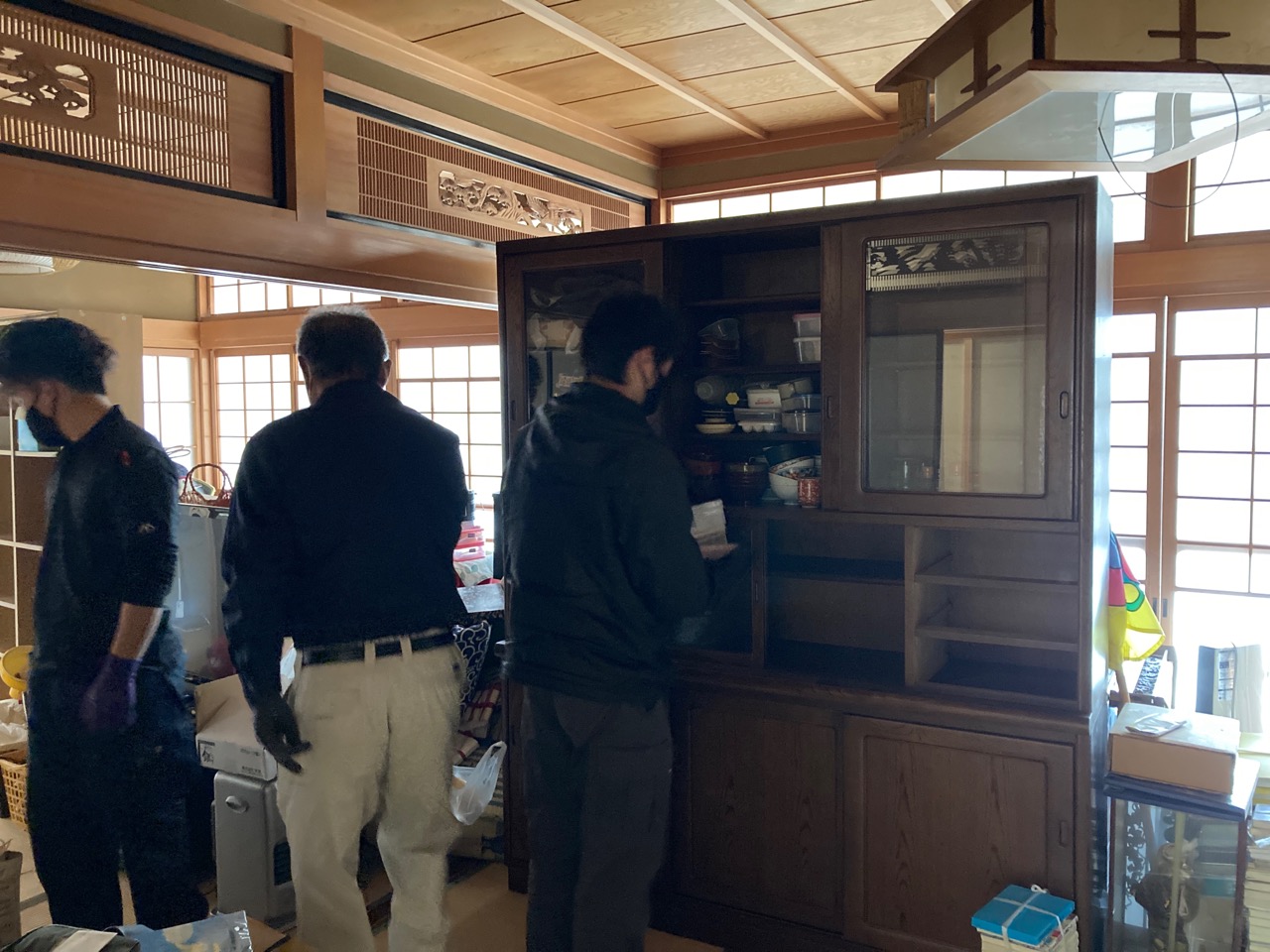 LDK、個室、水回りのリフォームがほぼ完了し、生活できる状態になりましたので、約4か月前に家財道具の一切を保管した座敷から各部屋へ移動する作業を開始しました。現場監督y口、若手の監督見習いo本君、若手見習大工のk田君に手伝ってもらい、i様に陣頭指揮をとってもらってにぎやかに作業を進めました。先回はこれらのほぼ倍の家財道具や小物があり、取捨選択、離れへの移動もあってかなり時間がかかりましたが、今回は量的にも半分、家具を収める場所もはっきりとしているのでスムーズに進める事ができています。