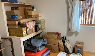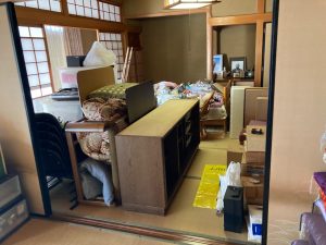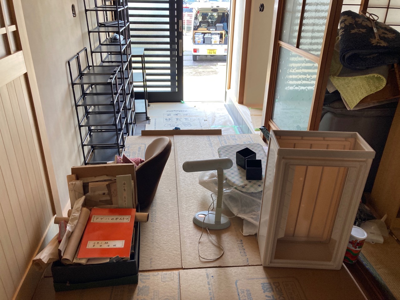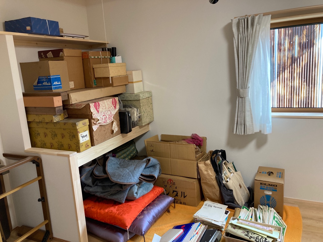 当初座敷にあった小物などは『とりあえず』まだ使用する予定の無い個室へ保管しました。i様がこれから仕分けをするのが結構大変な量の様々なものが保管されています。今回も少々廃棄する予定の物が出てきましたが、先回の移動に比べればだいぶ減っています。