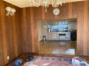 右写真にある元々の間仕切りの鴨居と下げ束(欄間の右側に写っている垂直の短い材料)はどのように接合しているか、と想像しながら解体したのですが、釘やネジを全く使わずに昔の棟梁が行う『仕口』で造られていました。少し変わった仕事をしてありました。(写真を撮っておけばよかった)こういったリフォーム工事では数十年前の技術を発見できる、というところにも一種楽しみがあります。