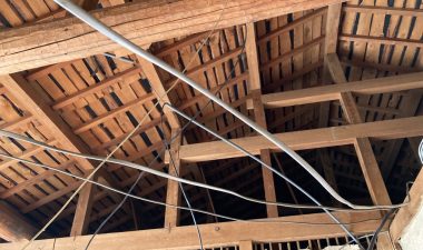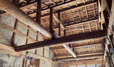 建物の内装の解体工事が始まりました。構造材はそのままに天井材や壁材の仕上げ材をめくっていきます。残す部分、取り払う部分を詳細に仕分けるために大工さんが解体工事を行います。天井をめくってみると見事な松の丸太の梁が現れました。棟木には当時の上棟際に奉られた扇やかごなどが残っていました。
