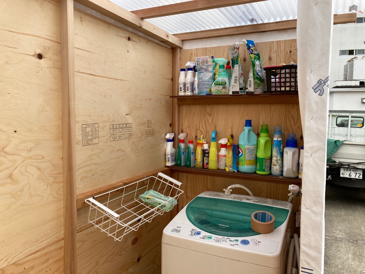 旧い洗濯機を置いていた仮設小屋もこれでお役御免。解体して養生など別々の材料として再利用します。