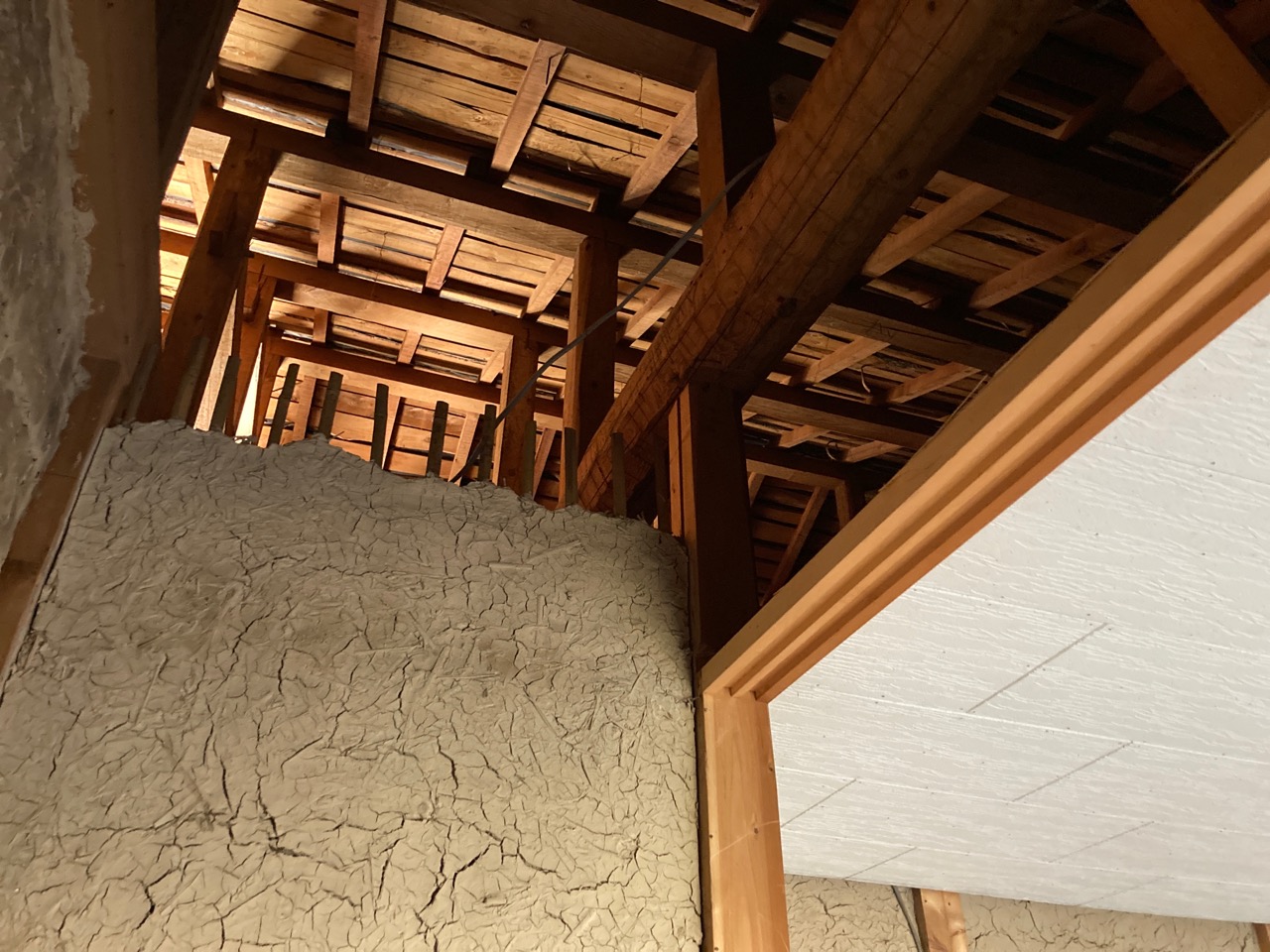 外壁下地まわりに外断熱材が敷設されています。柱間には既存の土壁がありますので、すべて土を落としてしまうのではなく蓄熱層として存置して新たに外断熱を打ちました。図らずも新築では非常に費用の掛かる『土壁蓄熱』をリフォームで実現する事ができます。いにしえの職人の技術や知恵がこういうところで役立っています。
