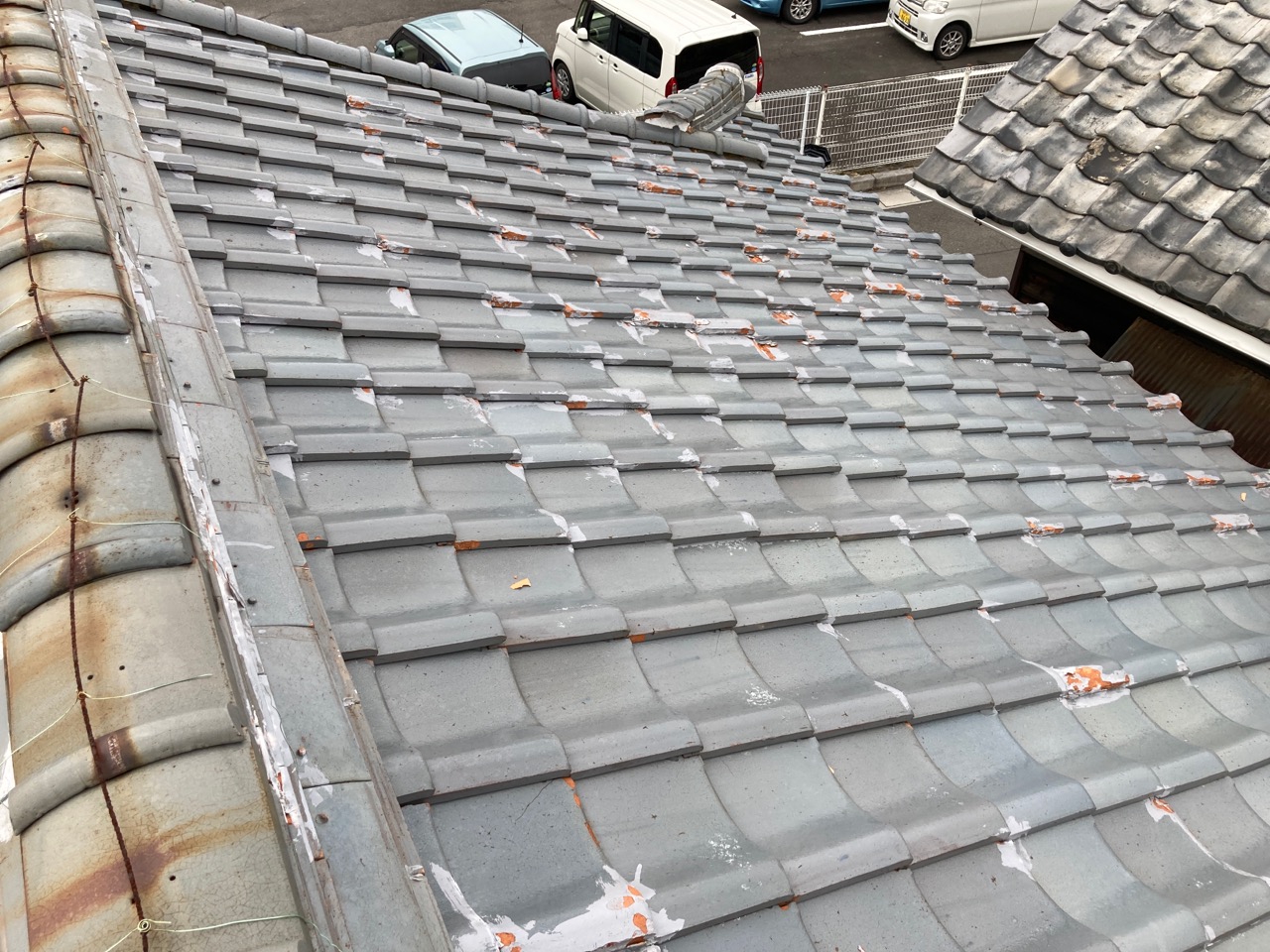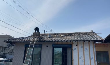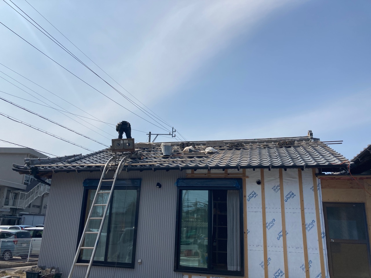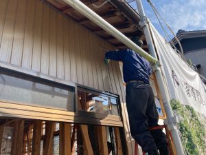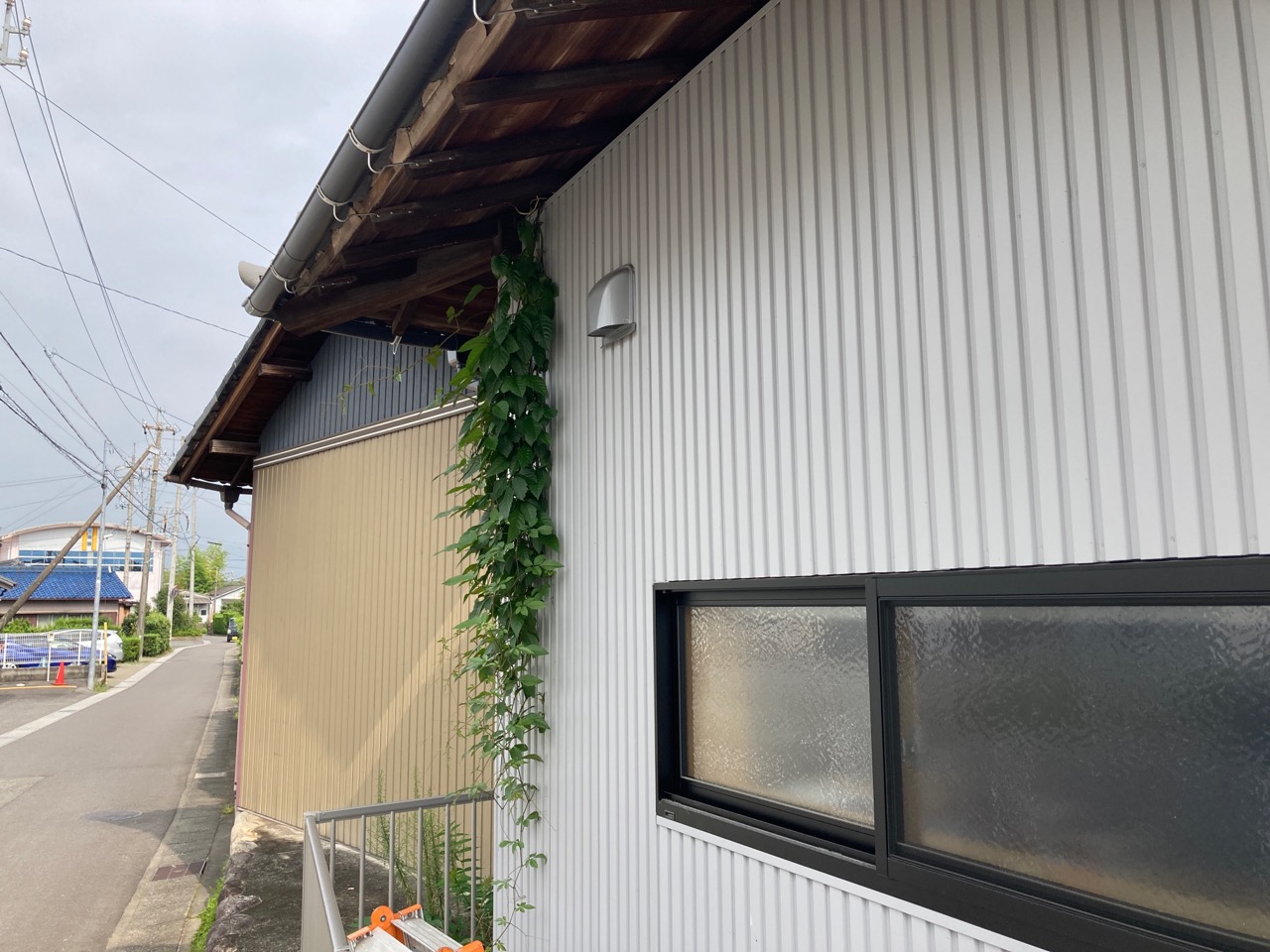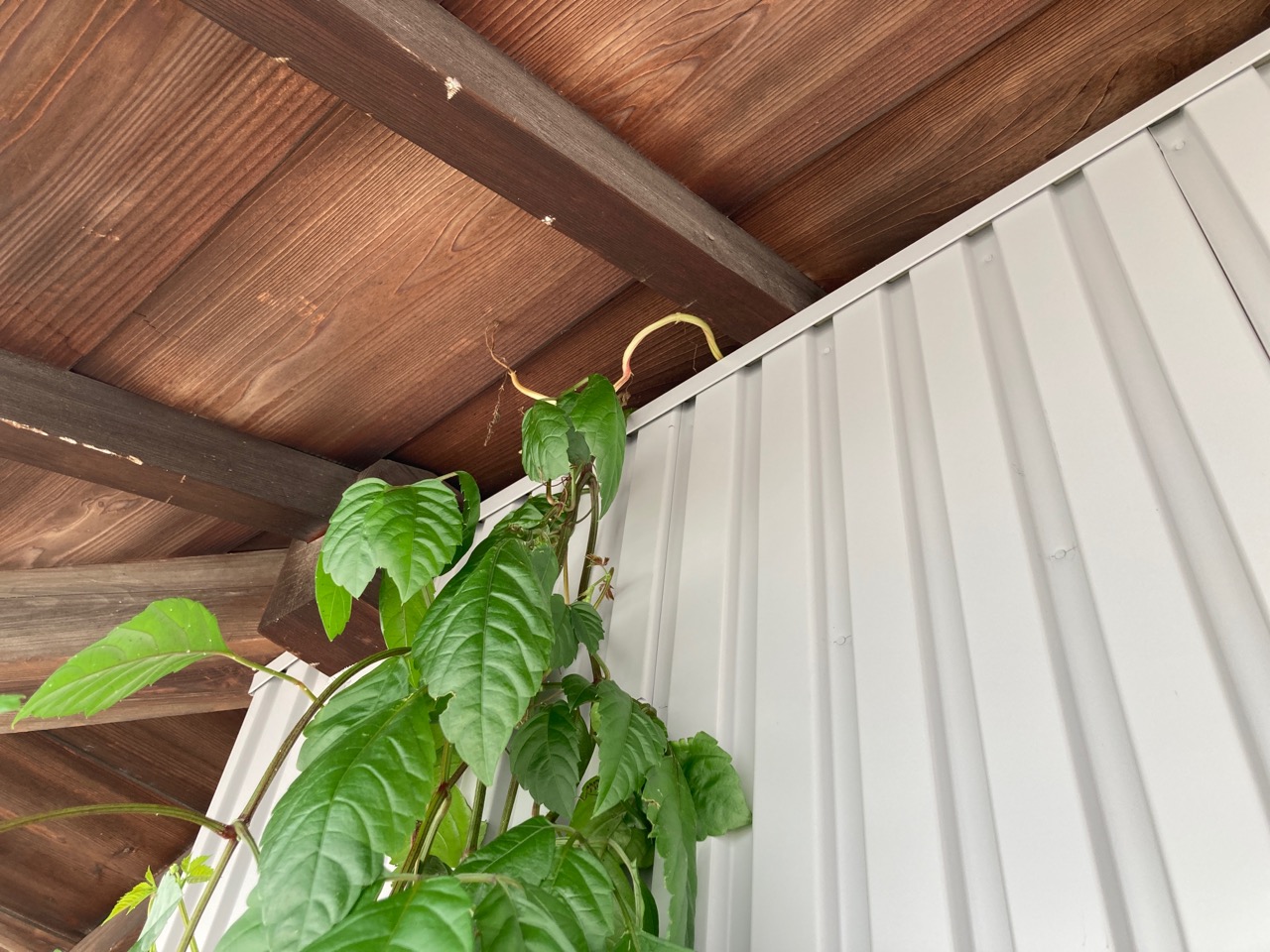外壁と屋根の隙間のあたりに緑のアクセントが…と思いきやこれは意図したものではありません。どうやら垂木の間からドクダミのような匂いのする雑草が生えている模様です。昨年古い外壁を剥がして下地工事を行っている時に土壁に雑草の種がついたのではないかと思われます。ここまで育ったところ悪いのですが速やかに除草を行いました。