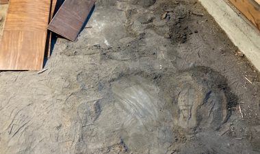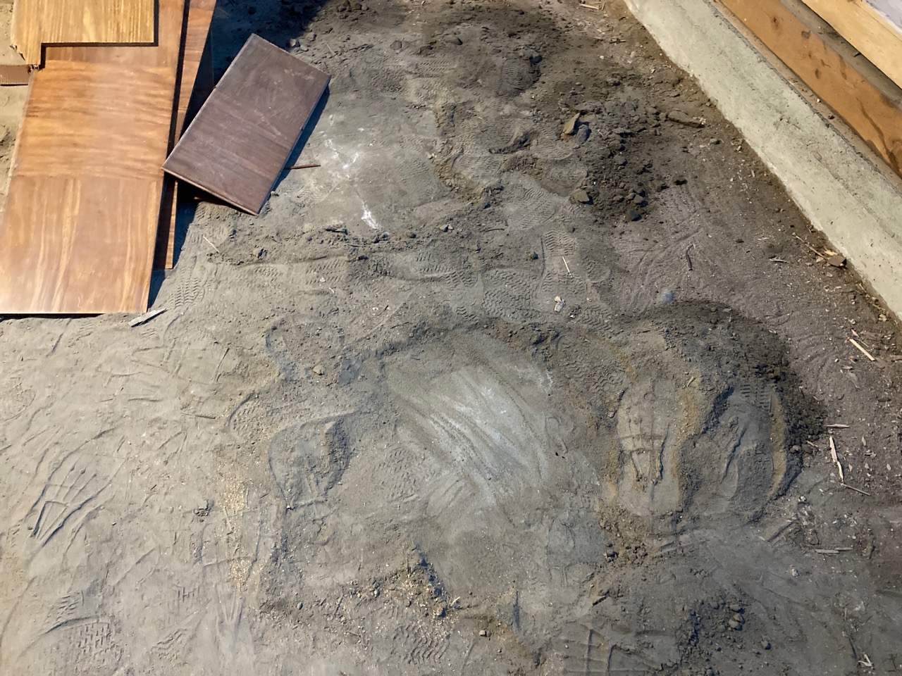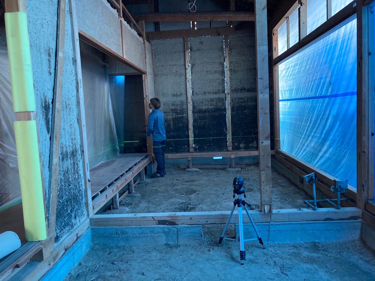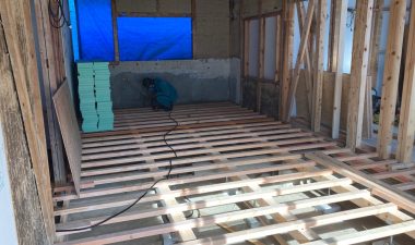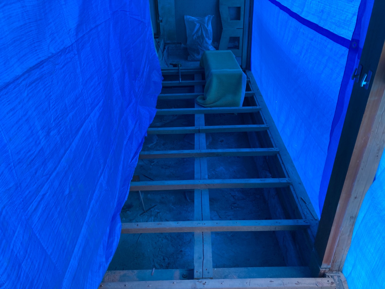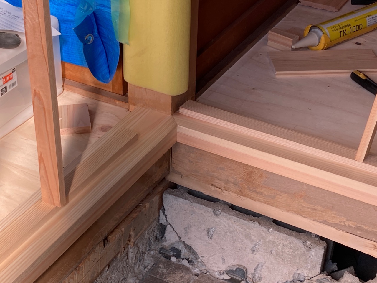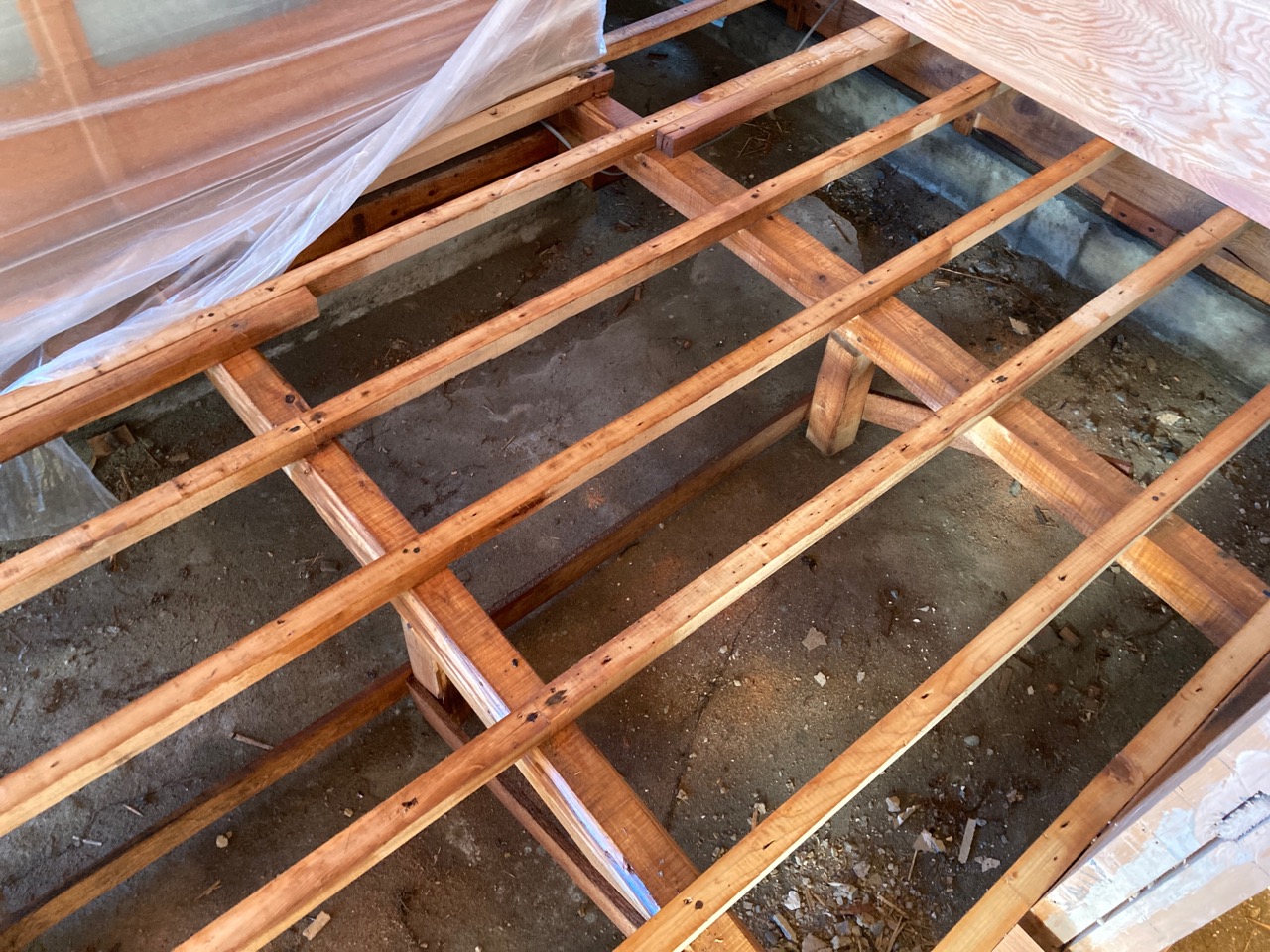今回は既存の犬走が無い部分は束石を据える石場建てとしましたので床束の水平垂直を出すのに思いの外難儀しました。無事に大引まで据える事ができましたのであとはただひたすら床板を固定していくのみです。