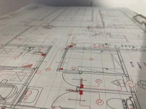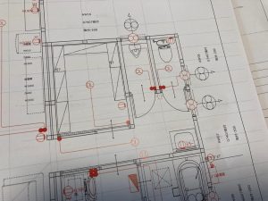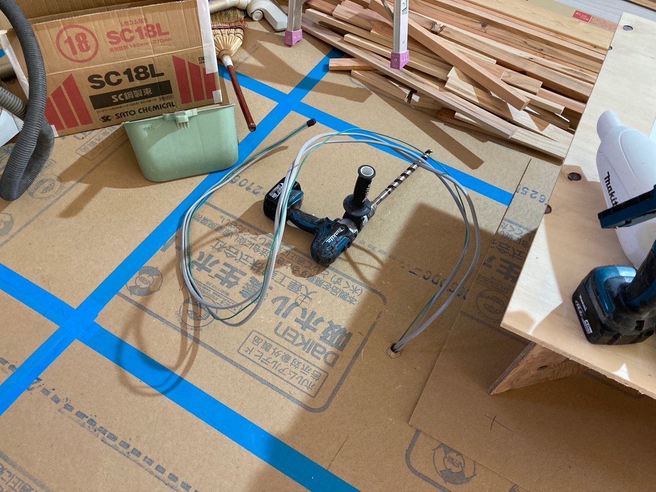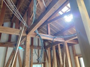 先日打合せた電気配線図に基づき、配線工事が始まりました。筆者も建築の仕事をしているものの、電気や水道設備のマニアックな部分の知識については素人同然です。電圧がどうとか電気抵抗がどうとか、餅は餅屋にお任せしています。内装の部分でスイッチやコンセントの配置、照明計画については注視したいところですが。