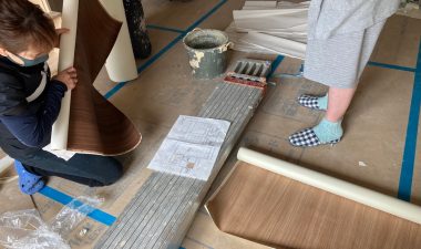 周辺をバッチリ養生して、いざローラー塗装開始。塗り始めてみると、想像していたよりもシックな濃い色になっていきます。一部に使用したフローリングにも似た、ウォルナットとも呼ぶべきカラーです。