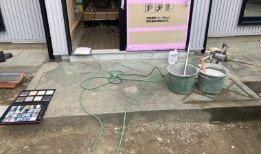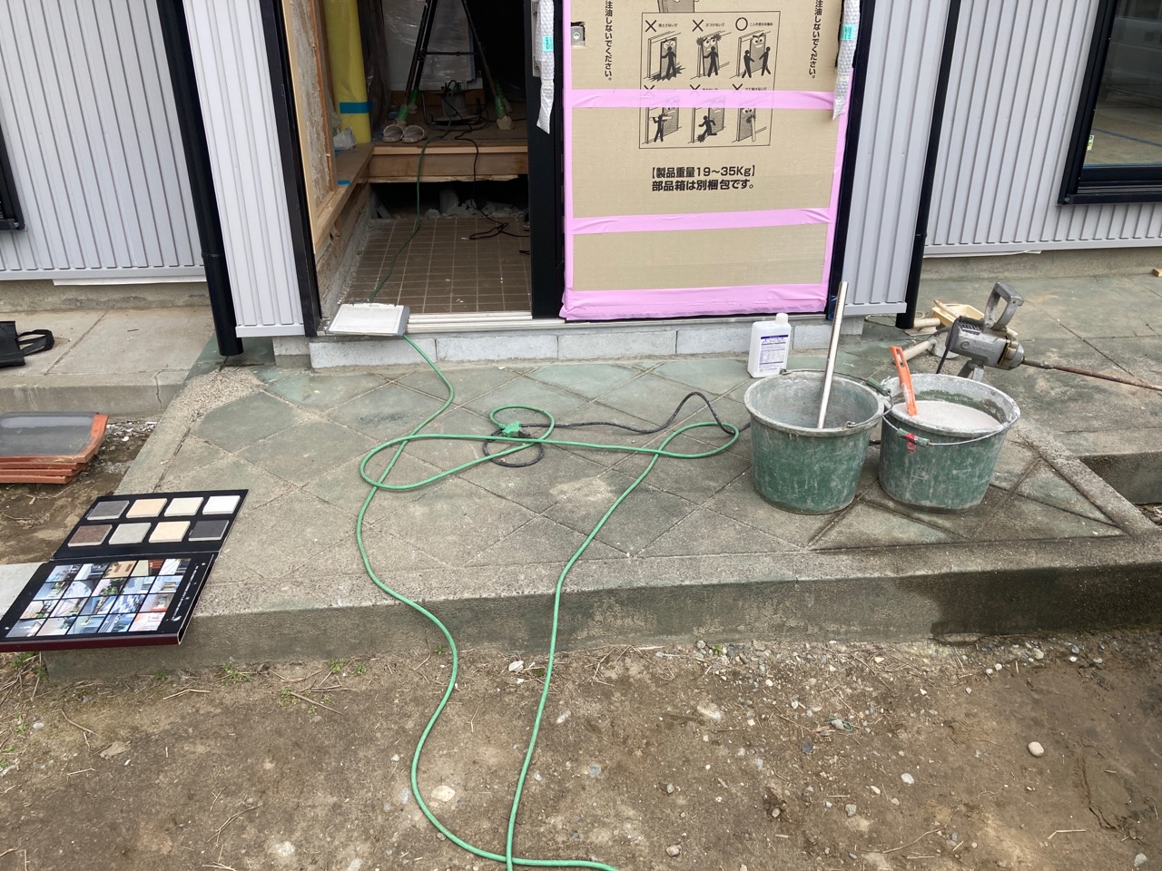 玄関へ至るアプローチは前日に打設しておいていますのですでに上に載って歩けるような状態です。コンクリートは4週間で所定の強度を発揮すると言われていますが、人間が上を歩くくらいならば翌日には大丈夫です。