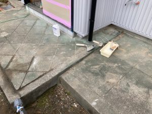 外構工事がスタート。道路から玄関への微妙な高低差をどのように処理するか、これが意外と難しいのです。