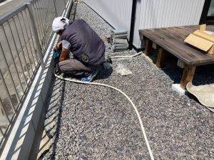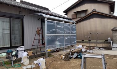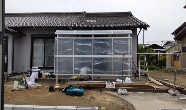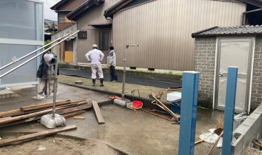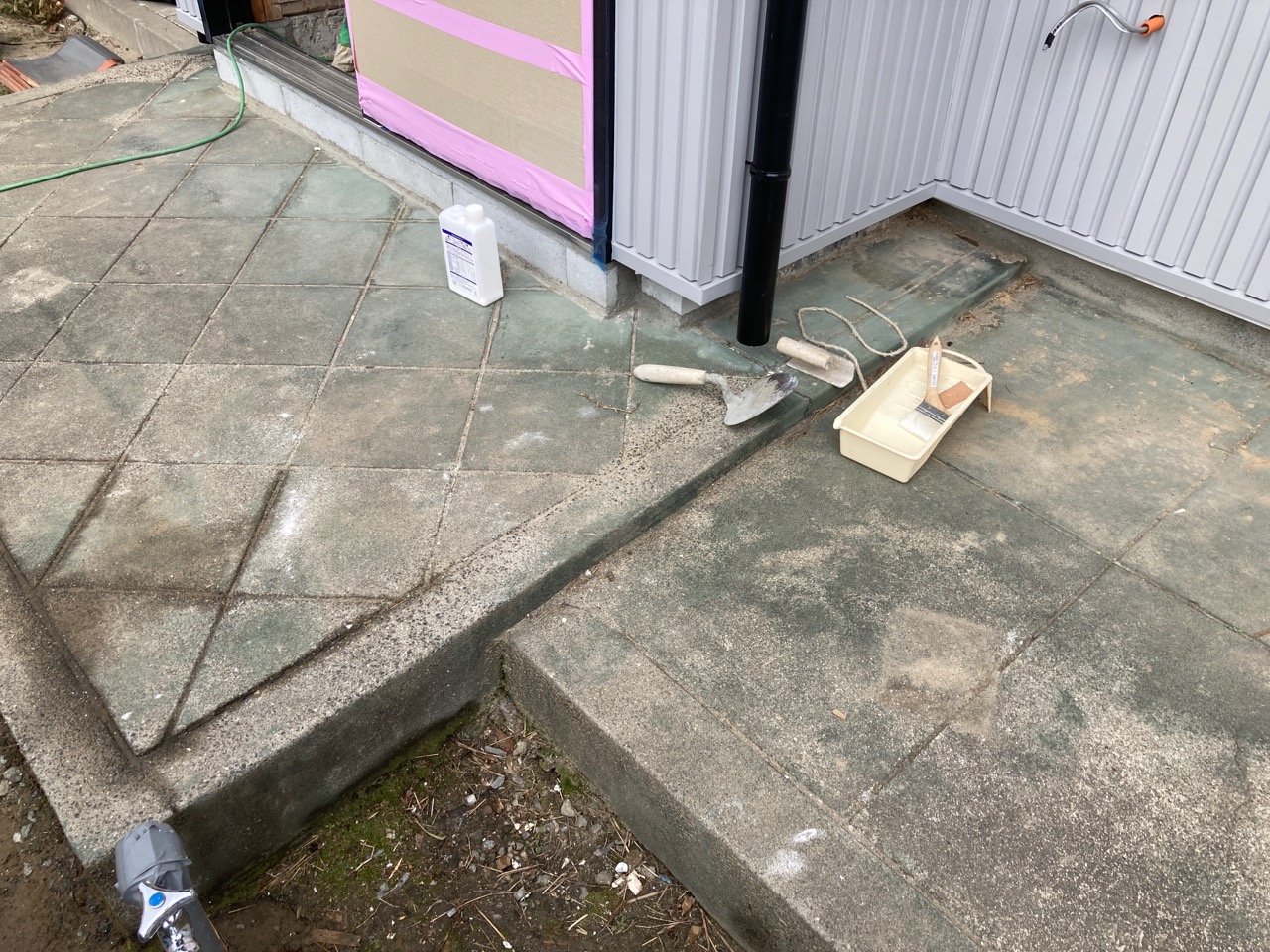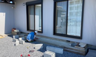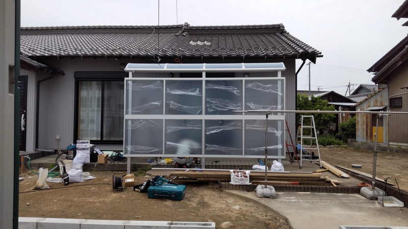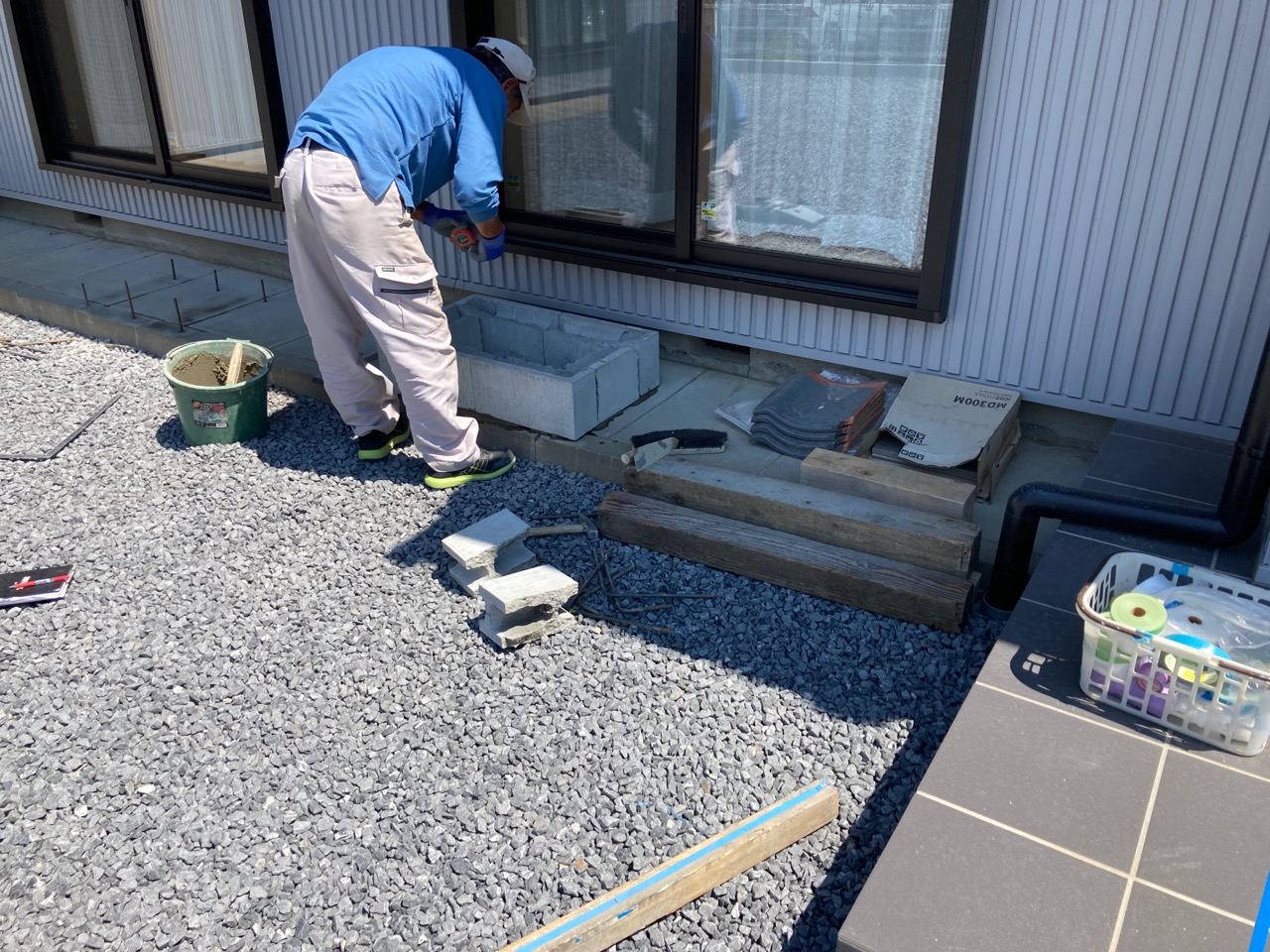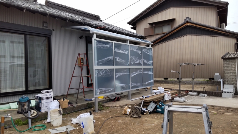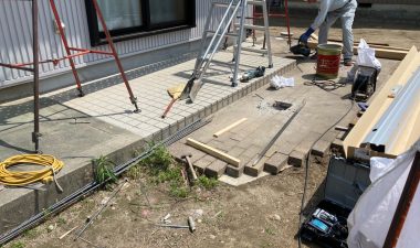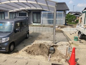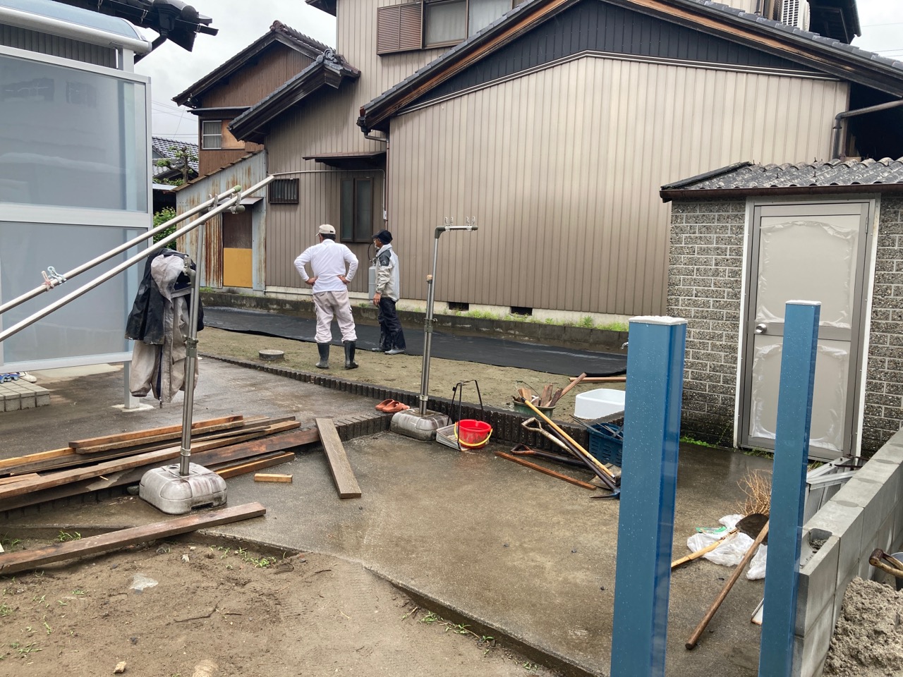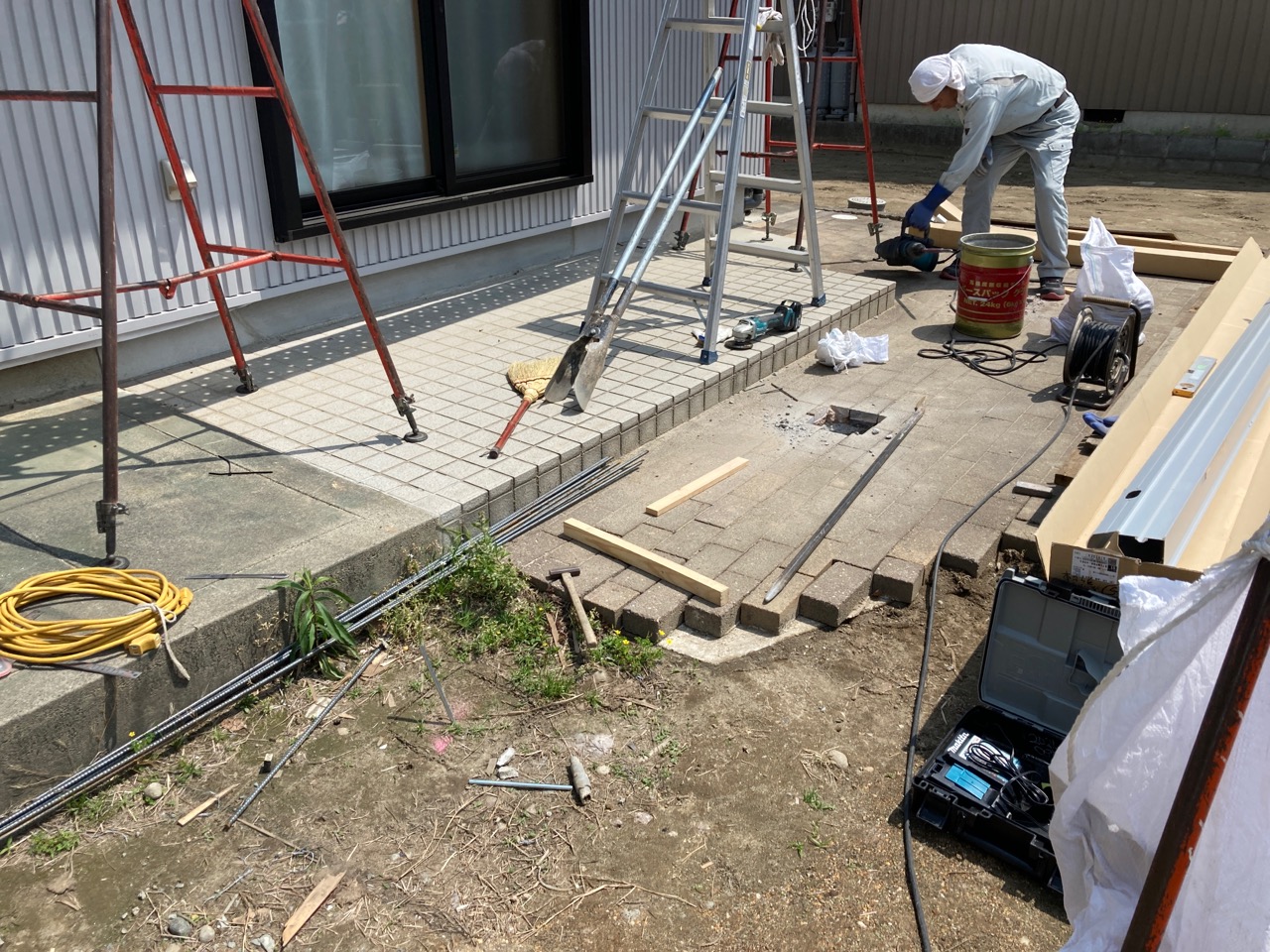 洗濯室の前に物干アルミテラスを建てる工事です。アルミ支柱を埋め込み施工するために既存のインターロッキングを一部切除、コンクリート下地を打ち抜くのに少し苦労します。