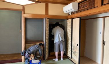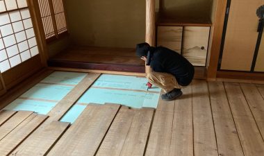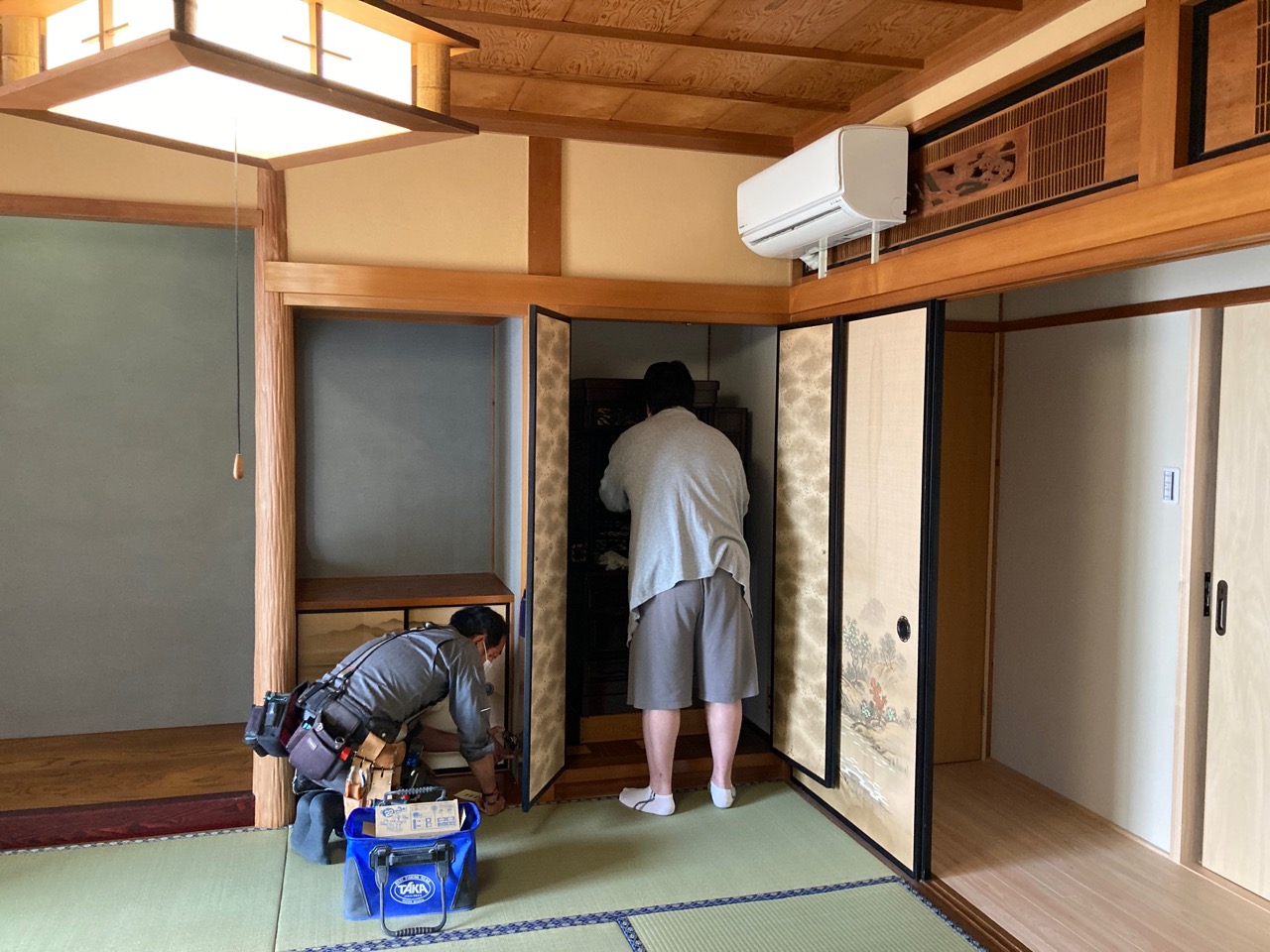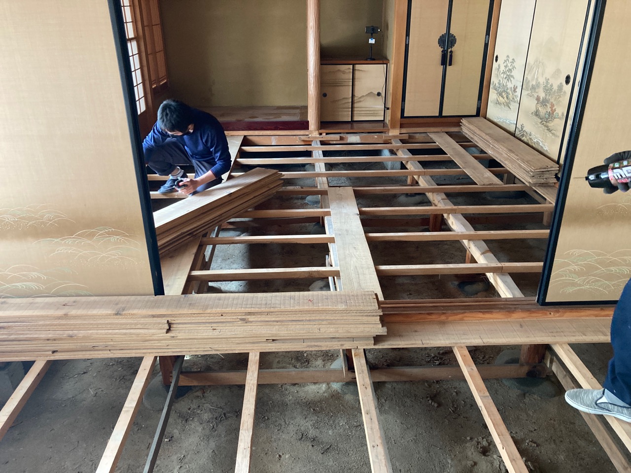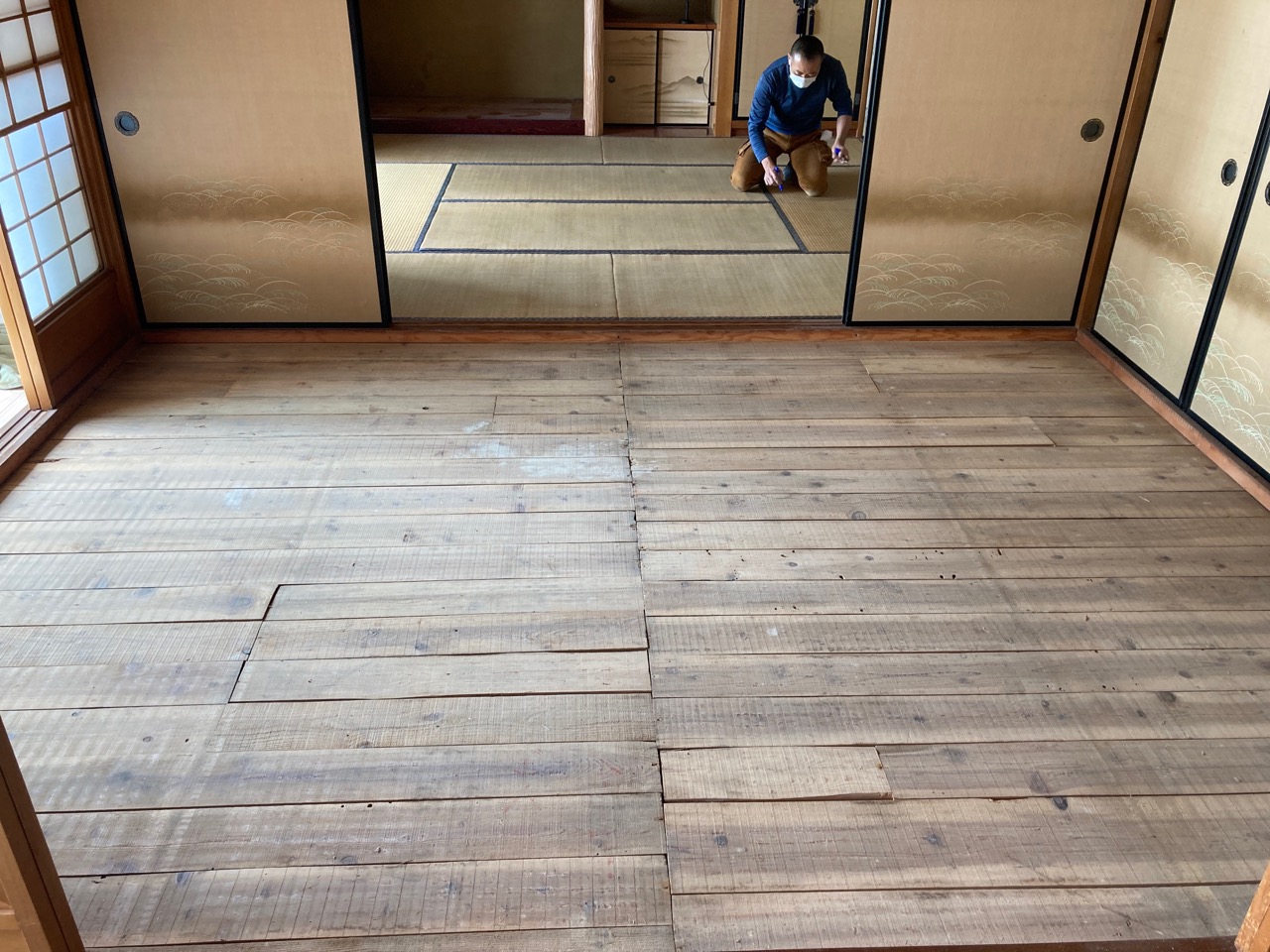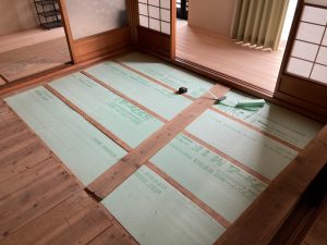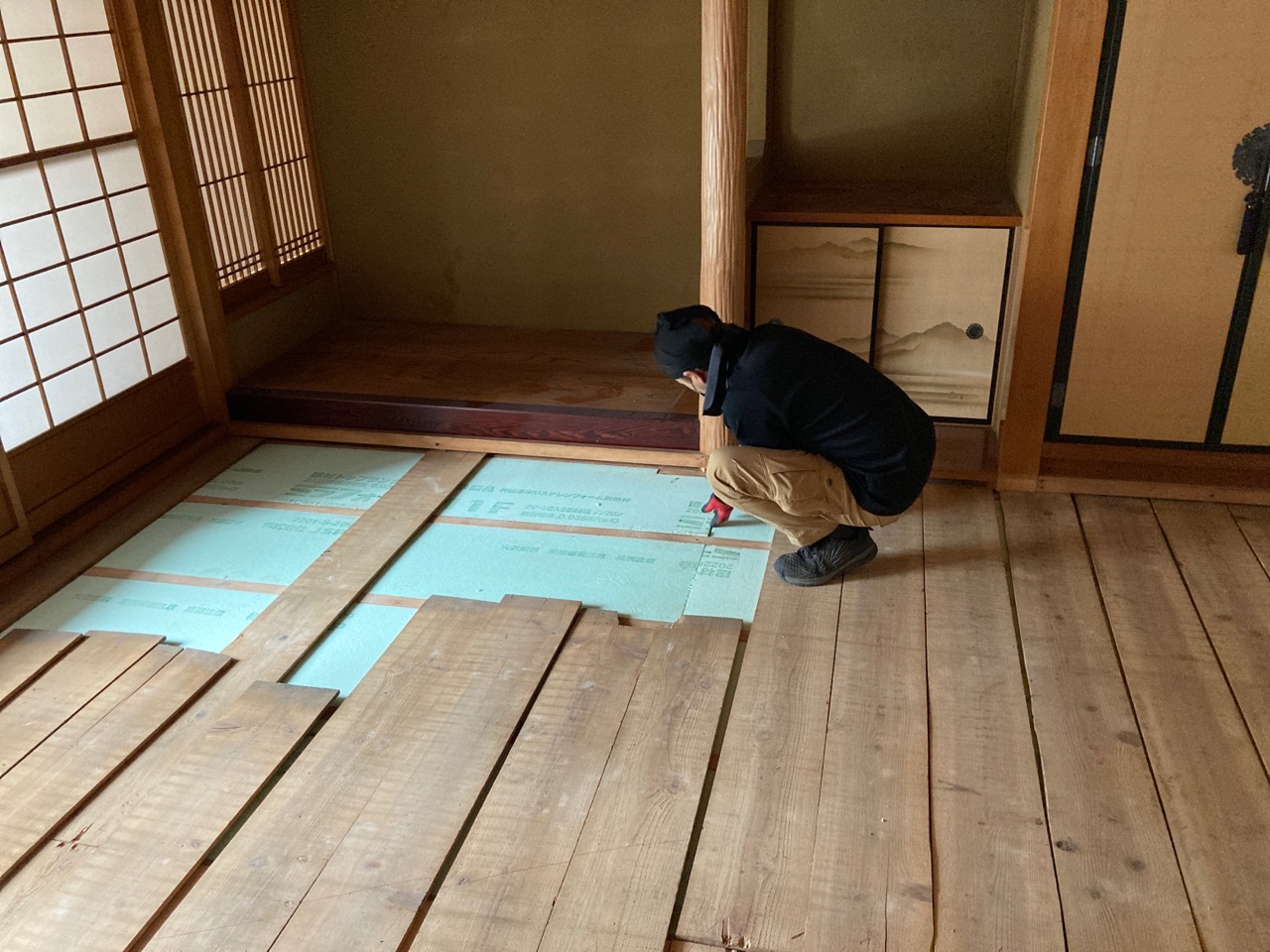 座敷には今まで家財道具が満載に保管されていましたので、空になった今、床板をめくり断熱材を敷設していきます。床の間や仏間は床をめくるわけにはいきませんので、手前から床下へ潜っての敷設になります。