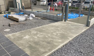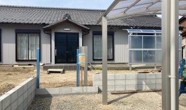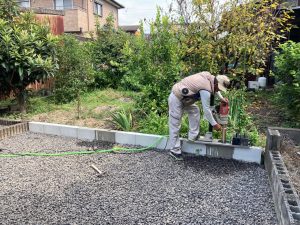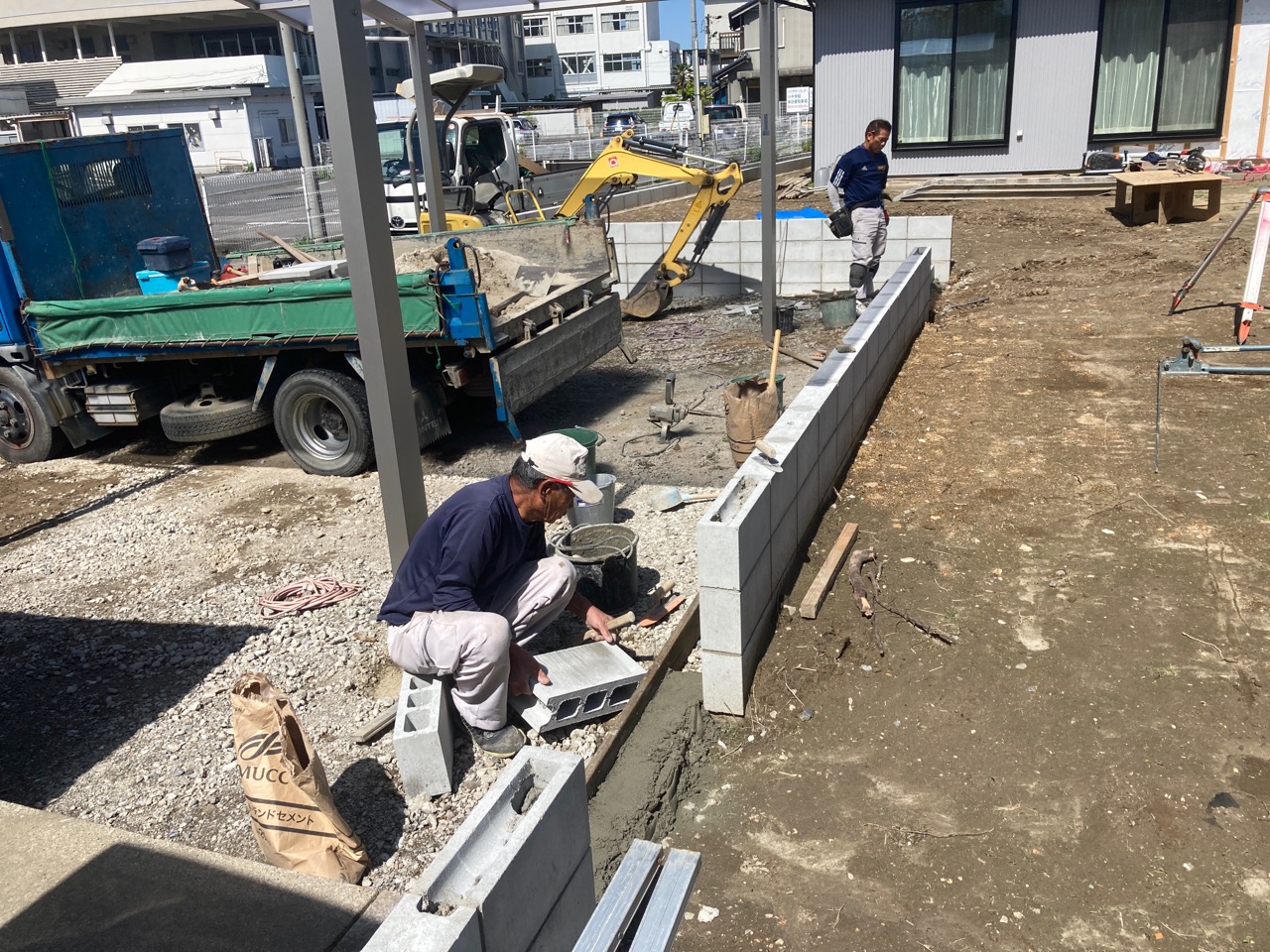 ガレージ部分も庭との境にブロック積とアルミフェンス施工。i様も詳細なお打ち合わせに参加し、イメージを膨らませています。
