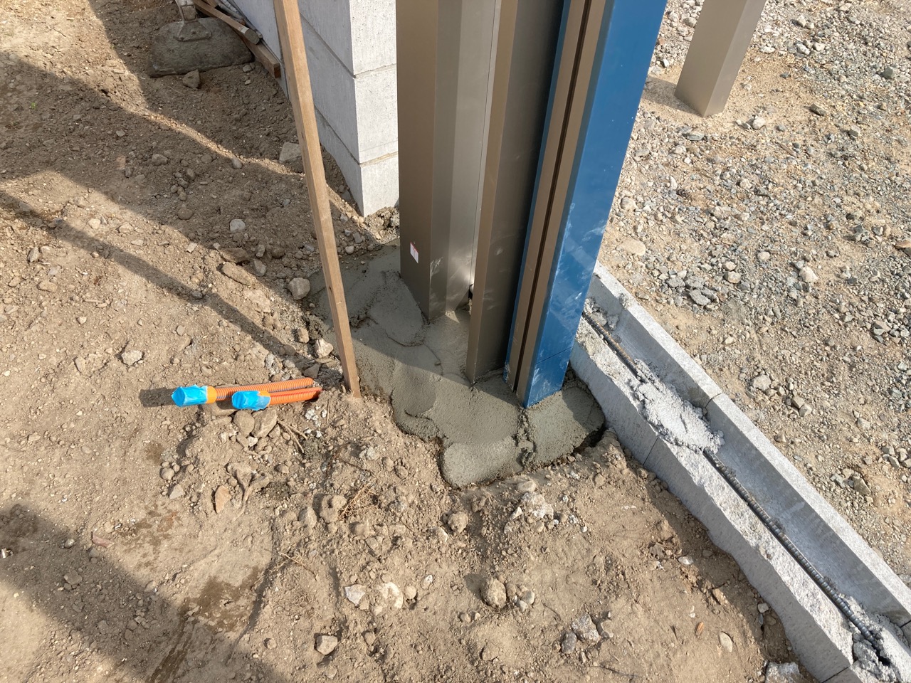 連休も終わり、車庫まわり、門まわりのアルミエクステリア工事が進んでいます。門扉やフェンス本体はその他の作業中にキズをつけてもいけないので、敷地の砂利敷き仕上、車庫の土間仕上など終わってから一番最後に取付けられる予定です。