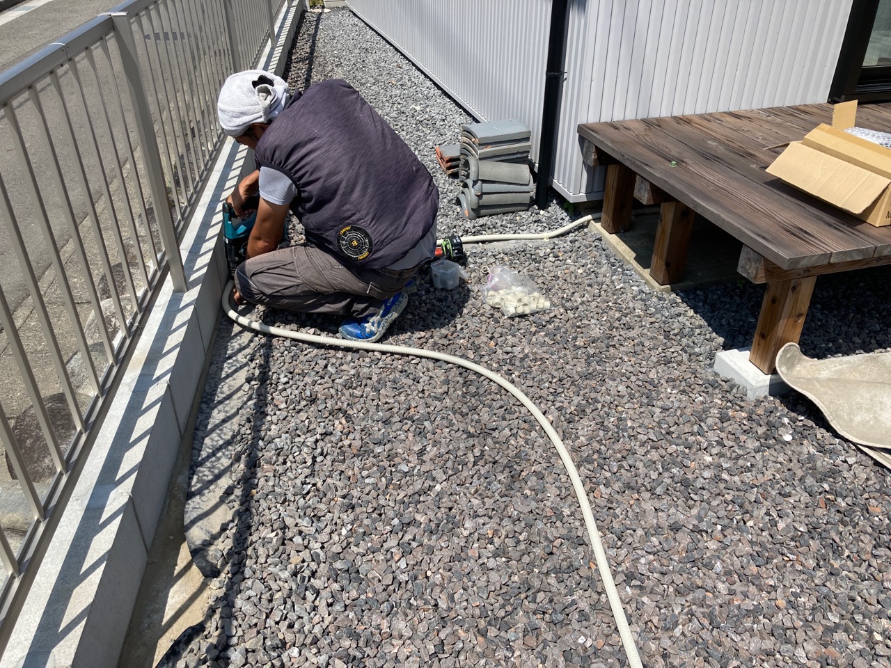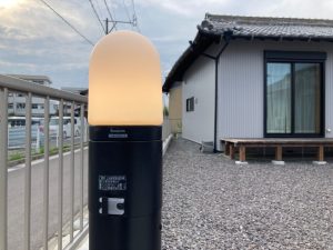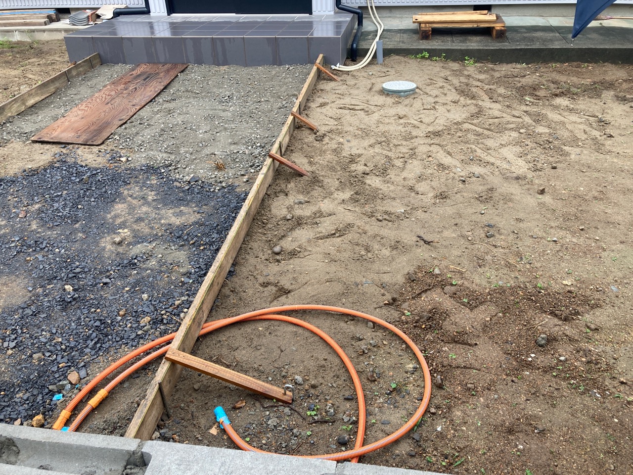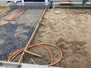 本日は最後の追加工事、エクステリアライトの設置にやってきました。すでに出来上がっている外部電源から電線を分岐して設置。器具の場所まで配管の中を通し、配管事埋設していきます。