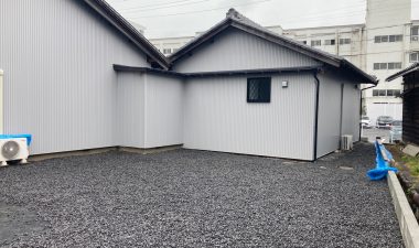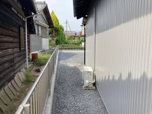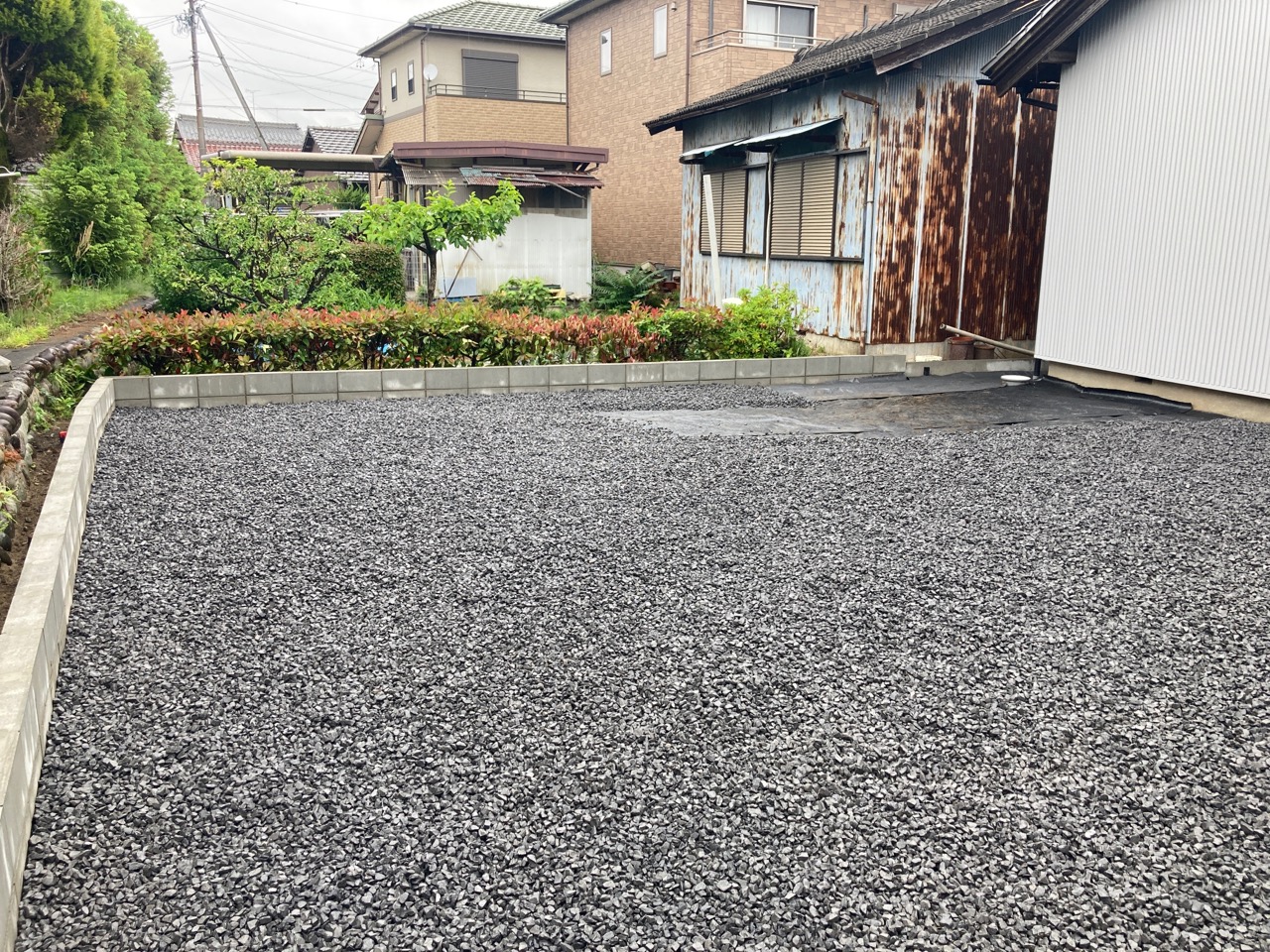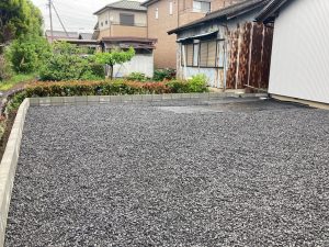 裏庭の整地、表層砂利敷き工事が終わりました。以前の荒野のような状況から一変し、地面の凹凸も綺麗に均されています。砂利の下には雑草の成長を防止する防草シートも敷かれました。かねてより懸案であった水はけの悪さを解消するために敷地の周囲には暗渠が埋設されています。